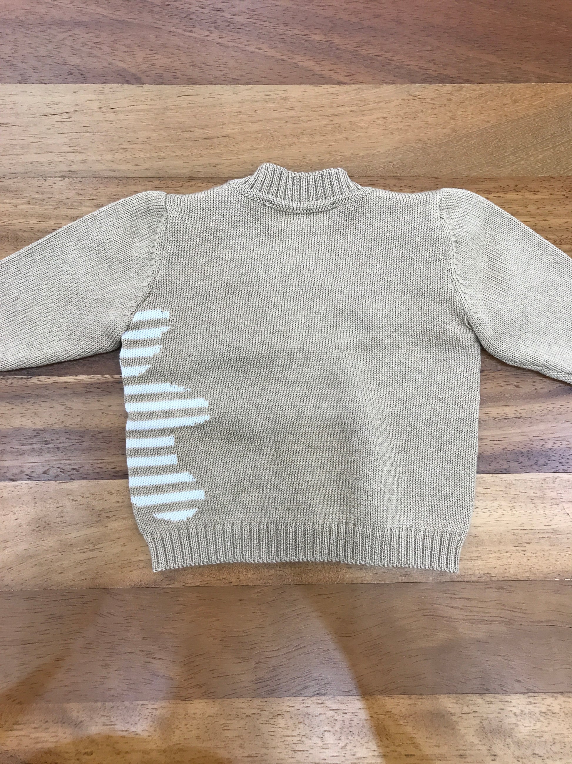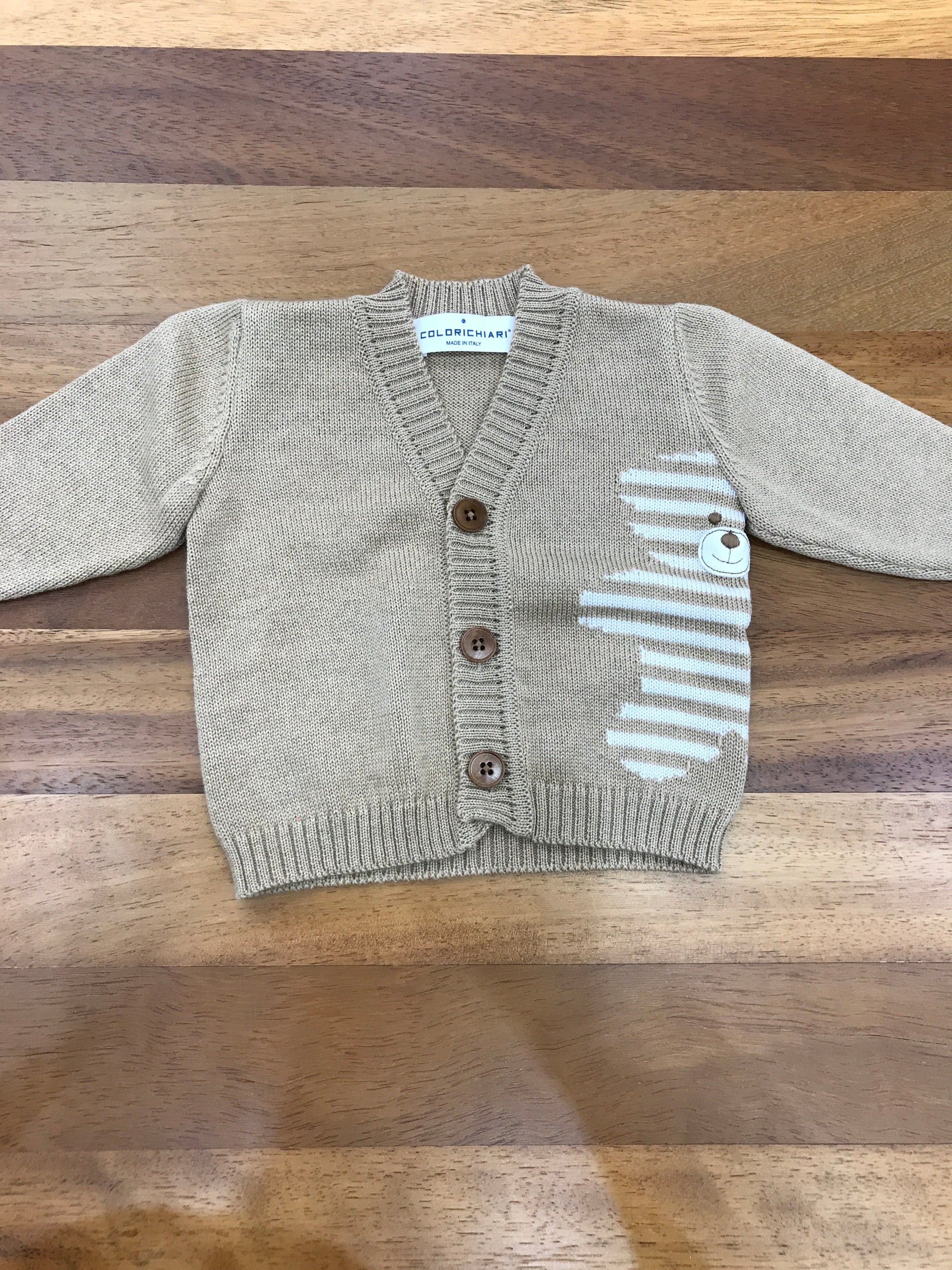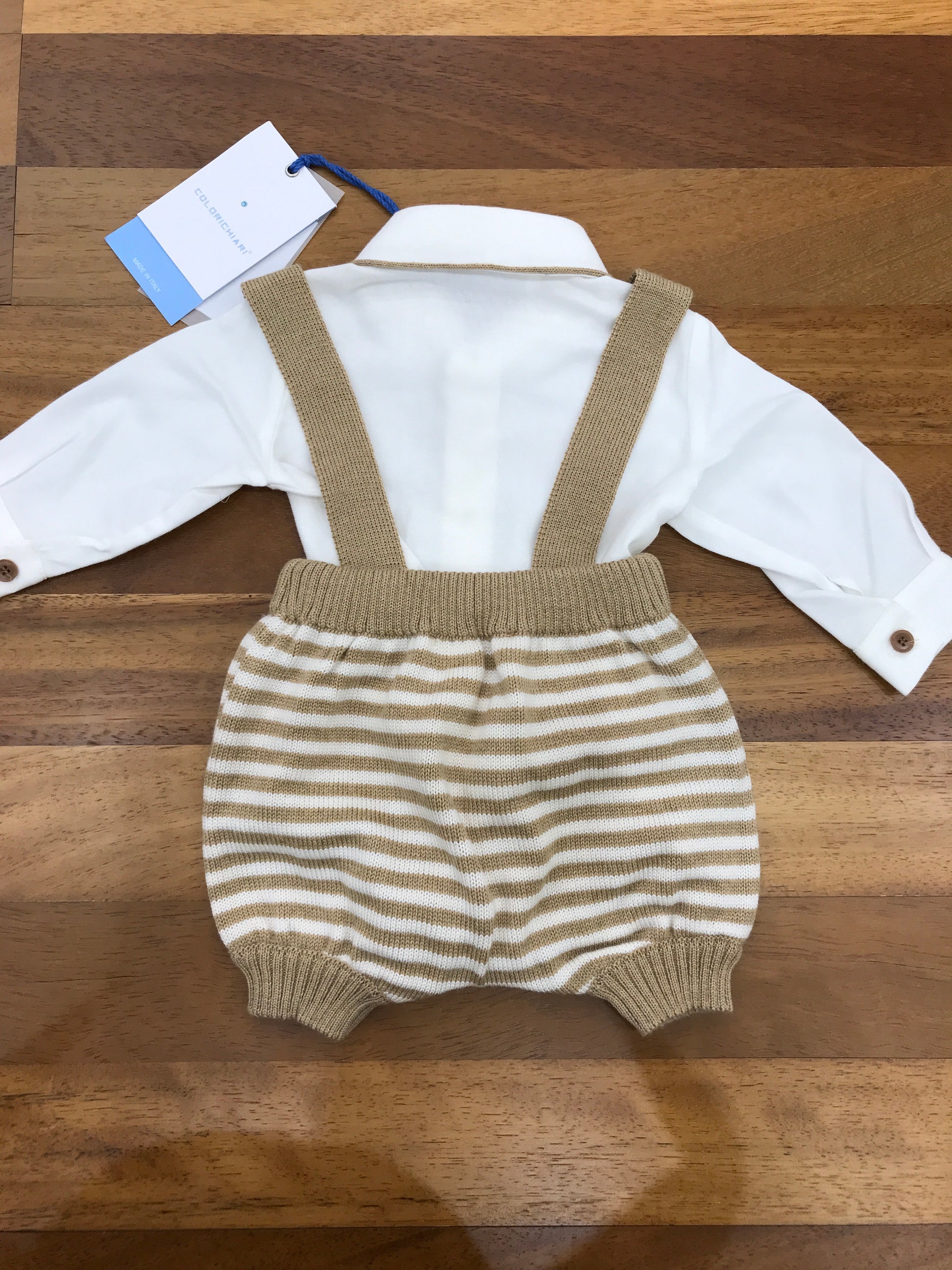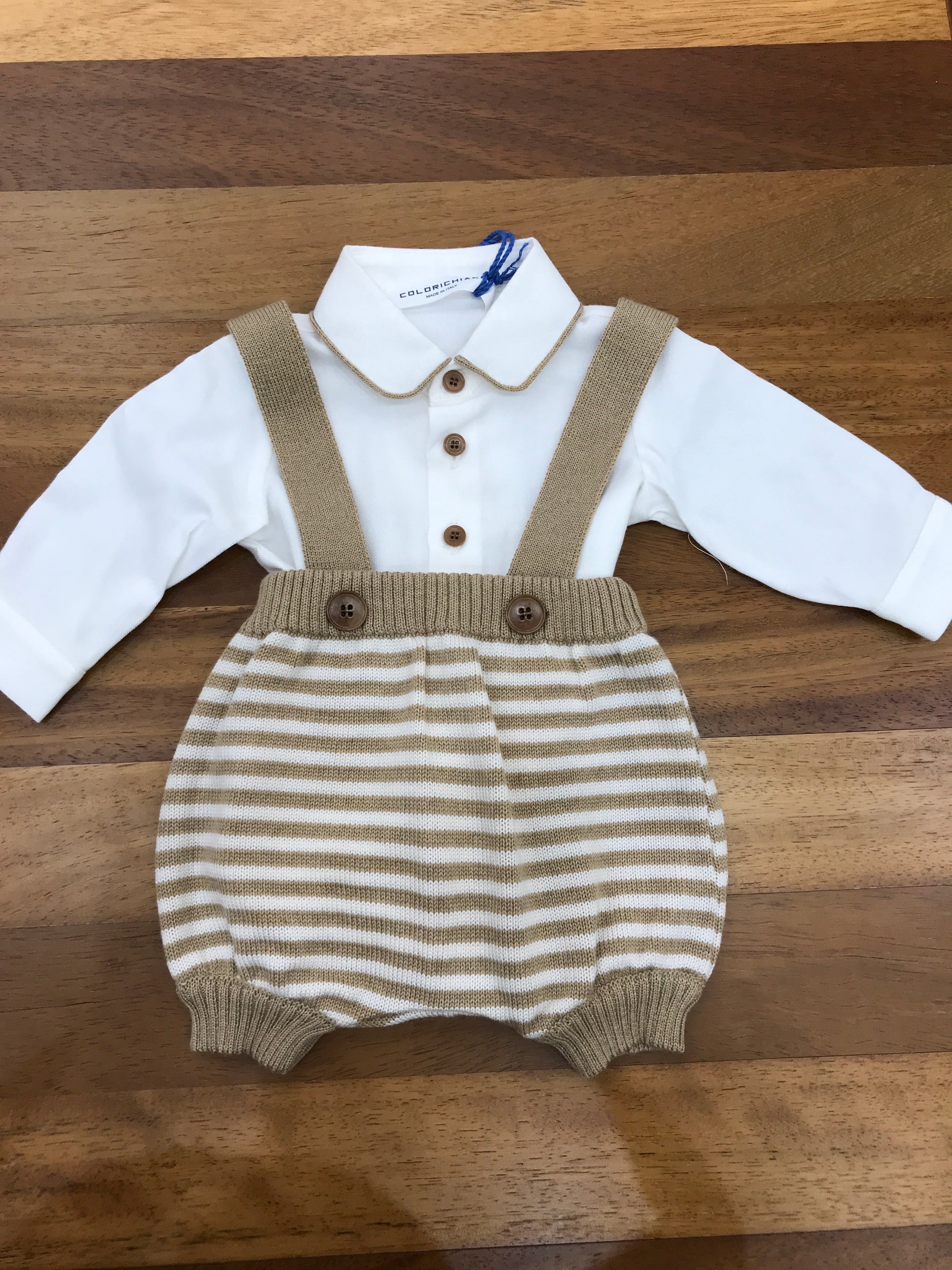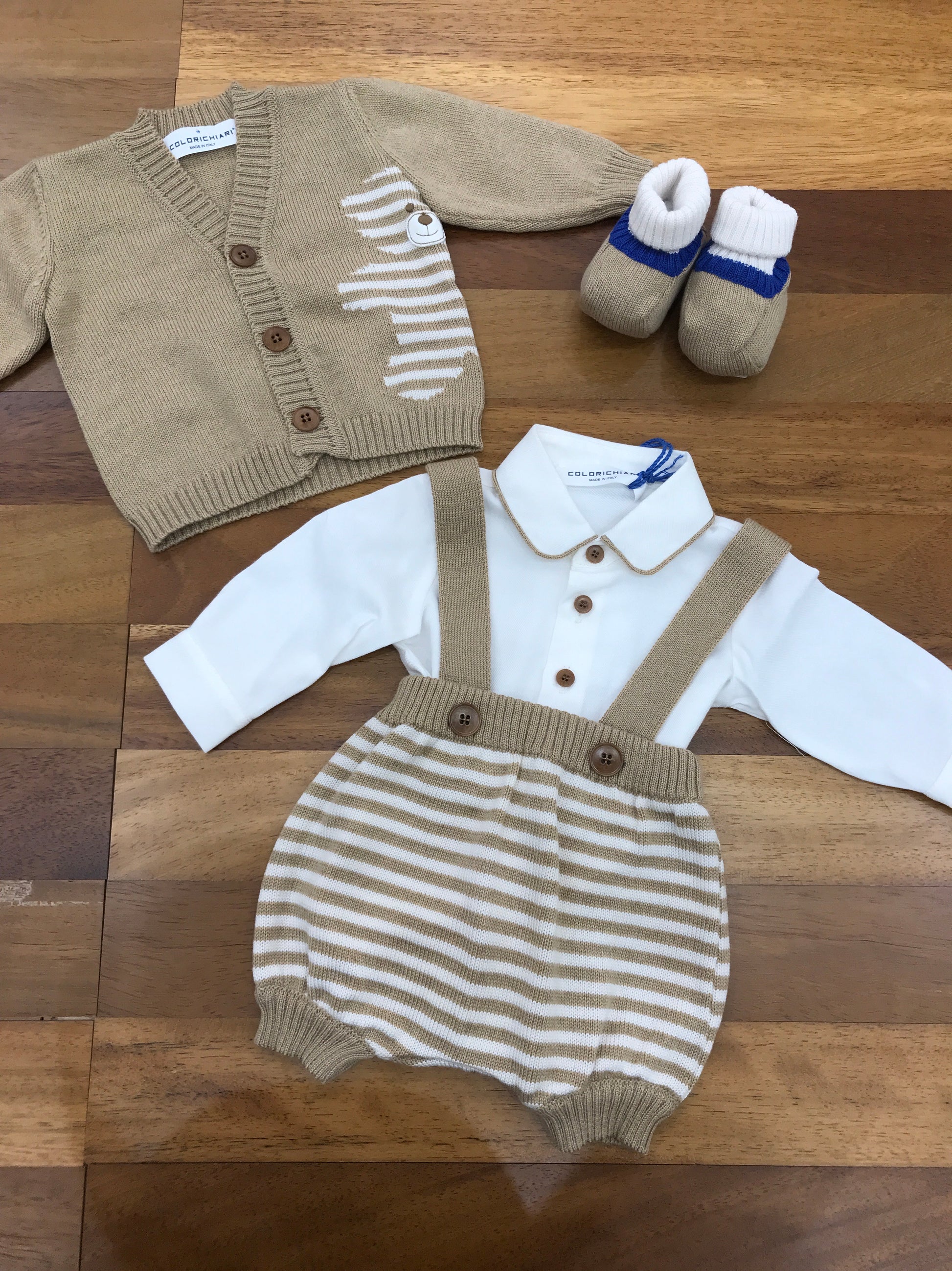 Set in lana composto da tre pezzi: pagliaccetto a righe, cardigan con motivo a orsacchiotto a righe e body dal design camicia.