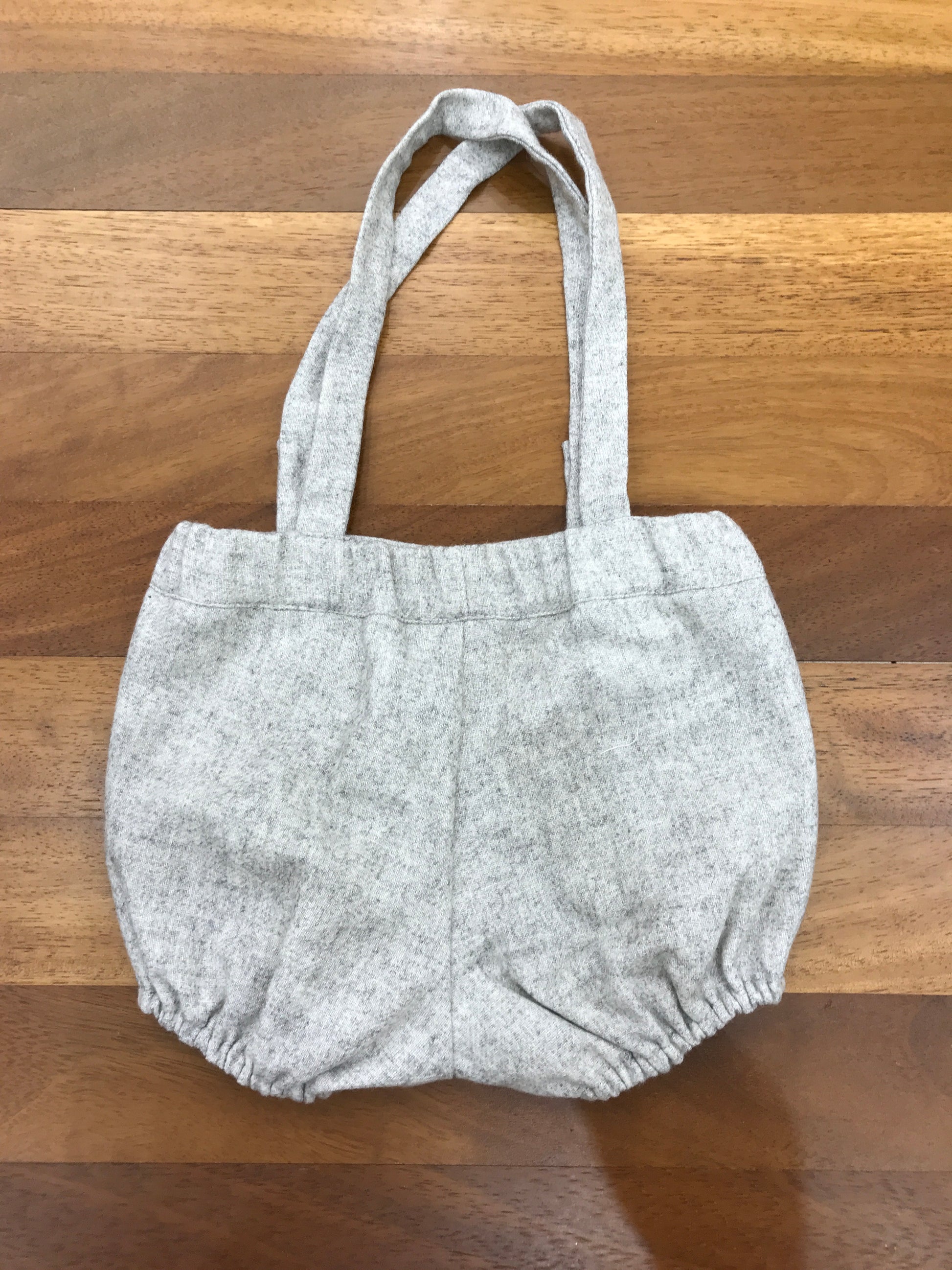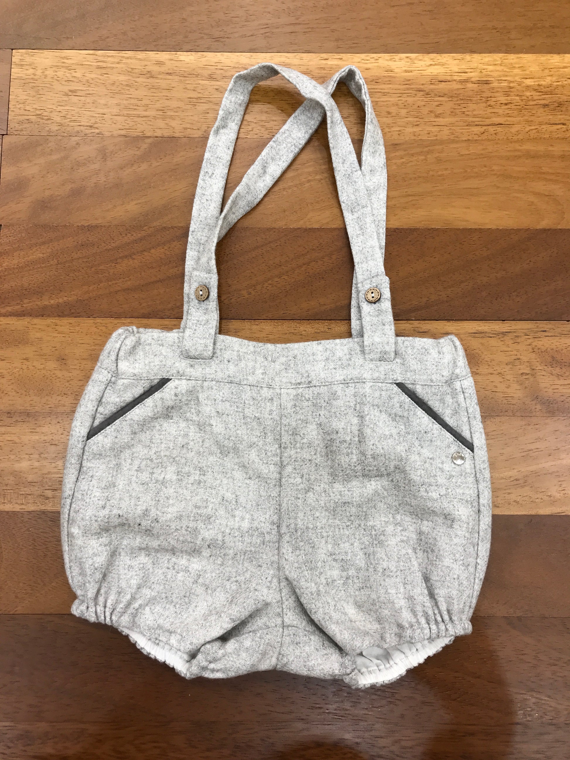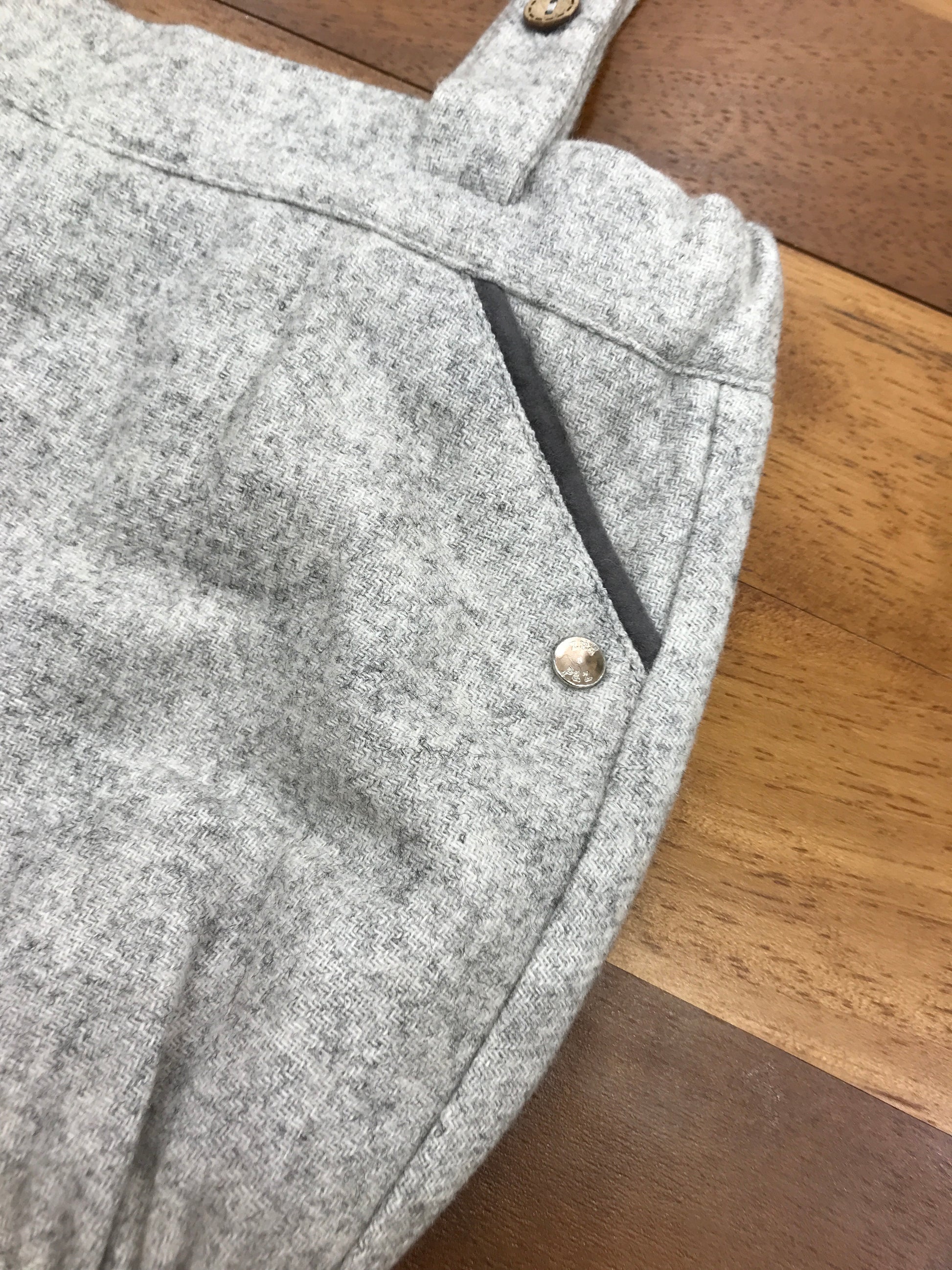 Salopette in panno grigio chiaro, dotata di bretelle e arricchita da tasche finte bordate in velluto grigio scuro.