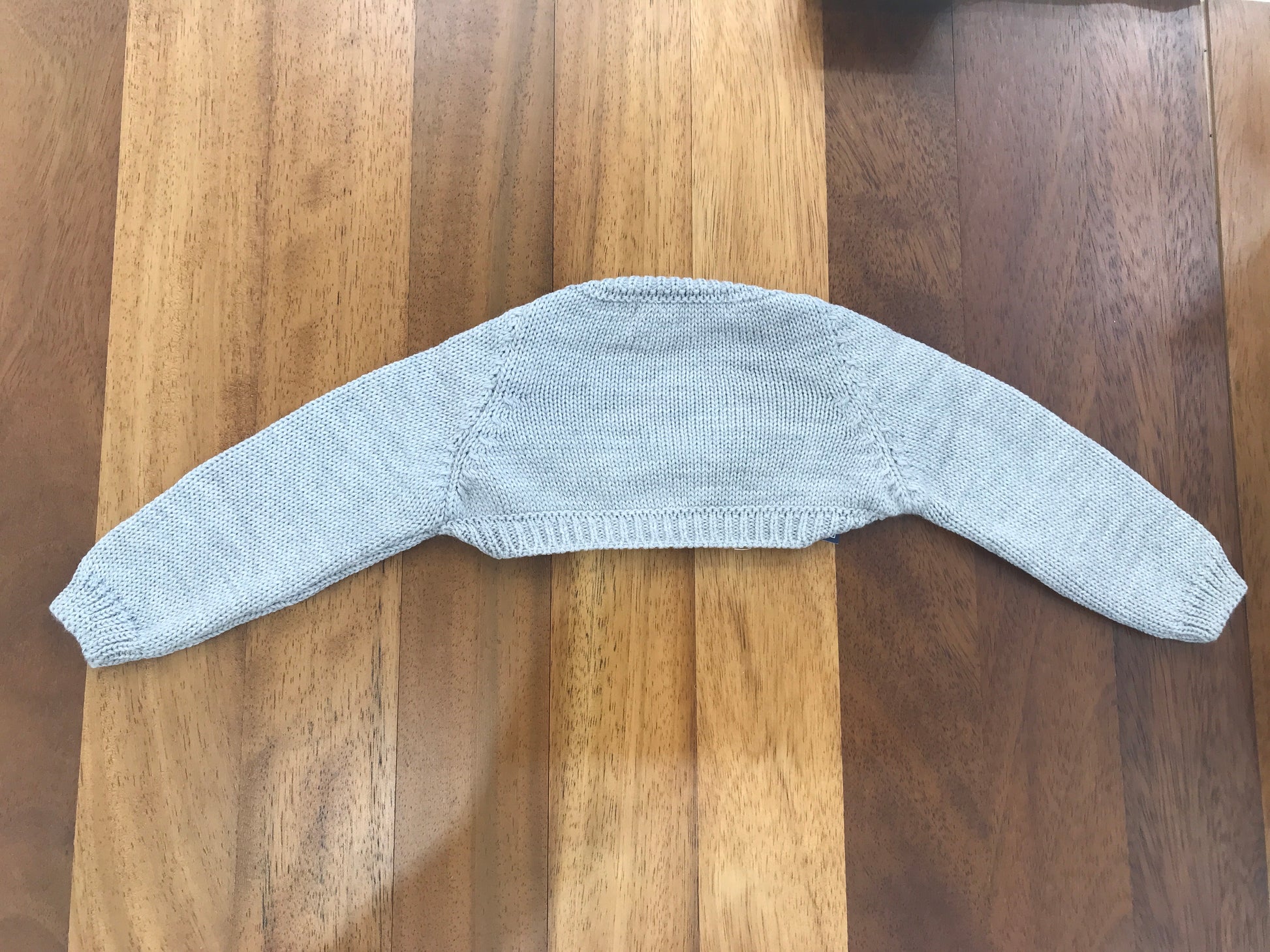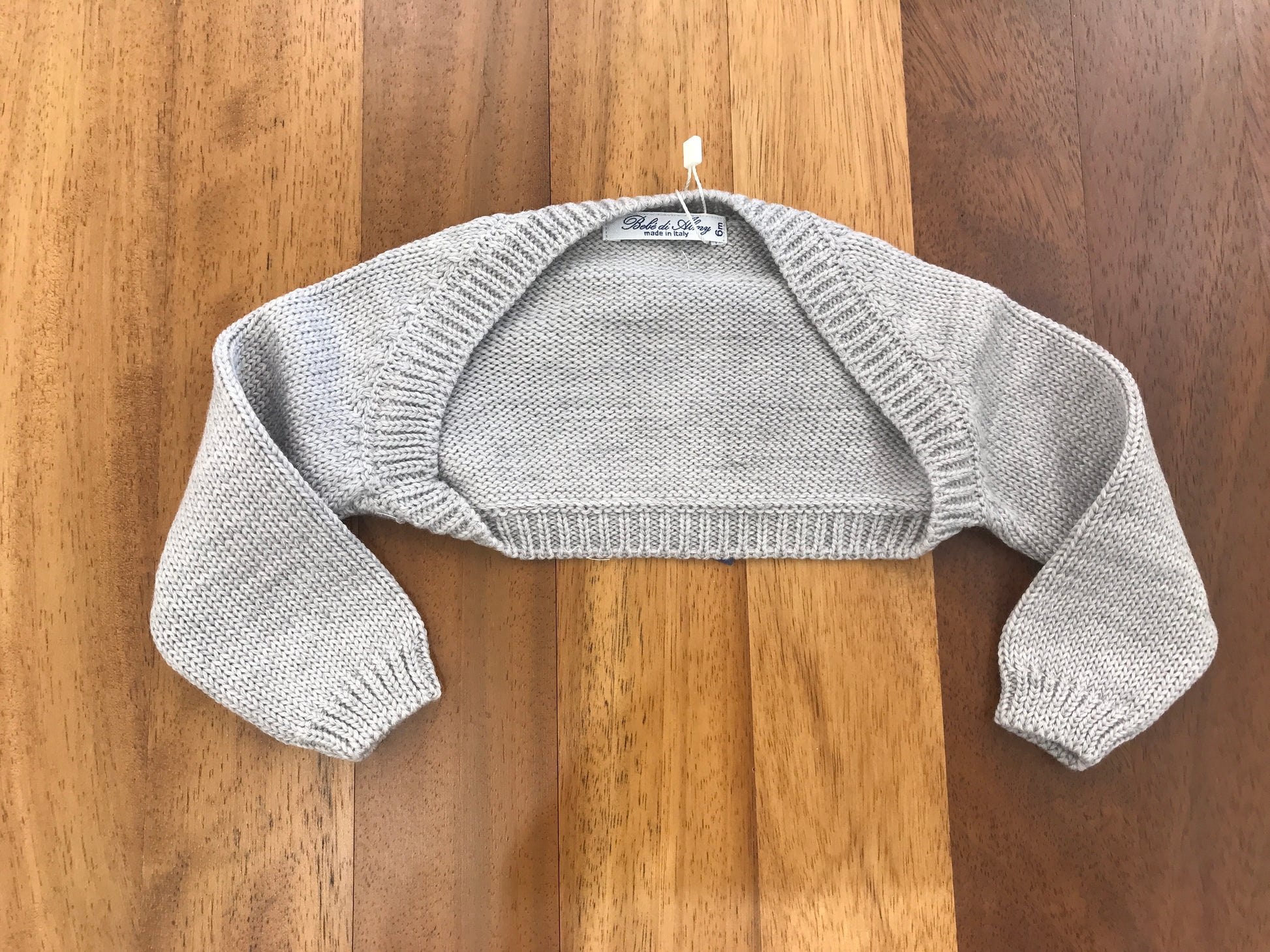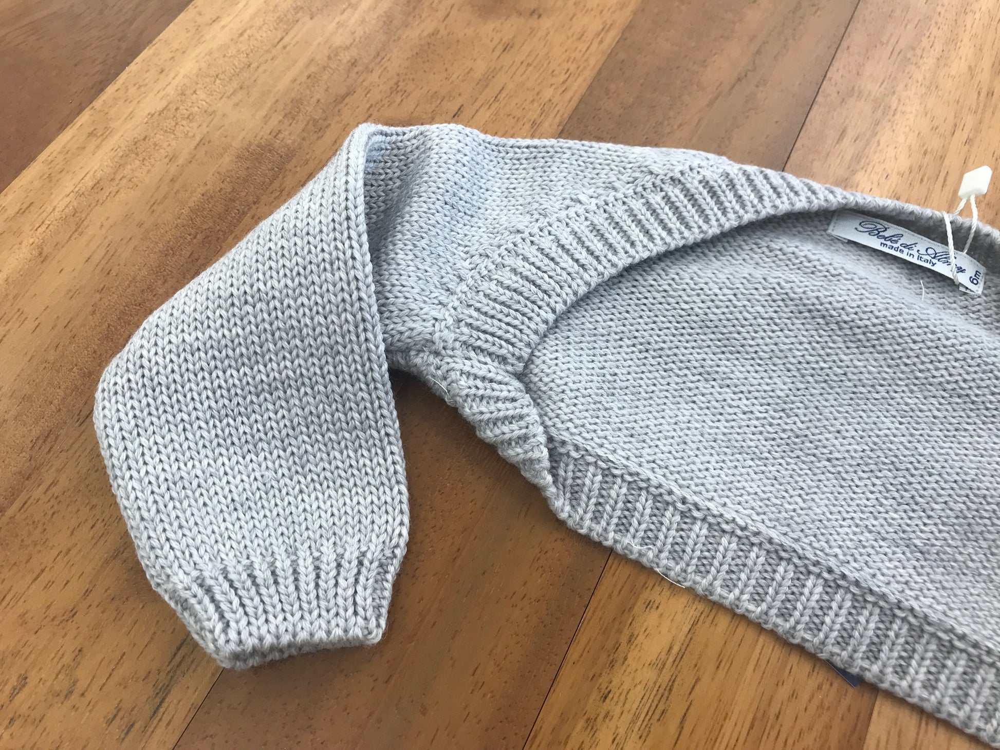 Scaldacuore in lana di colore grigio con design semplice e allungato, pensato per garantire comfort e calore al bebè in modo pratico ed efficace.