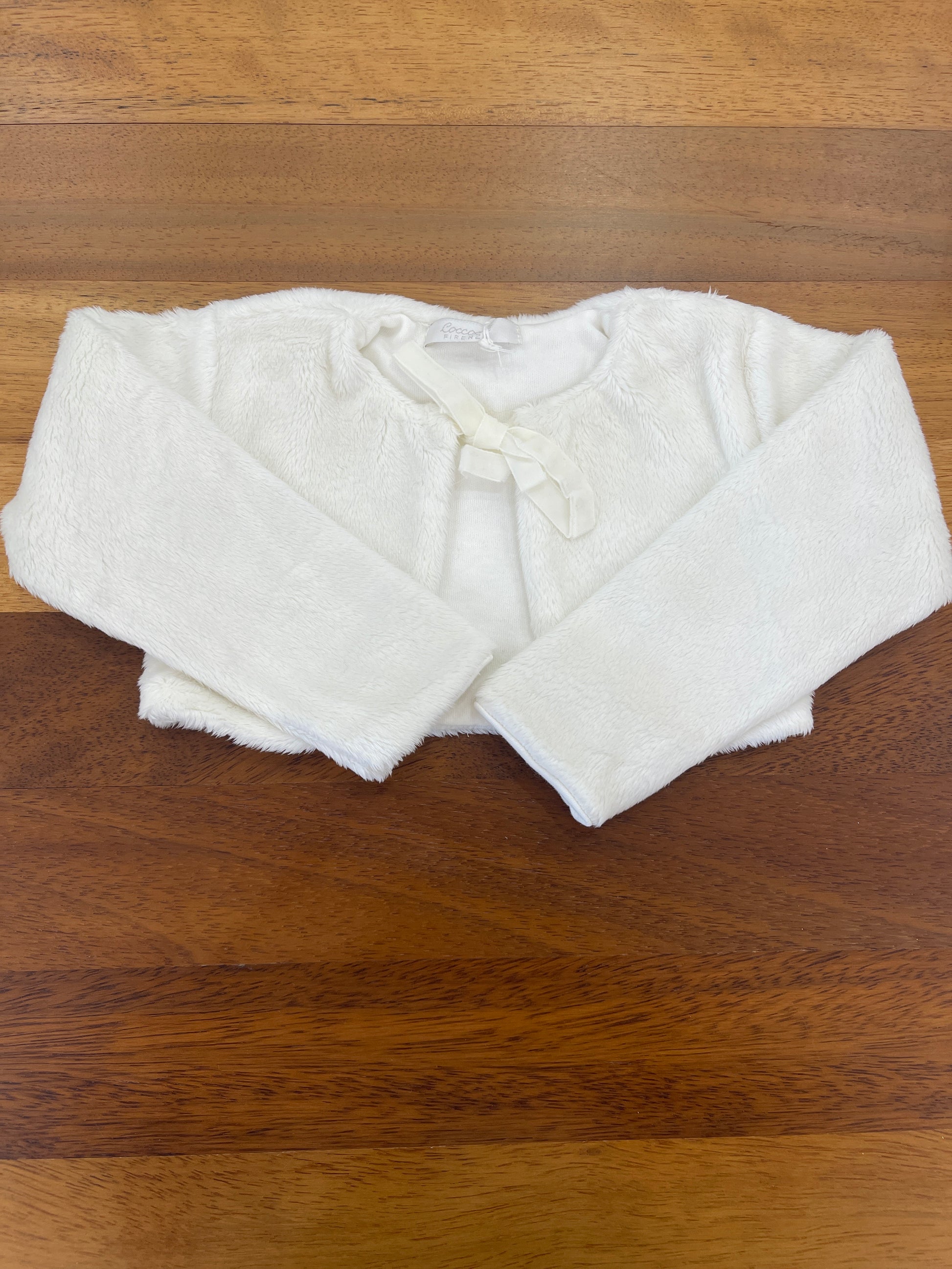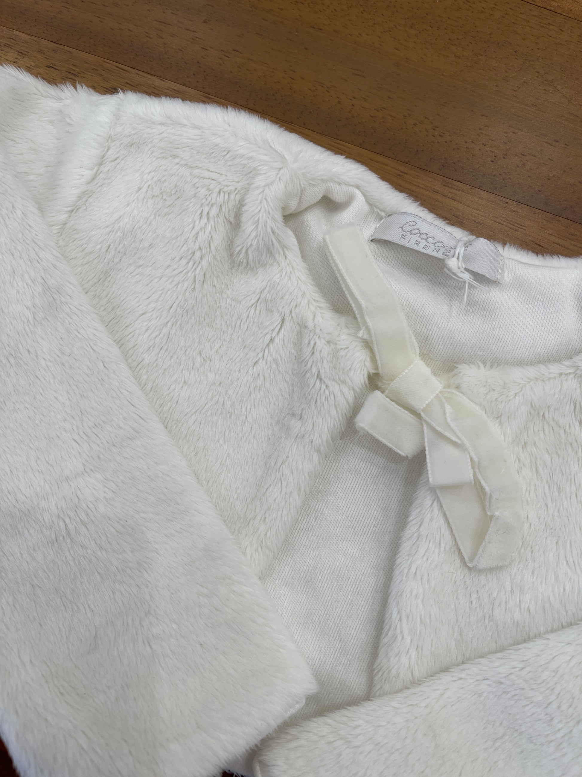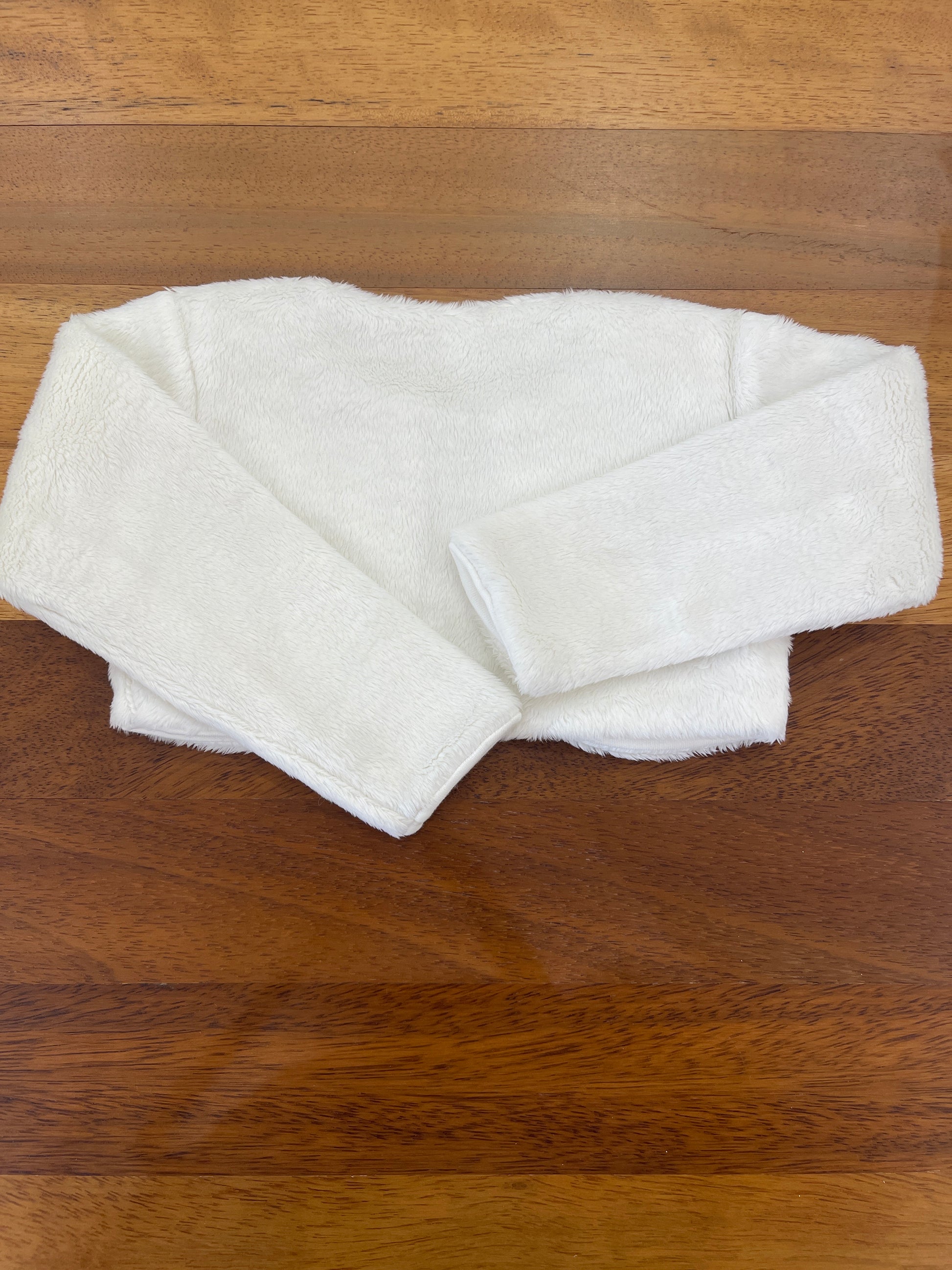 Scaldacuore realizzato in lana bianca particolarmente soffice e pellicciosa, progettato per garantire calore e comfort. Presenta una chiusura pratica e raffinata con un nastro che si lega a fiocco, assicurando una vestibilità sicura e un tocco di eleganza. Ideale per mantenere una temperatura piacevole con stile.