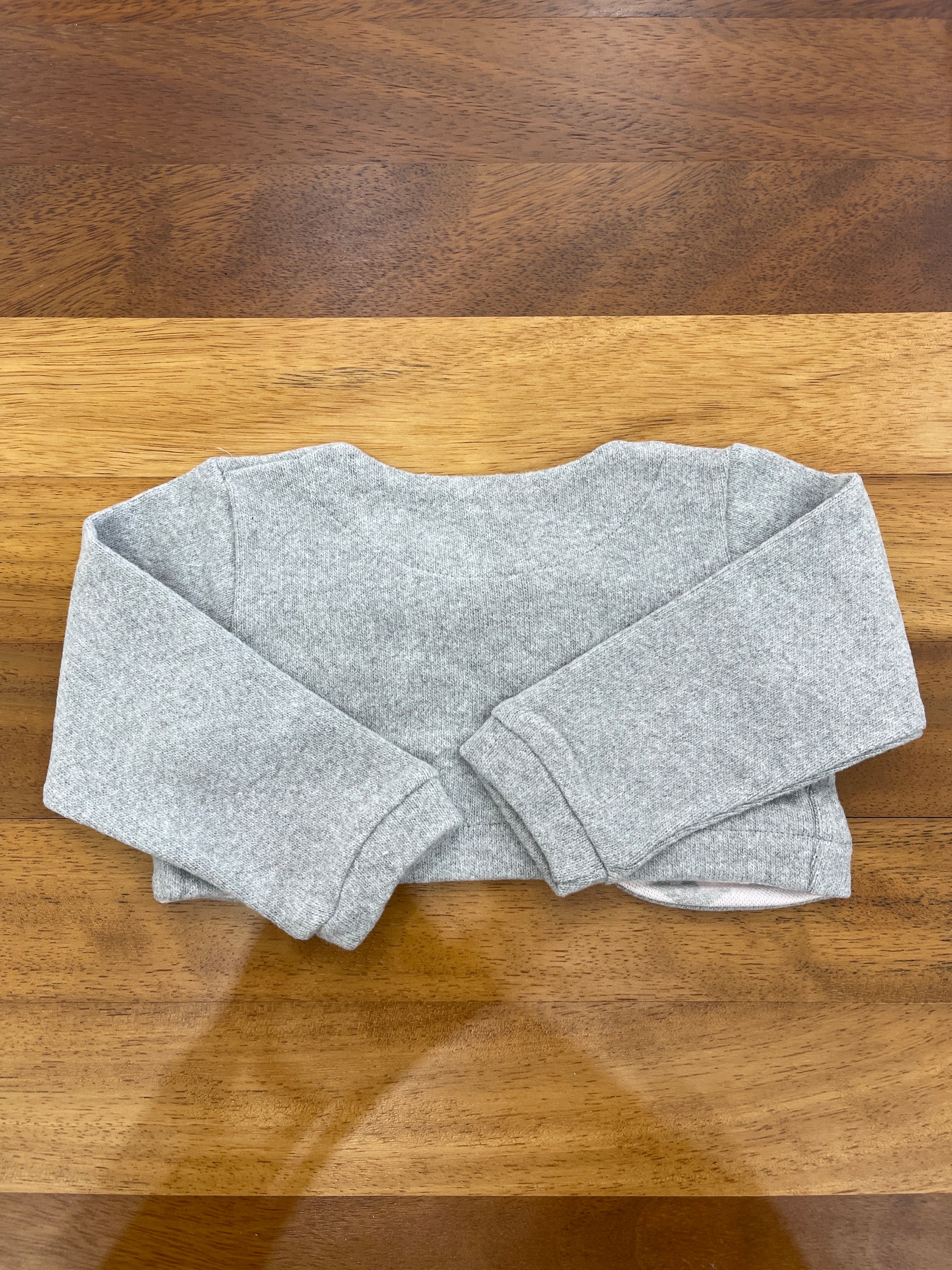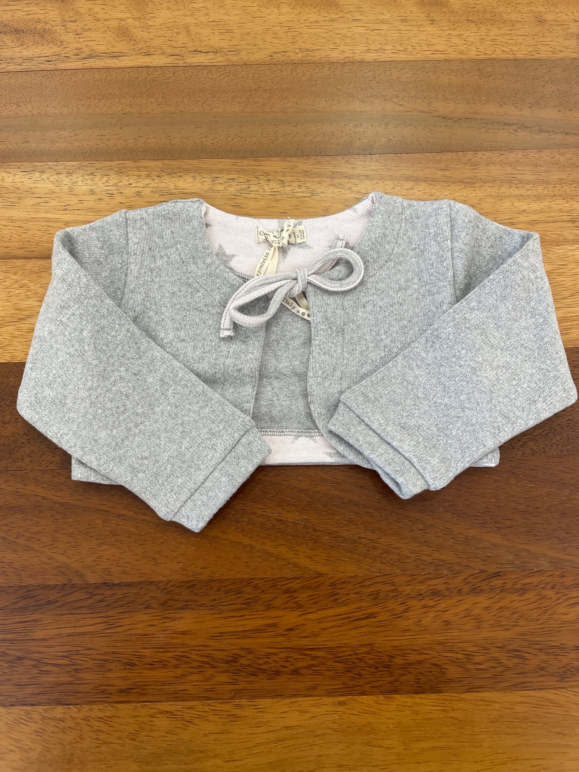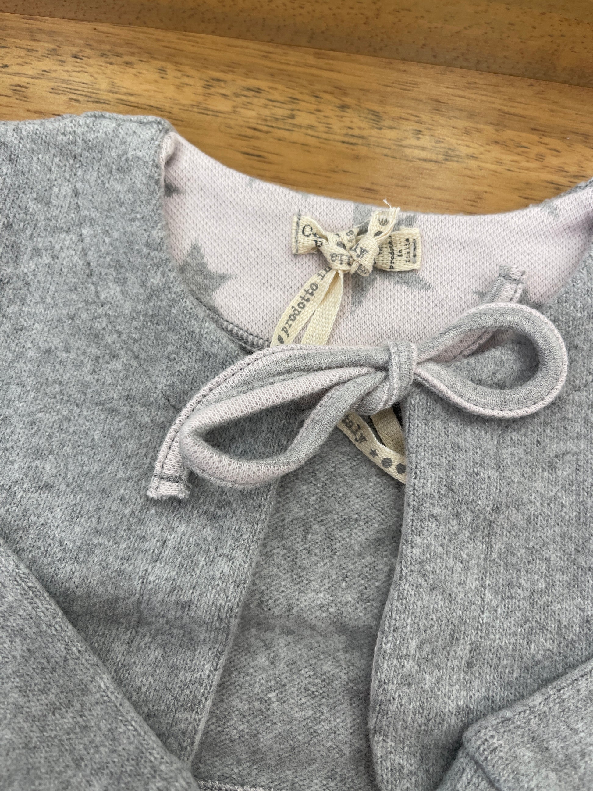 Scaldacuore realizzato in lana grigia, dotato di chiusura con un delicato fiocchetto. La parte interna è rosa, decorata con stelle grigie, per un design raffinato e confortevole.