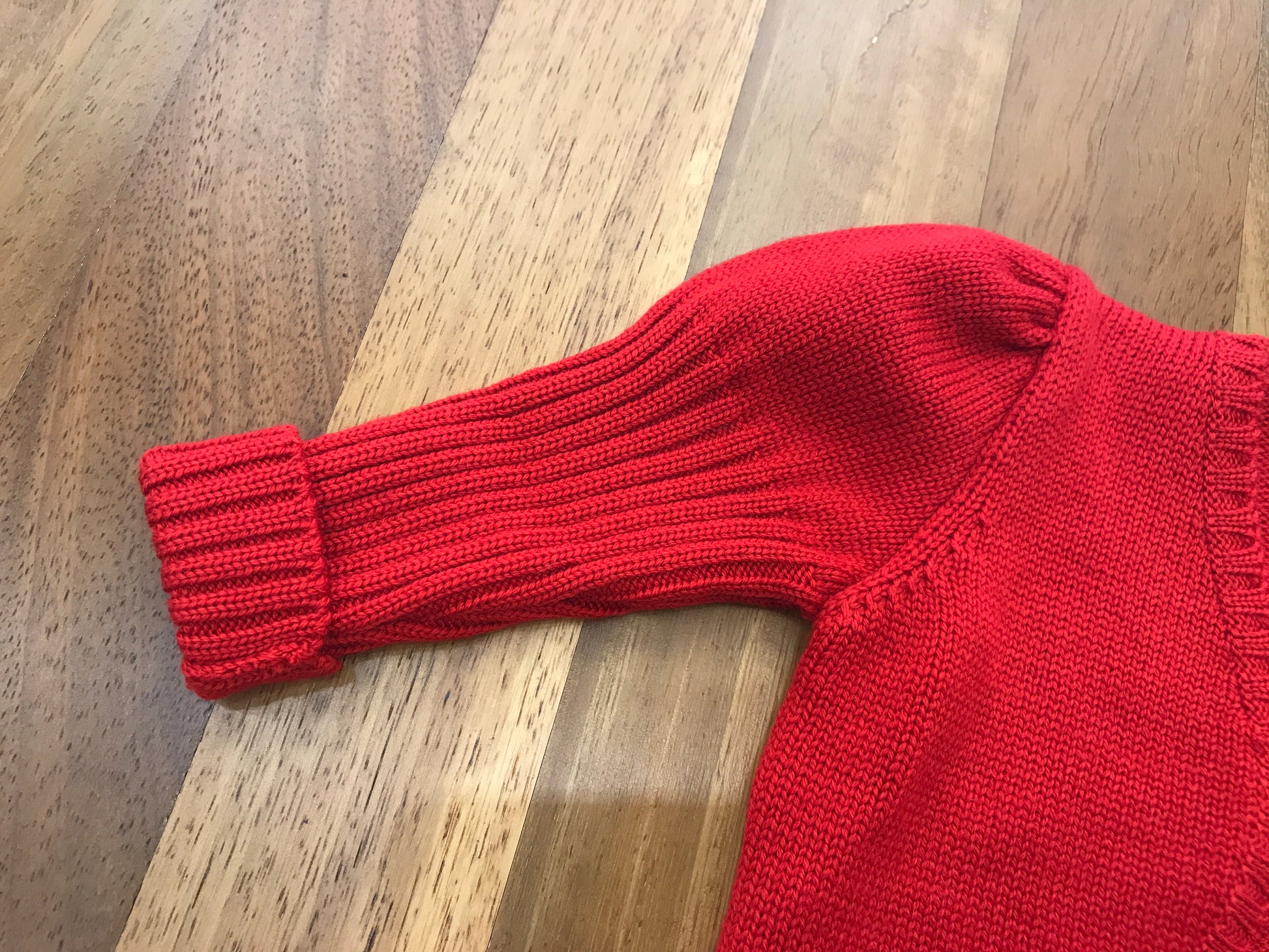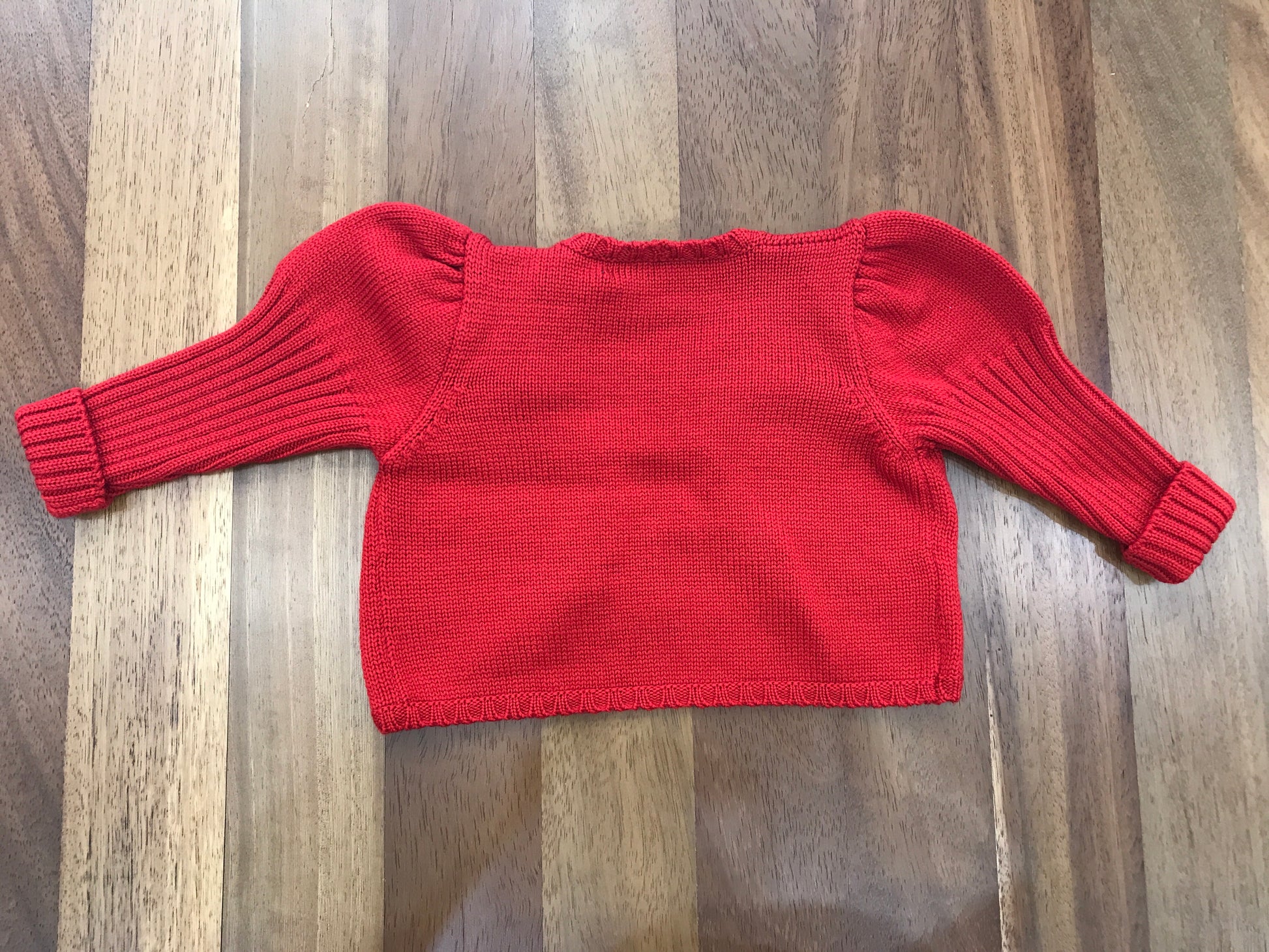 Lo scaldacuore Colibrì, realizzato in lana di colore rosso, è privo di chiusura e presenta un design con risvoltino sulle maniche, che risultano leggermente più lunghe per un comfort ottimale e una maggiore protezione dal freddo.