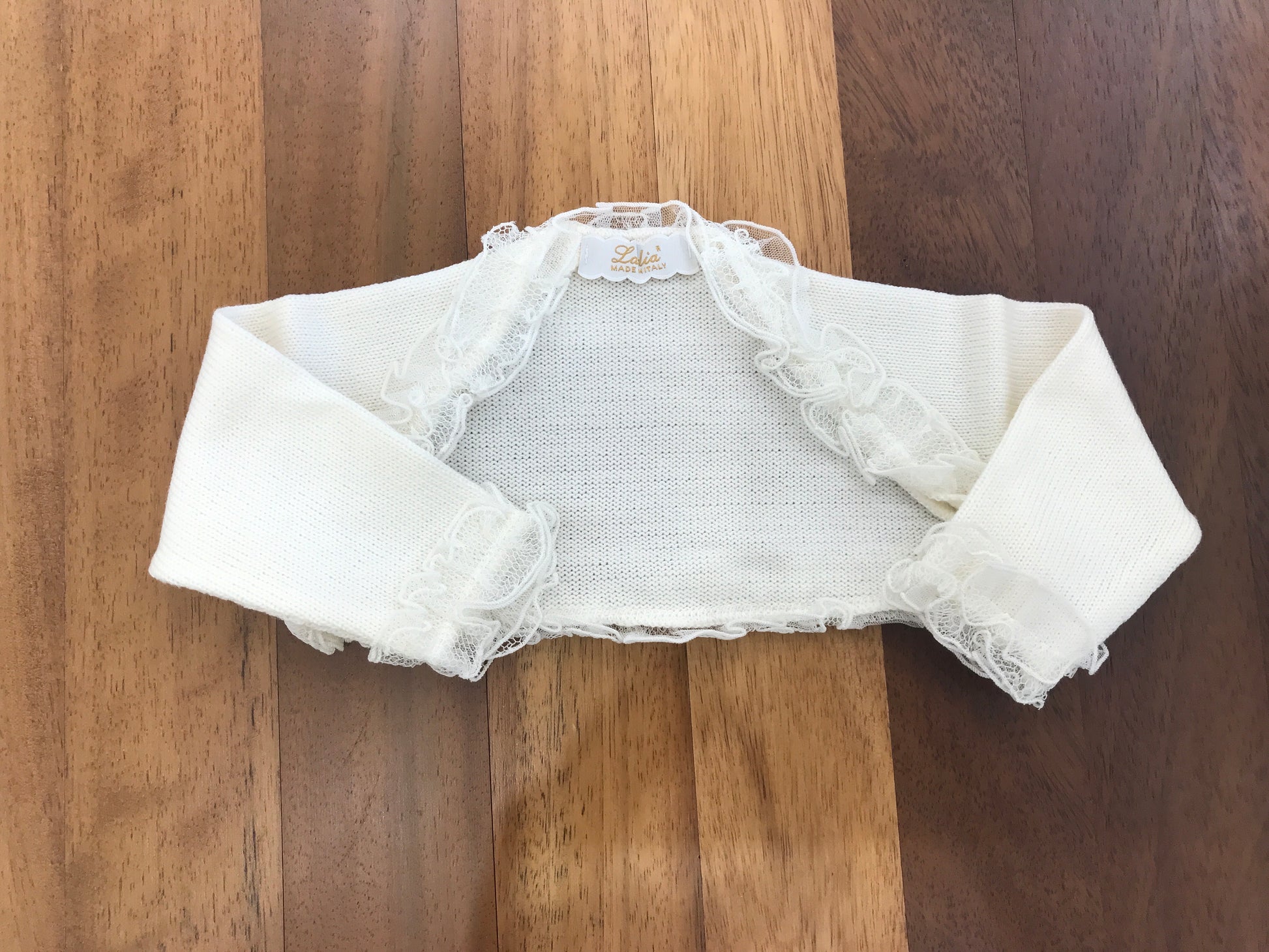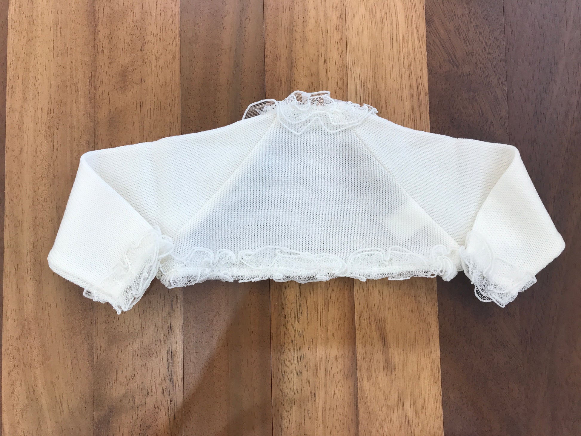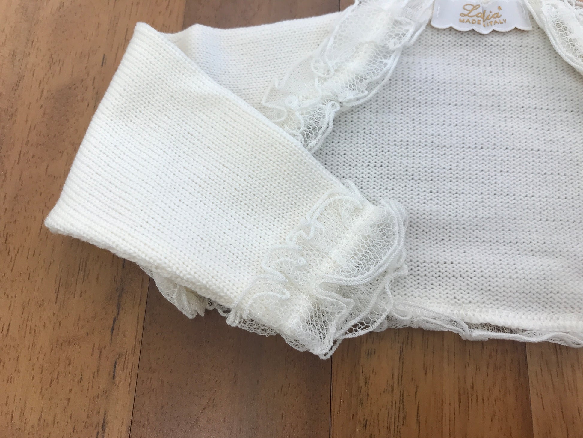 Scaldacuore realizzato in lana di colore panna, privo di qualsiasi tipo di chiusura, con un raffinato merletto che decora delicatamente i bordi, conferendo un tocco di eleganza senza tempo.
