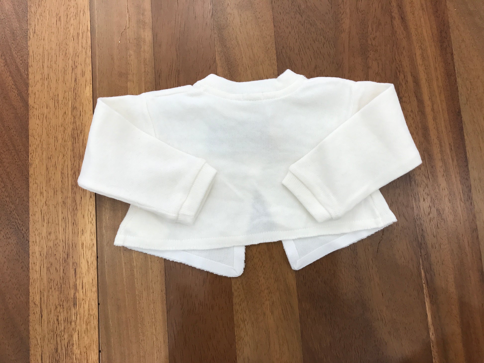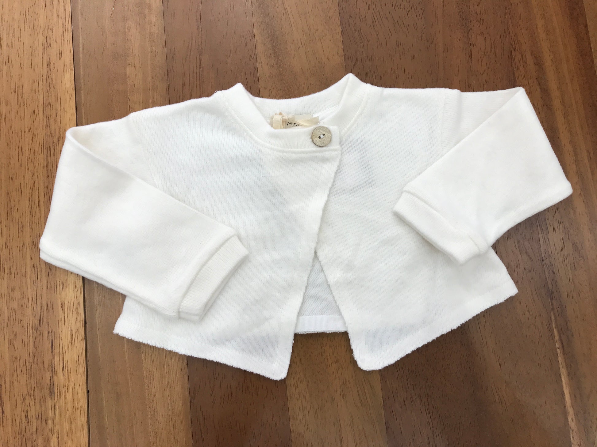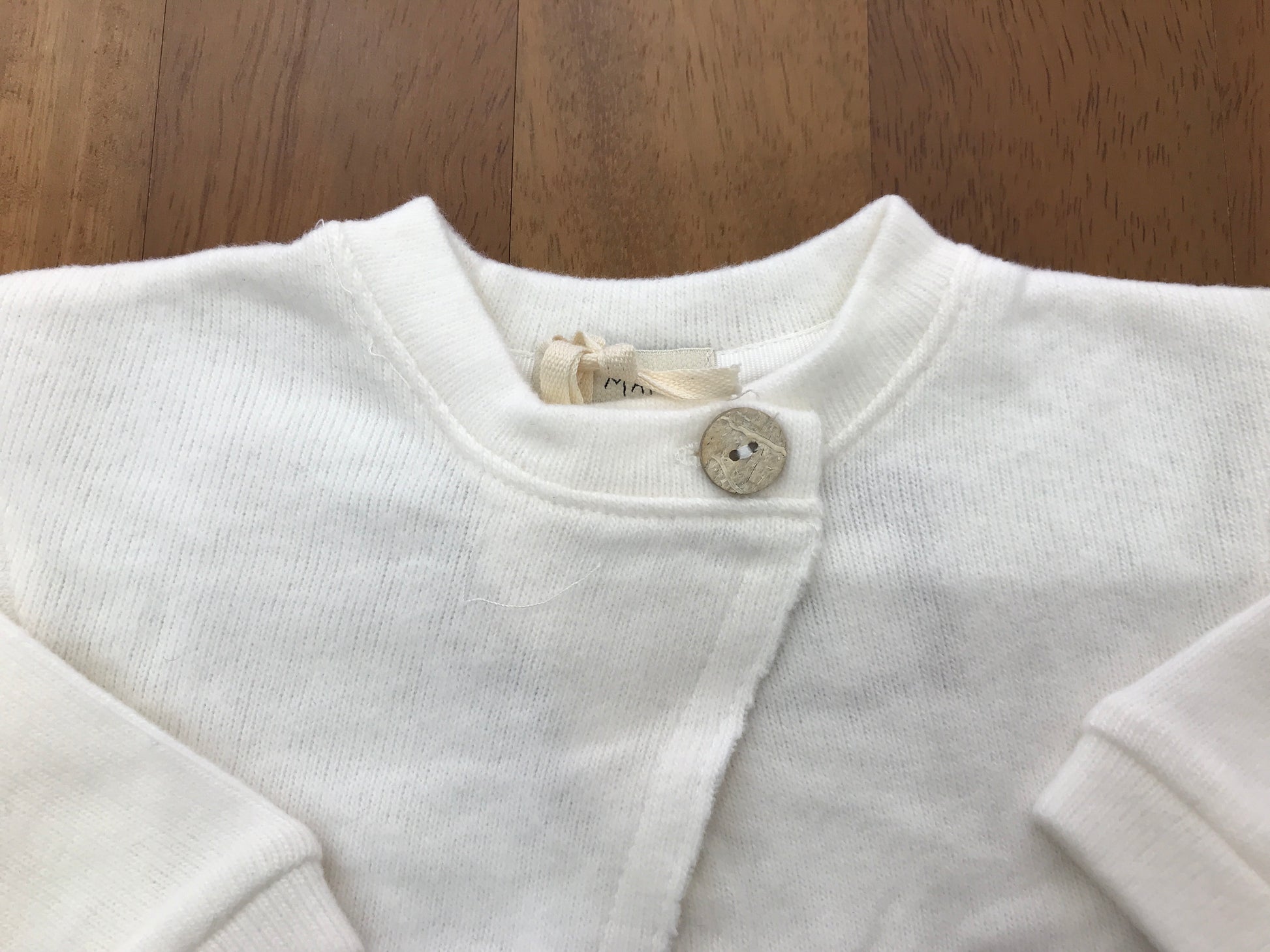 Cardigan in lana color panna con due piccoli bottoncini posti nella parte superiore per una chiusura incrociata, composto da un bottone interno e uno esterno.