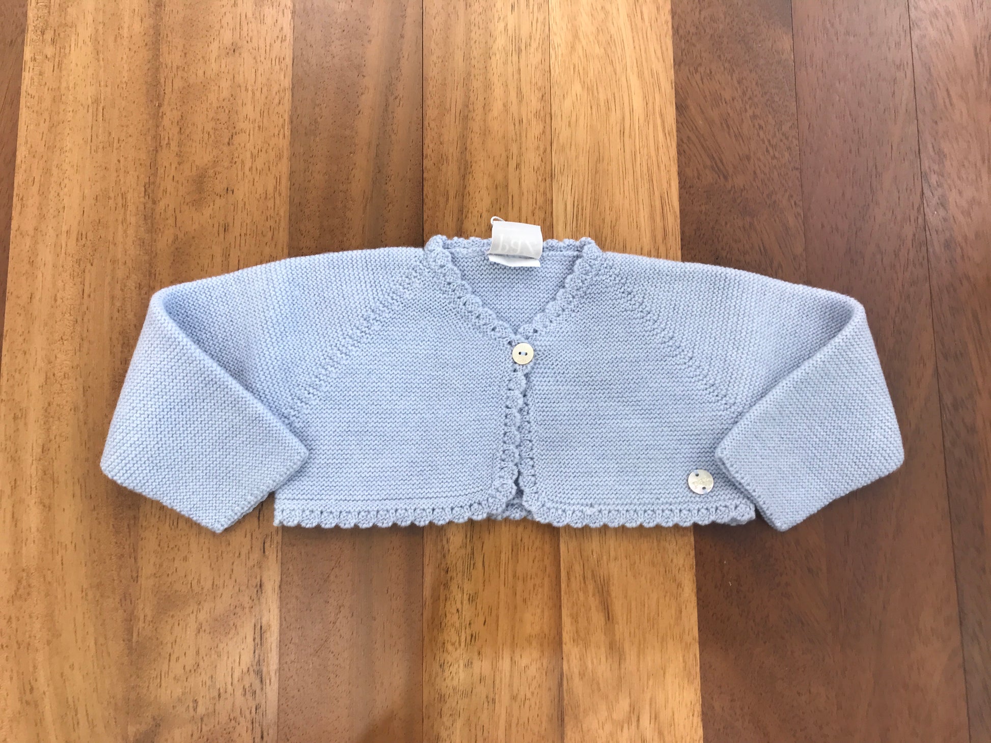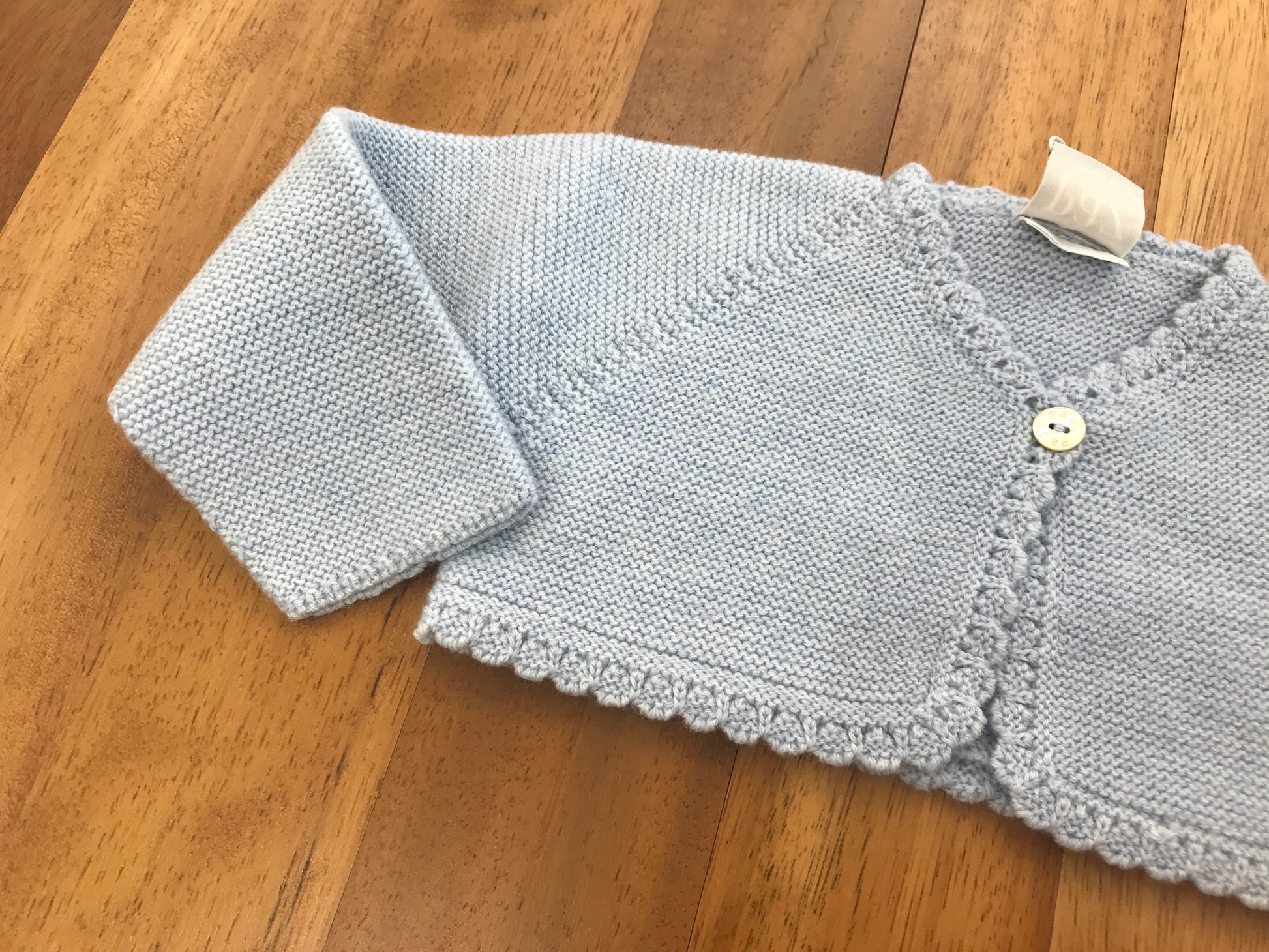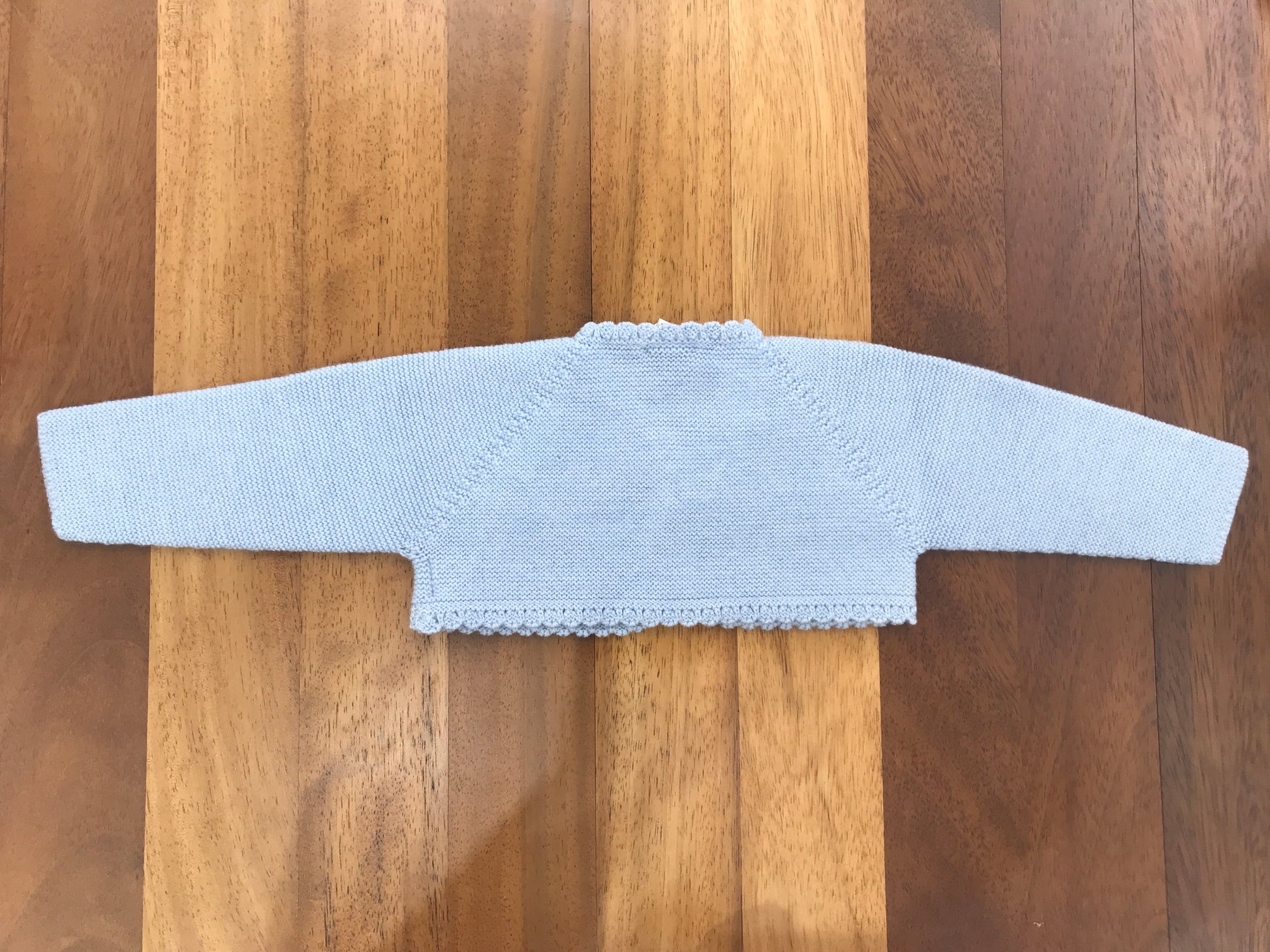 Lo scaldacuore in lana azzurro presenta un delicato smerlo che decora tutto il perimetro, conferendo un tocco di raffinatezza. È completato da un piccolo bottoncino che consente una chiusura pratica ed elegante, ideale per garantire comfort e stile in ogni occasione.