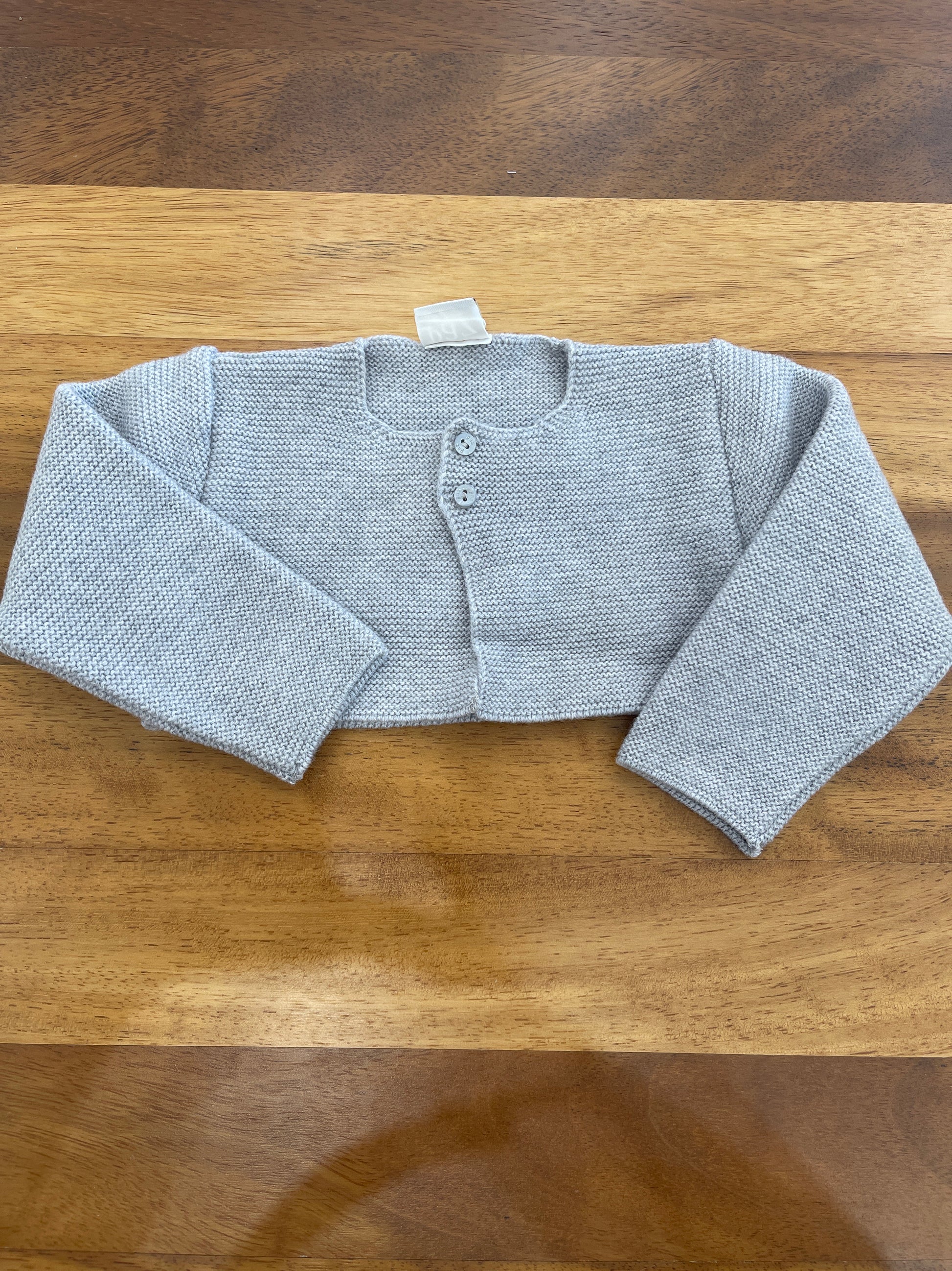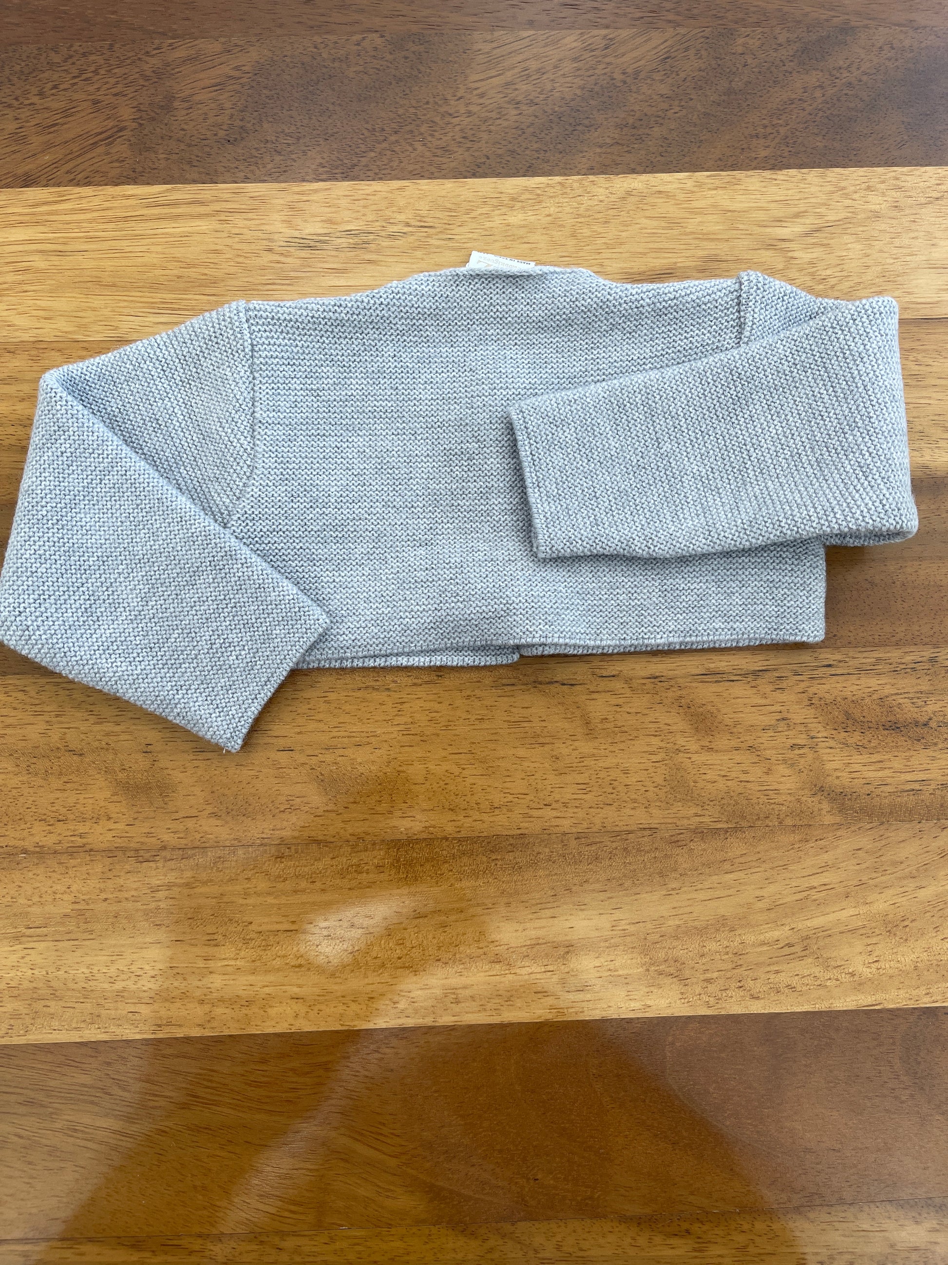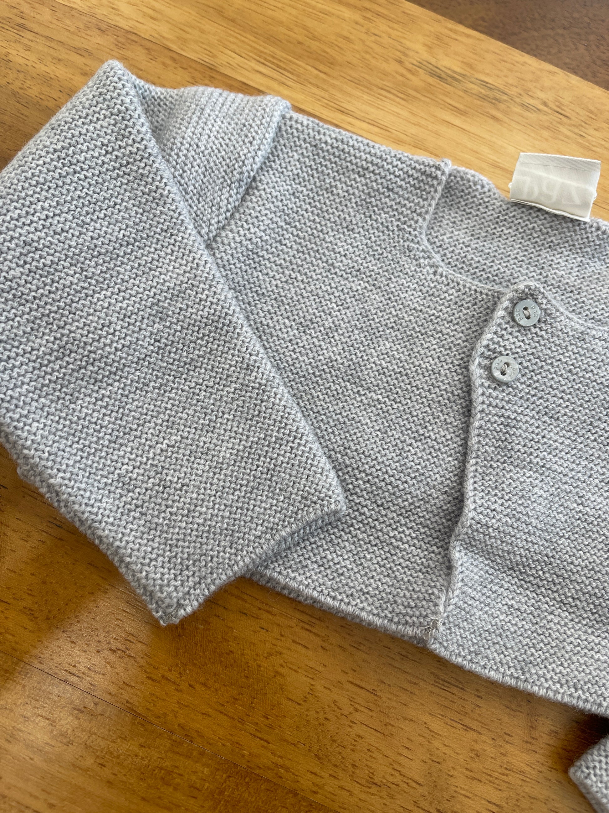 Cardigan in lana grigia dal design estremamente essenziale, caratterizzato da una chiusura frontale con due piccoli bottoni che ne esaltano la semplicità funzionale e l’eleganza discreta.