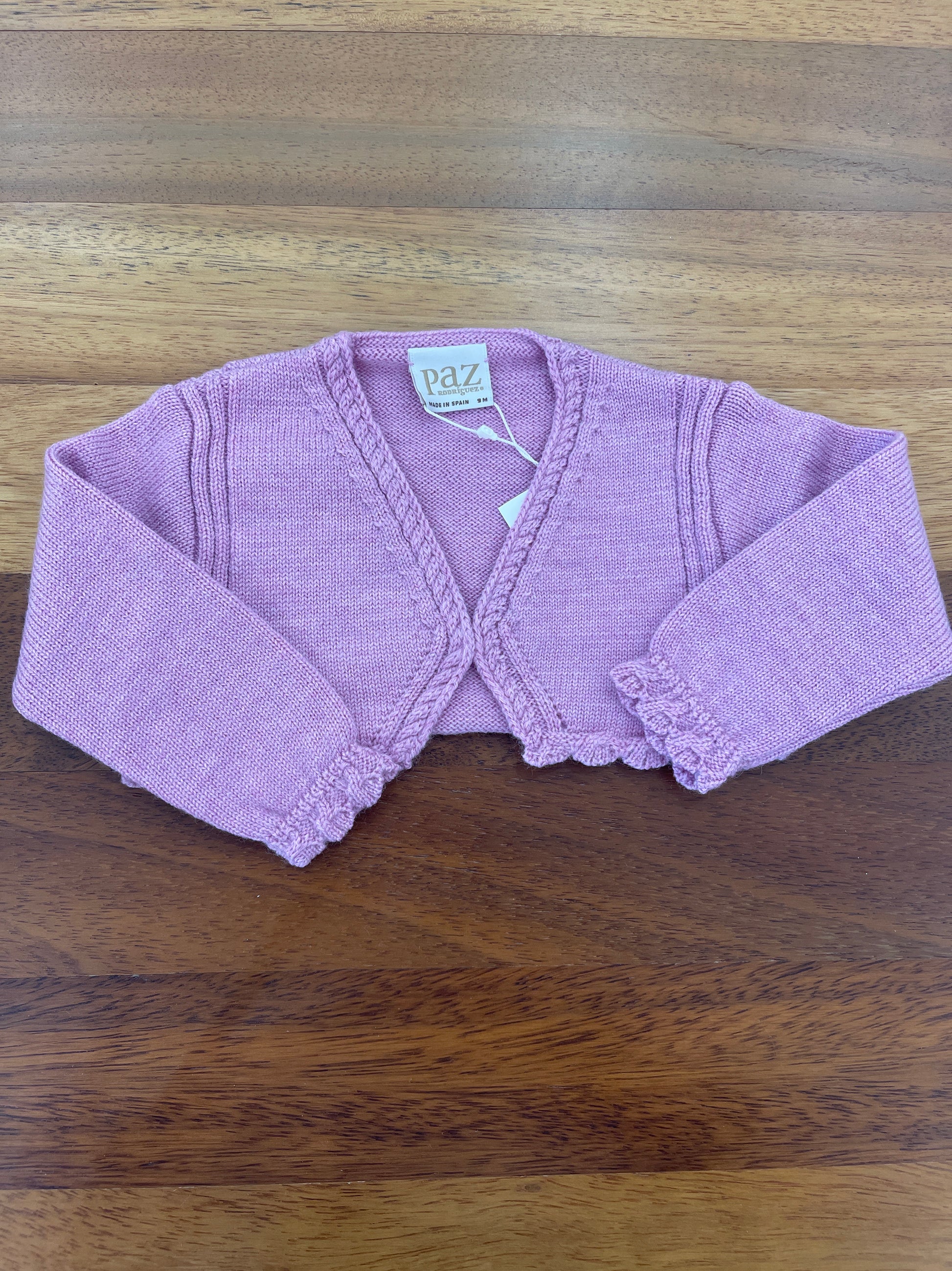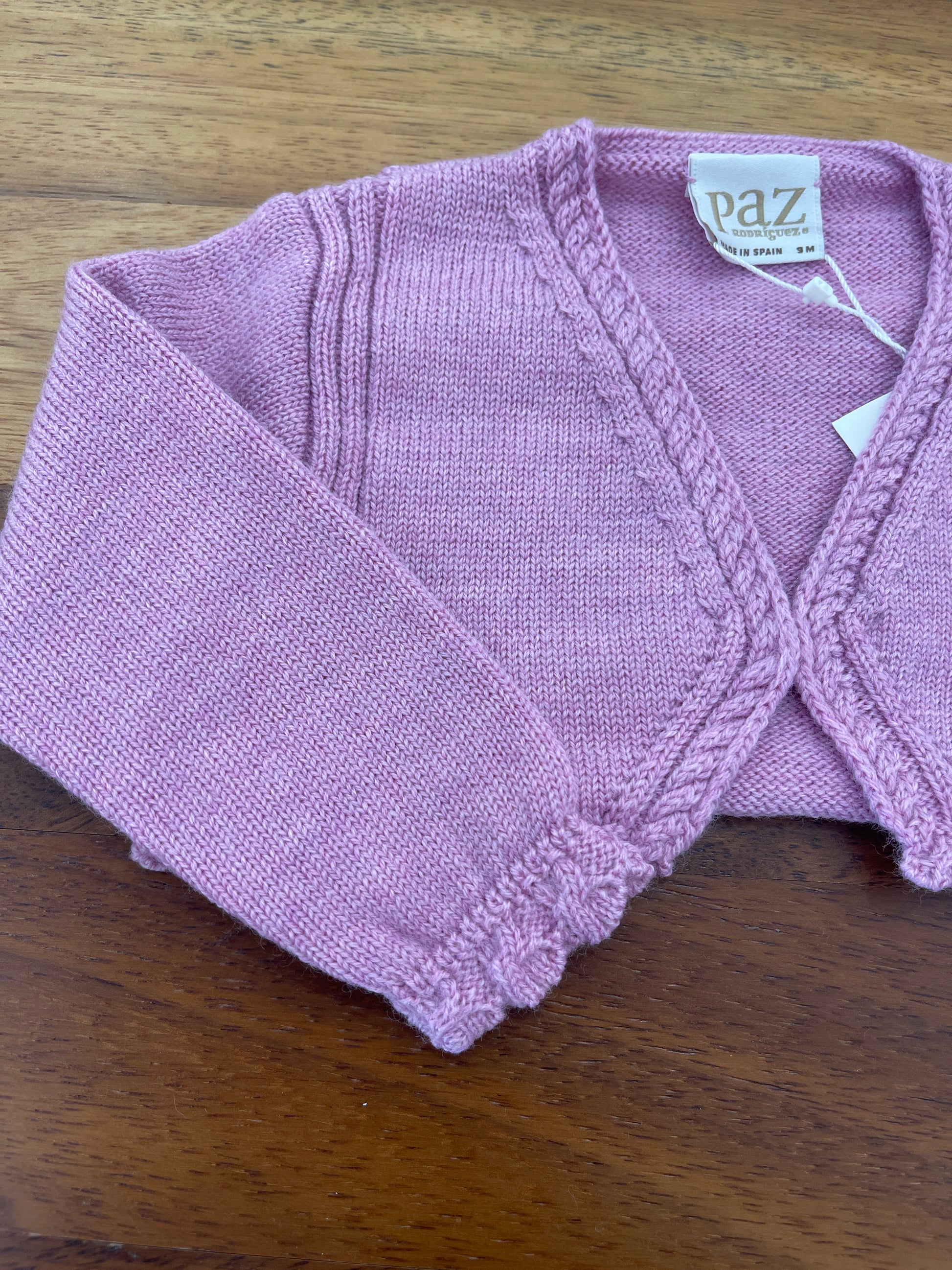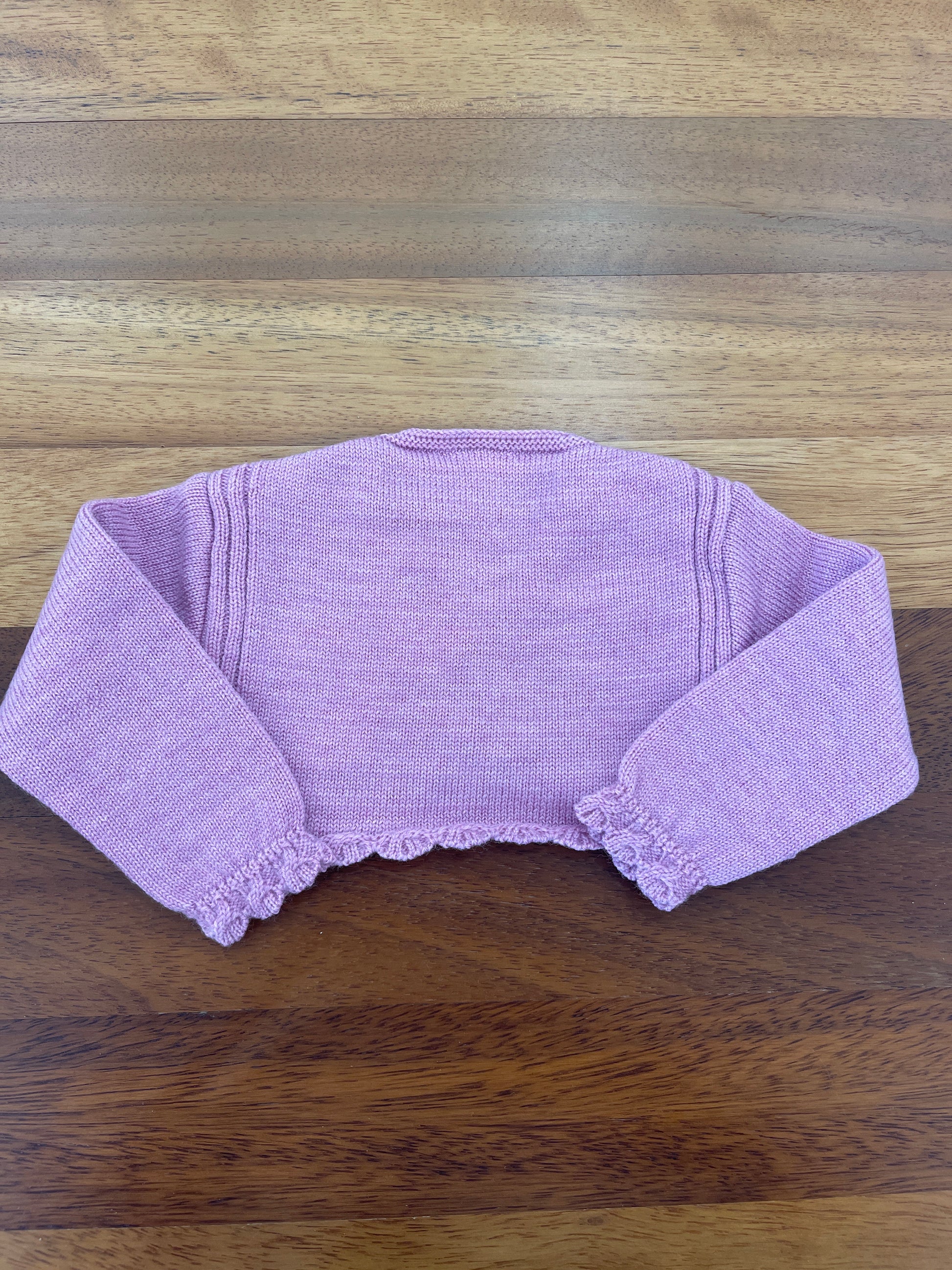 Cardigan lilla in lana, caratterizzato da riccioli decorativi sui bordi e alle estremità delle maniche, con un piccolo bottone interno per una chiusura sicura.