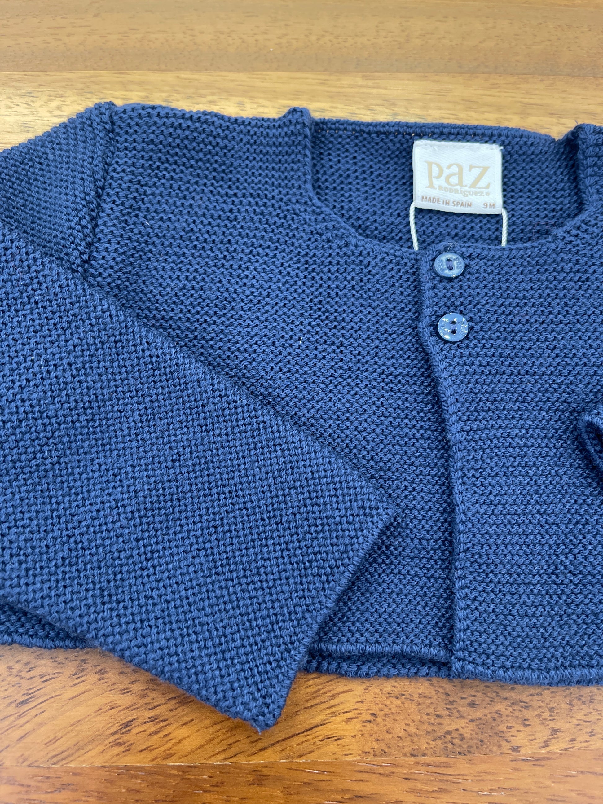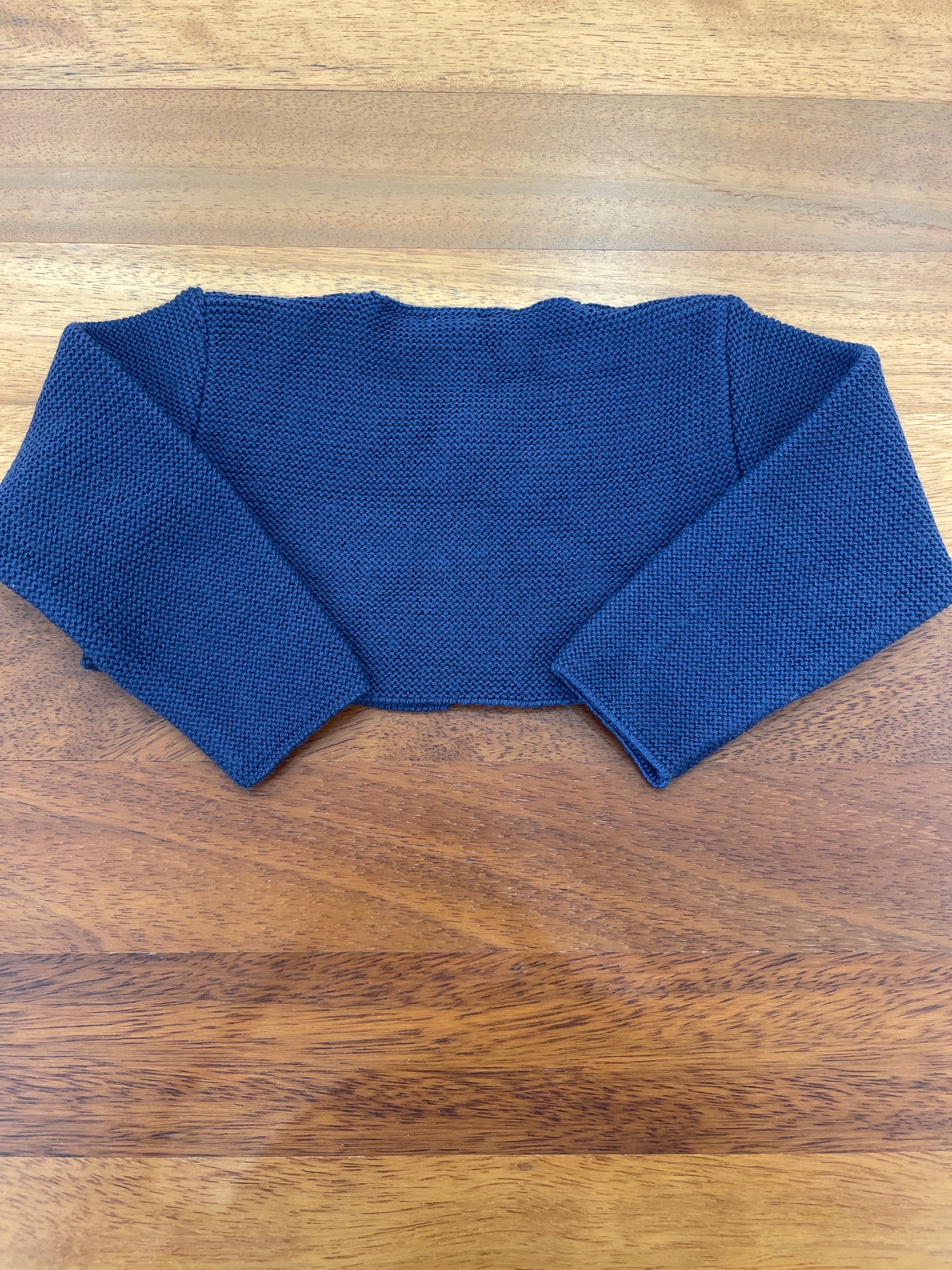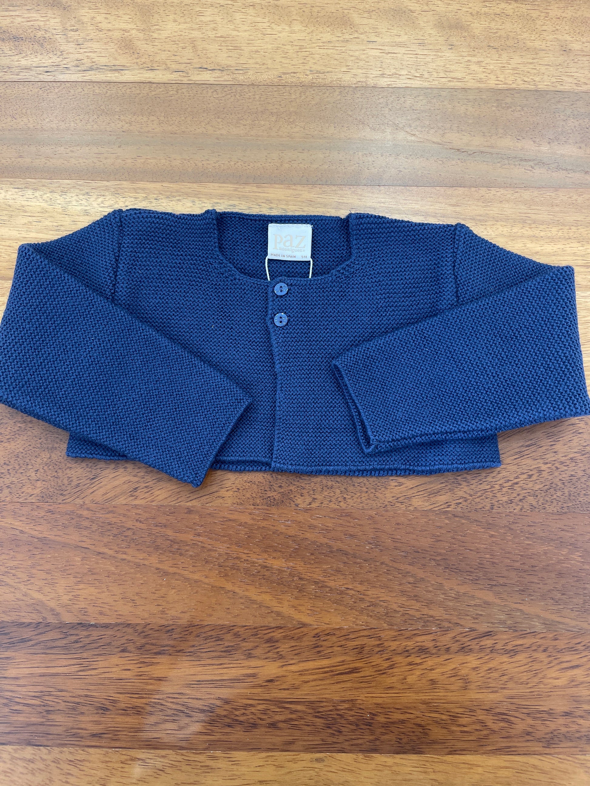 Cardigan in lana tinta blu, caratterizzato da un design essenziale e lineare. Il capo presenta una chiusura frontale con due piccoli bottoncini che ne sottolineano la semplicità e la raffinatezza, ideale per chi cerca un capo versatile e discreto.
