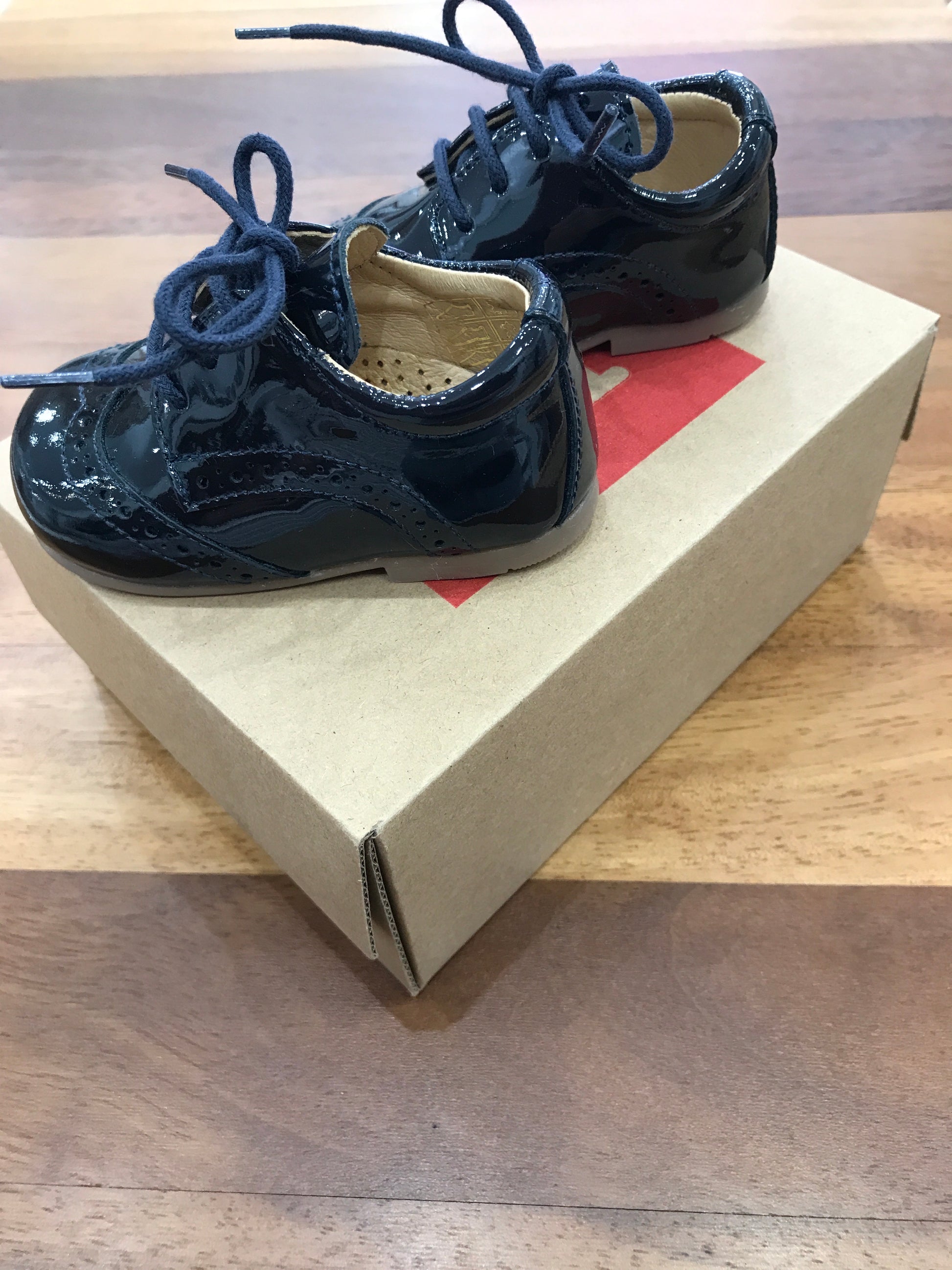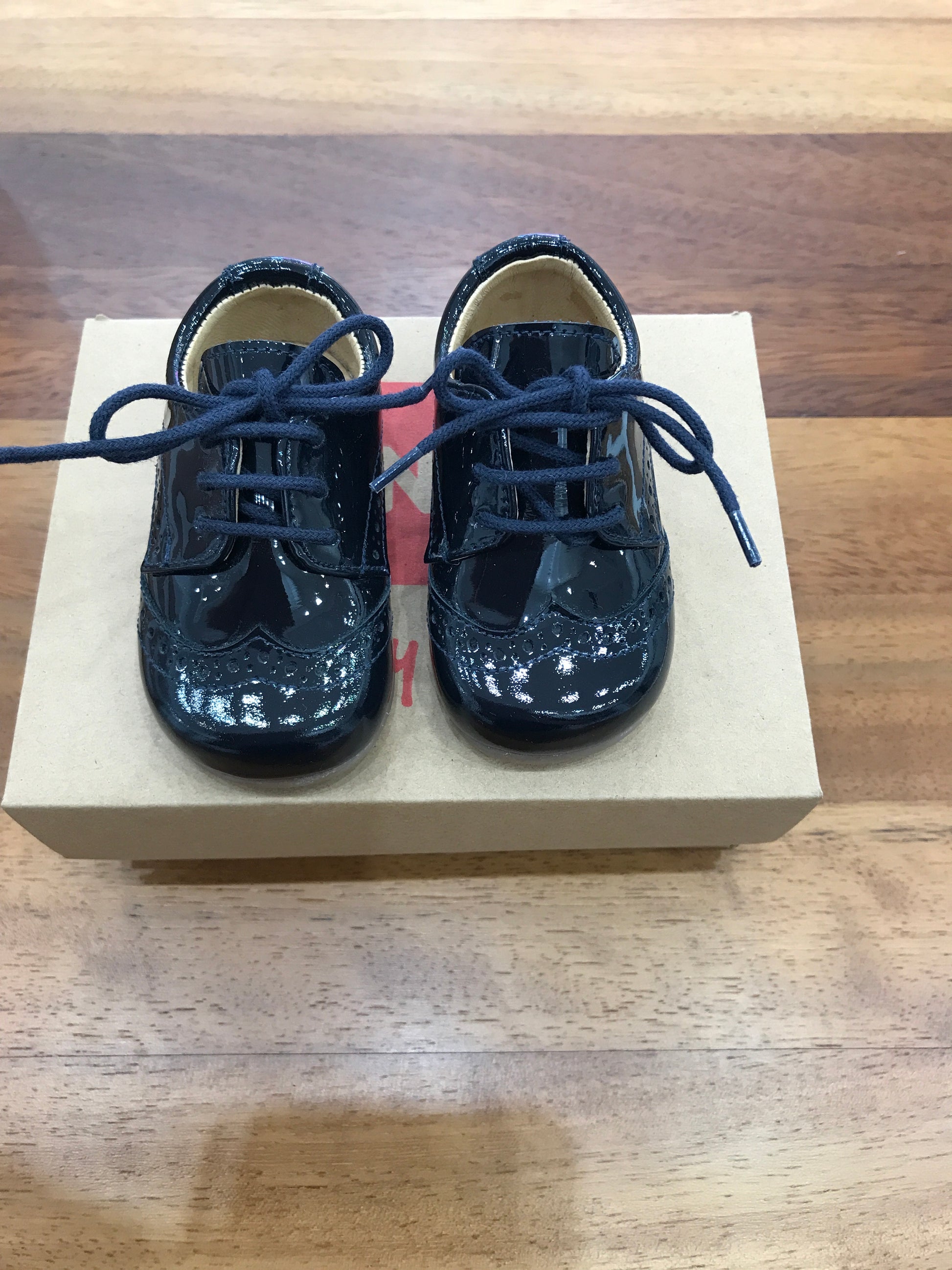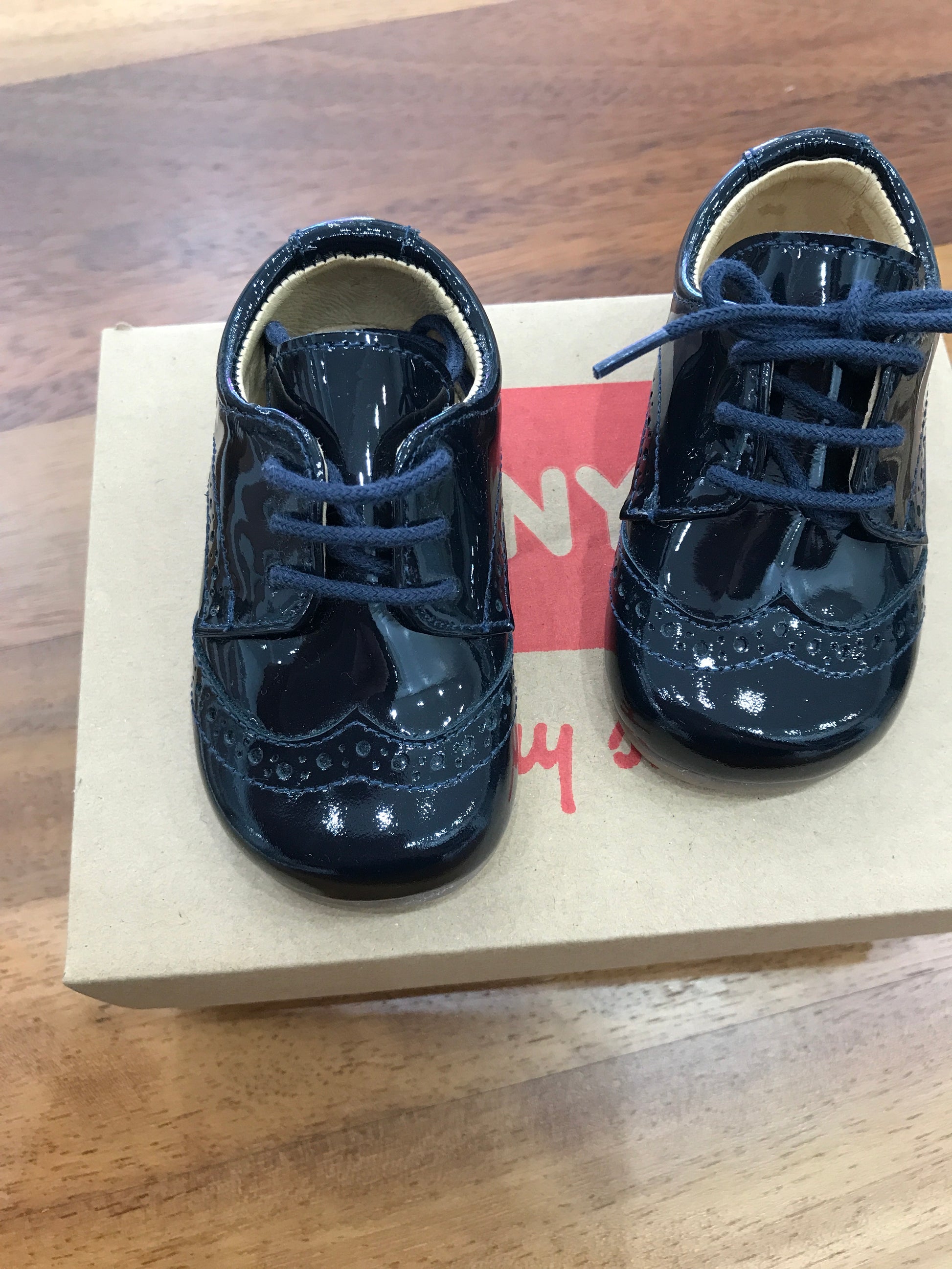 Scarpa primi passi in elegante blu navy, progettata con una pratica chiusura a laccio per garantire una calzata sicura e regolabile. Presenta un raffinato dettaglio decorativo sulla parte anteriore, che aggiunge un tocco distintivo e curato al design complessivo.