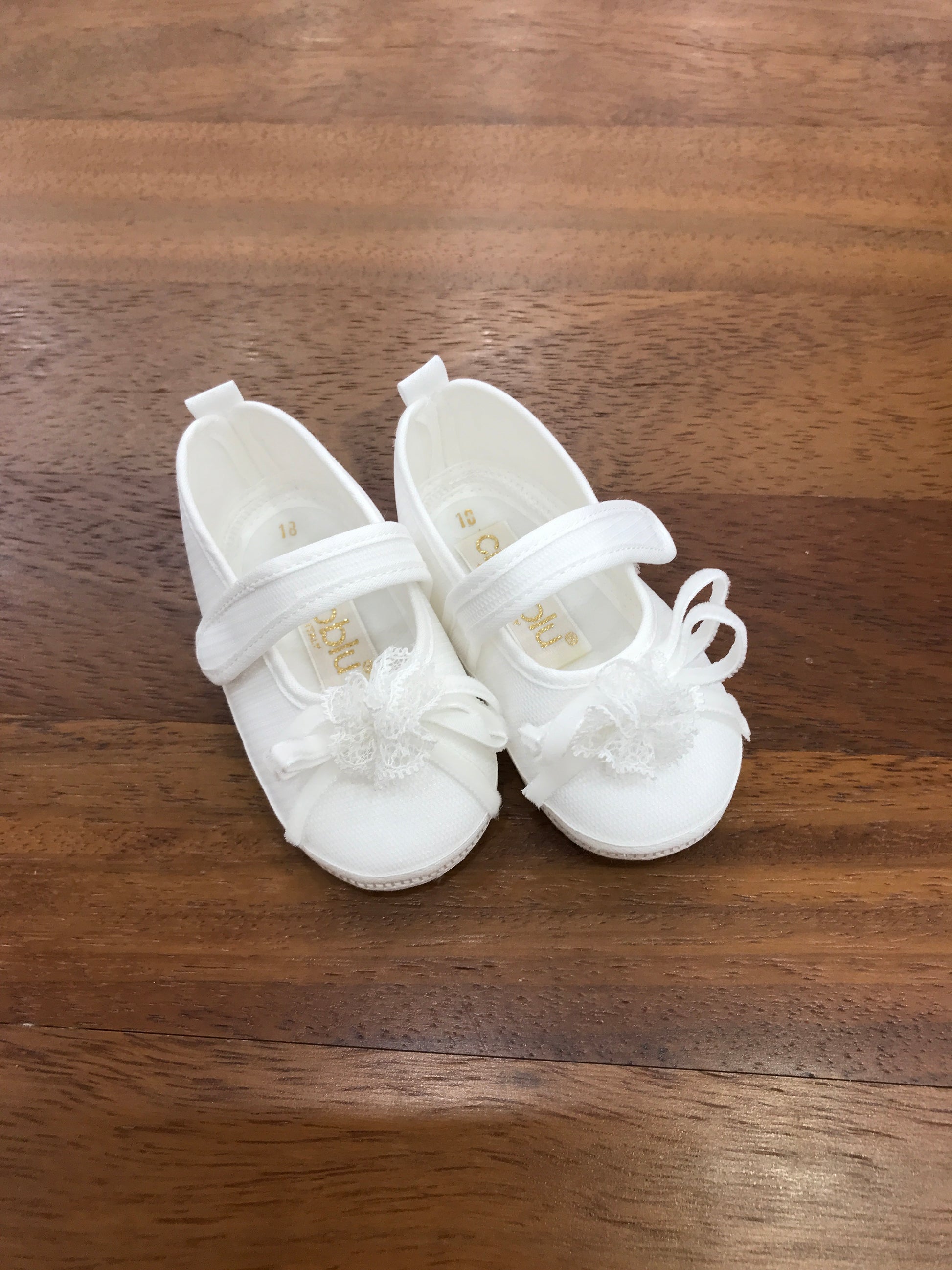 Elegante scarpina in cotone bianco, dotata di pratico sistema di chiusura a strappo per facilitare l'indossamento. Impreziosita da un delicato fiocco e da un fiore applicato sulla parte anteriore, che conferisce un tocco di raffinatezza e femminilità al design. Una scelta sofisticata per le piccole fashioniste.
