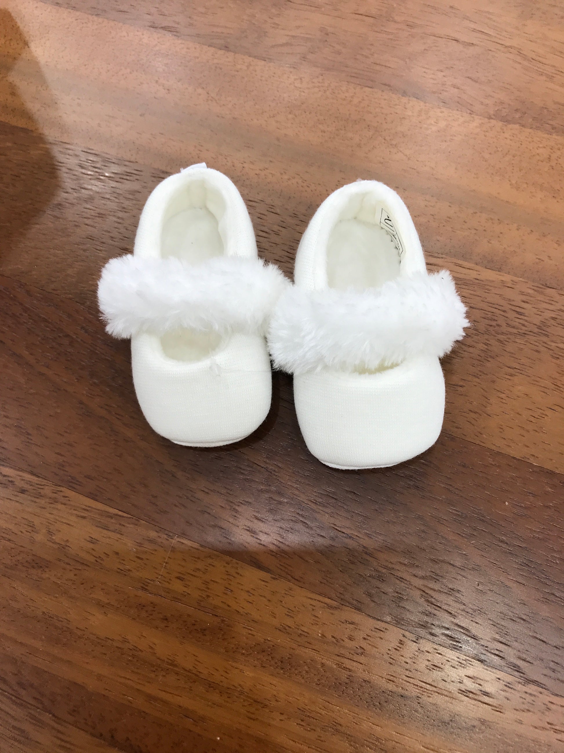 Elegante scarpina in bianco puro, arricchita da dettagli in morbida pelliccia posizionati strategicamente sulla parte anteriore e sull'elastico. Un capo sofisticato che unisce comfort e raffinatezza, perfetto per completare l'outfit dei più piccoli con stile.