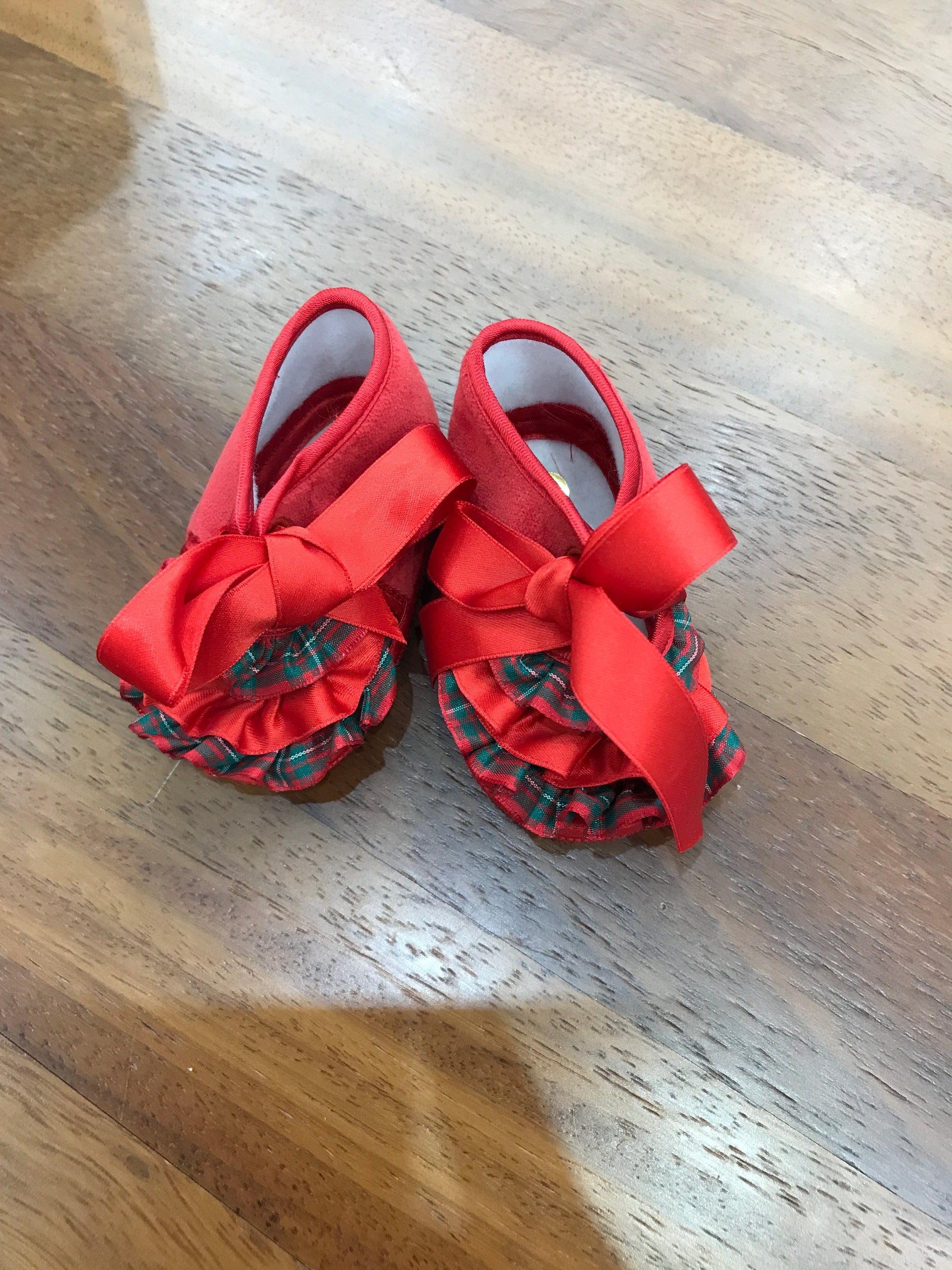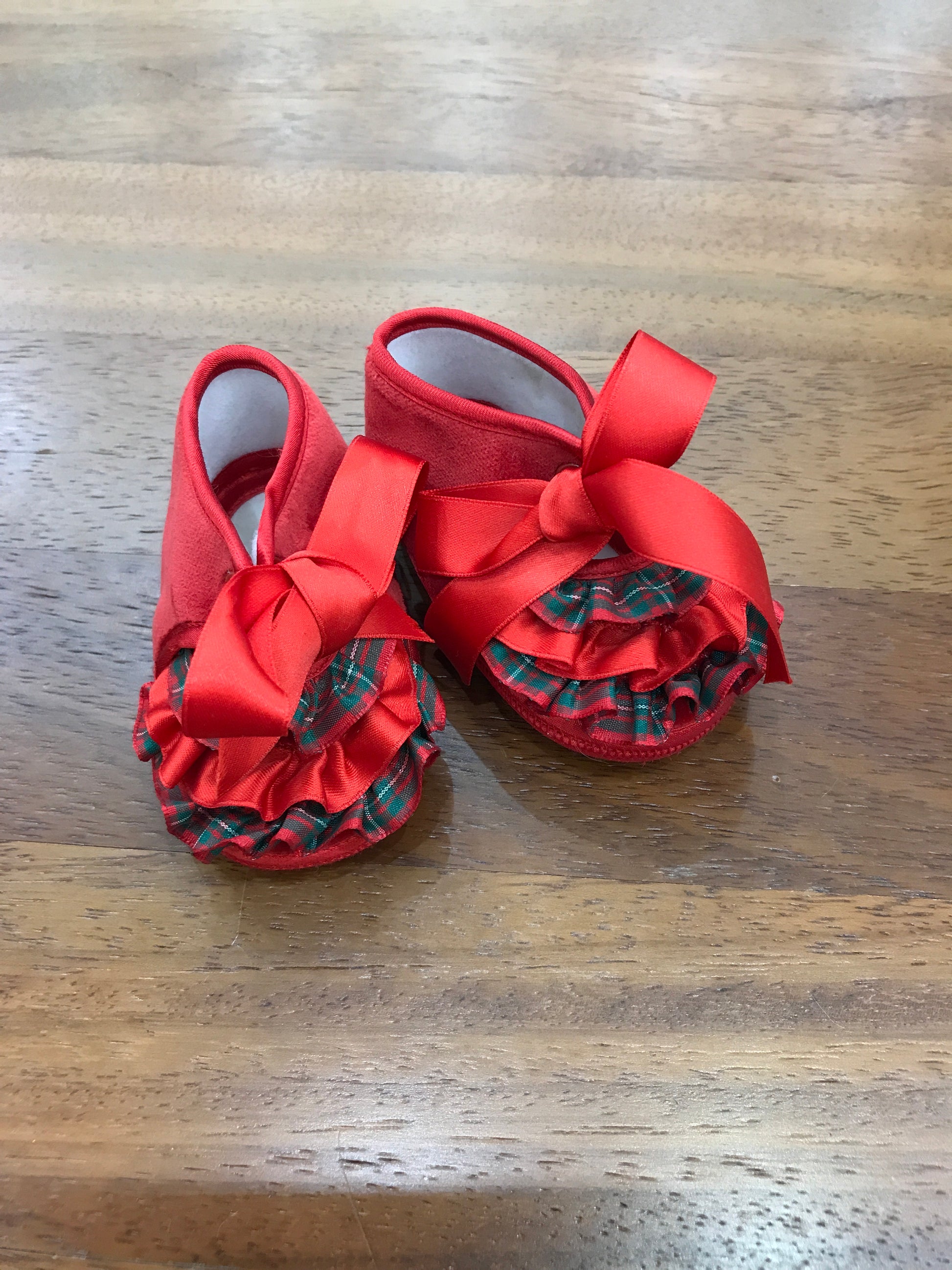 Elegante scarpina realizzata in morbido velluto rosso, impreziosita da delicate rusche scozzesi sul fronte. Pratica chiusura con fiocco coordinato che garantisce una vestibilità sicura e confortevole per i più piccoli.