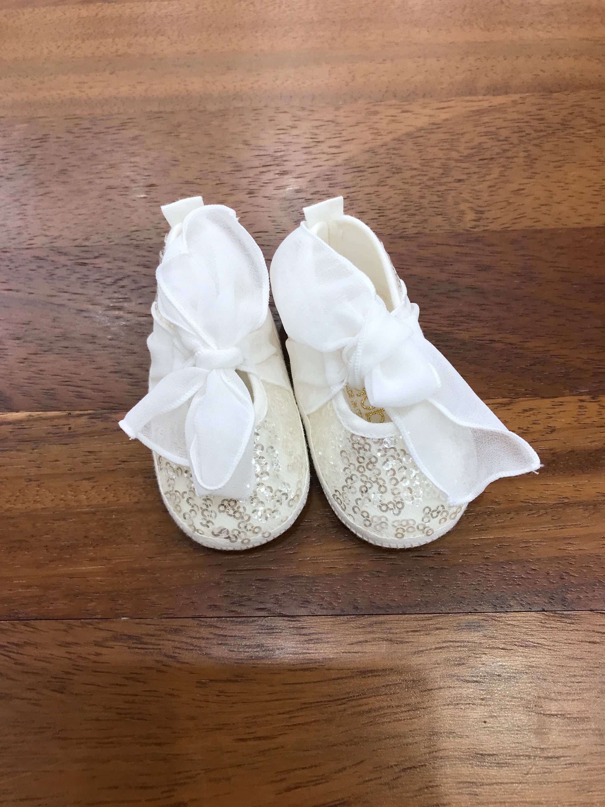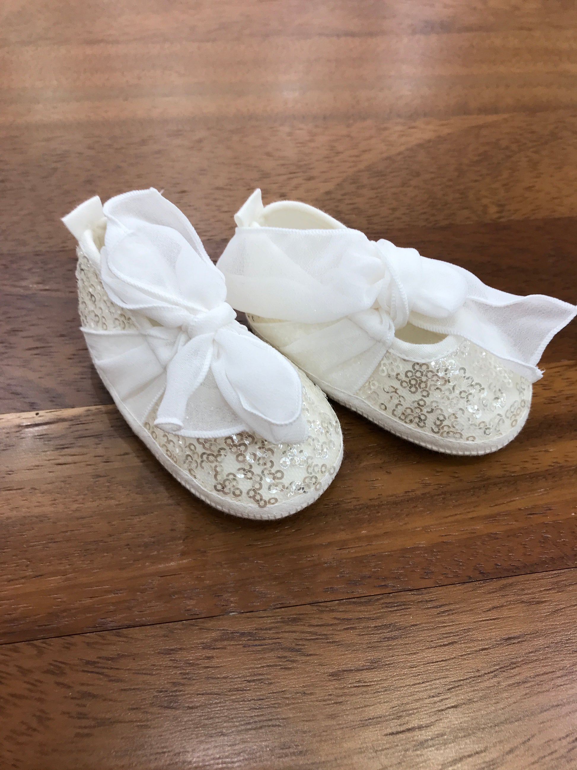 Scarpine in cotone bianco di qualità, impreziosite da paillettes scintillanti che aggiungono un tocco di eleganza. La chiusura con fiocco in organza garantisce praticità e raffinatezza, rendendole ideali per occasioni speciali. Un accessorio sofisticato e confortevole per i più piccoli.