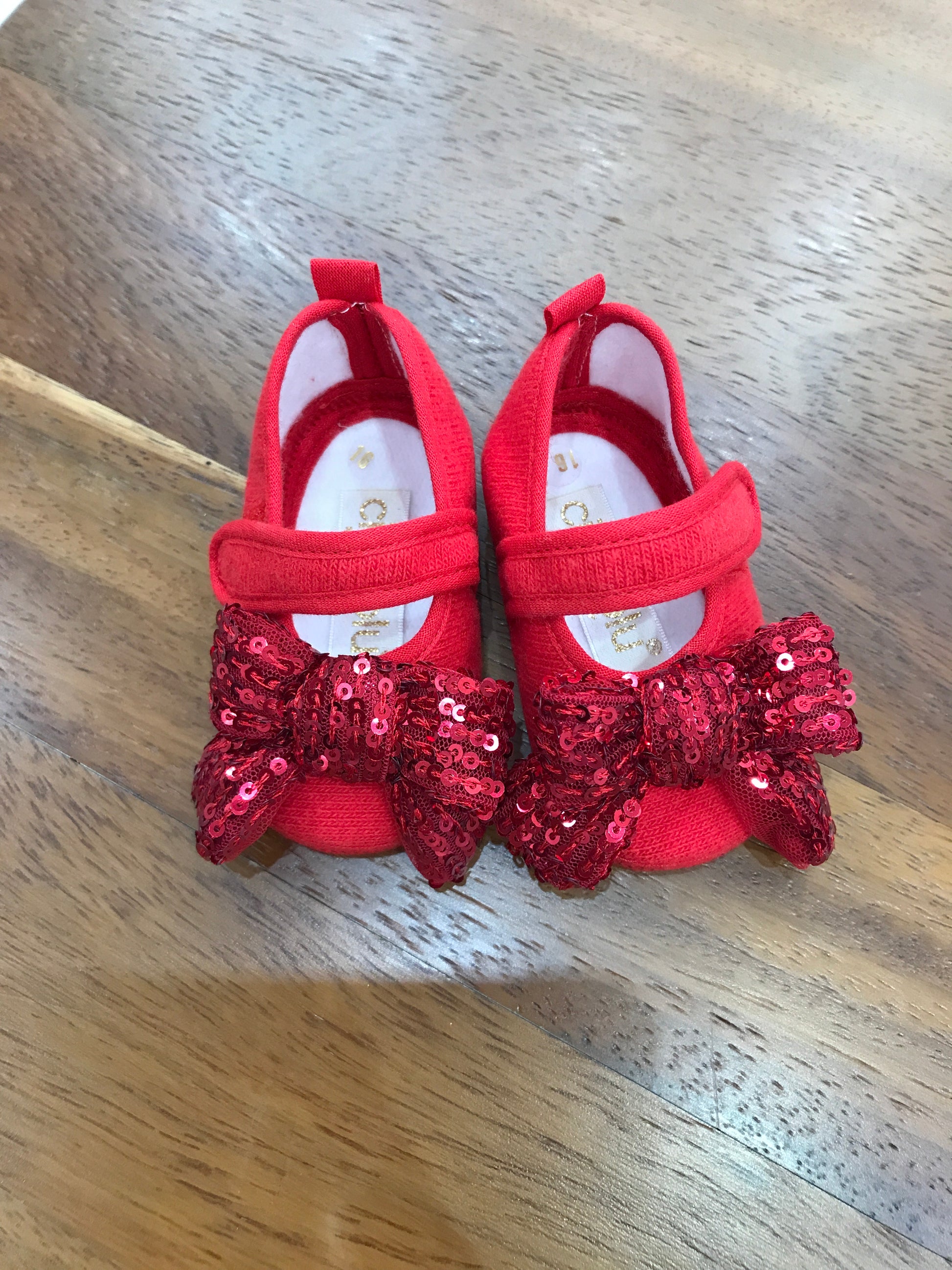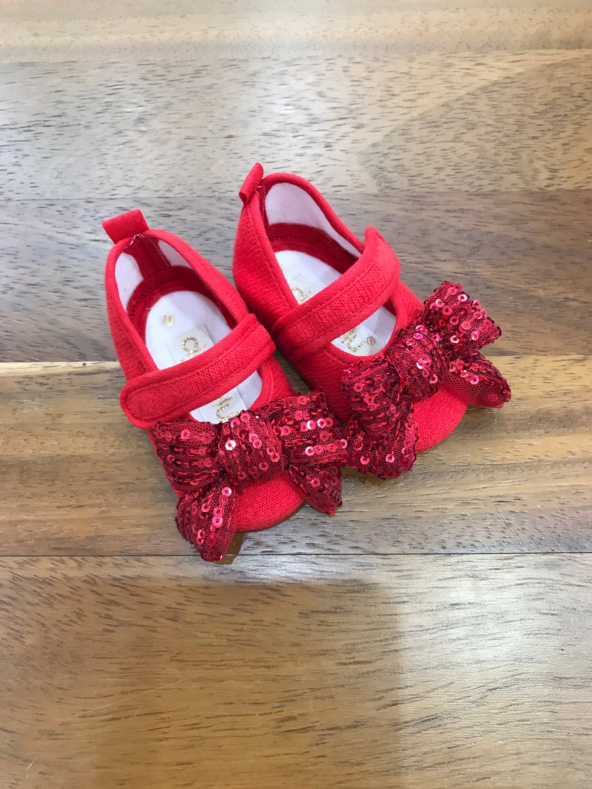 Elegante scarpina realizzata in cotone di qualità, proposta nella tonalità rosso intenso. Caratterizzata da pratica chiusura a strappo e impreziosita da un delicato fiocco di paillettes sulla parte anteriore, combina funzionalità e dettagli raffinati per un look sofisticato e versatile.