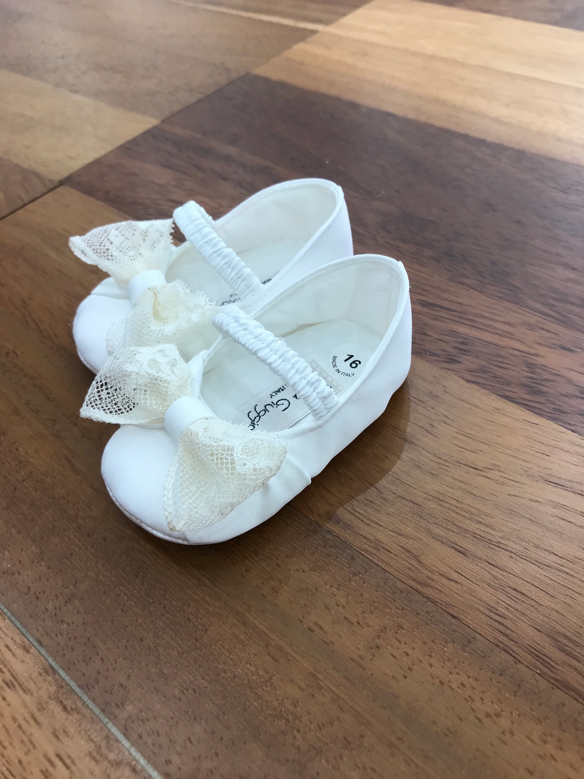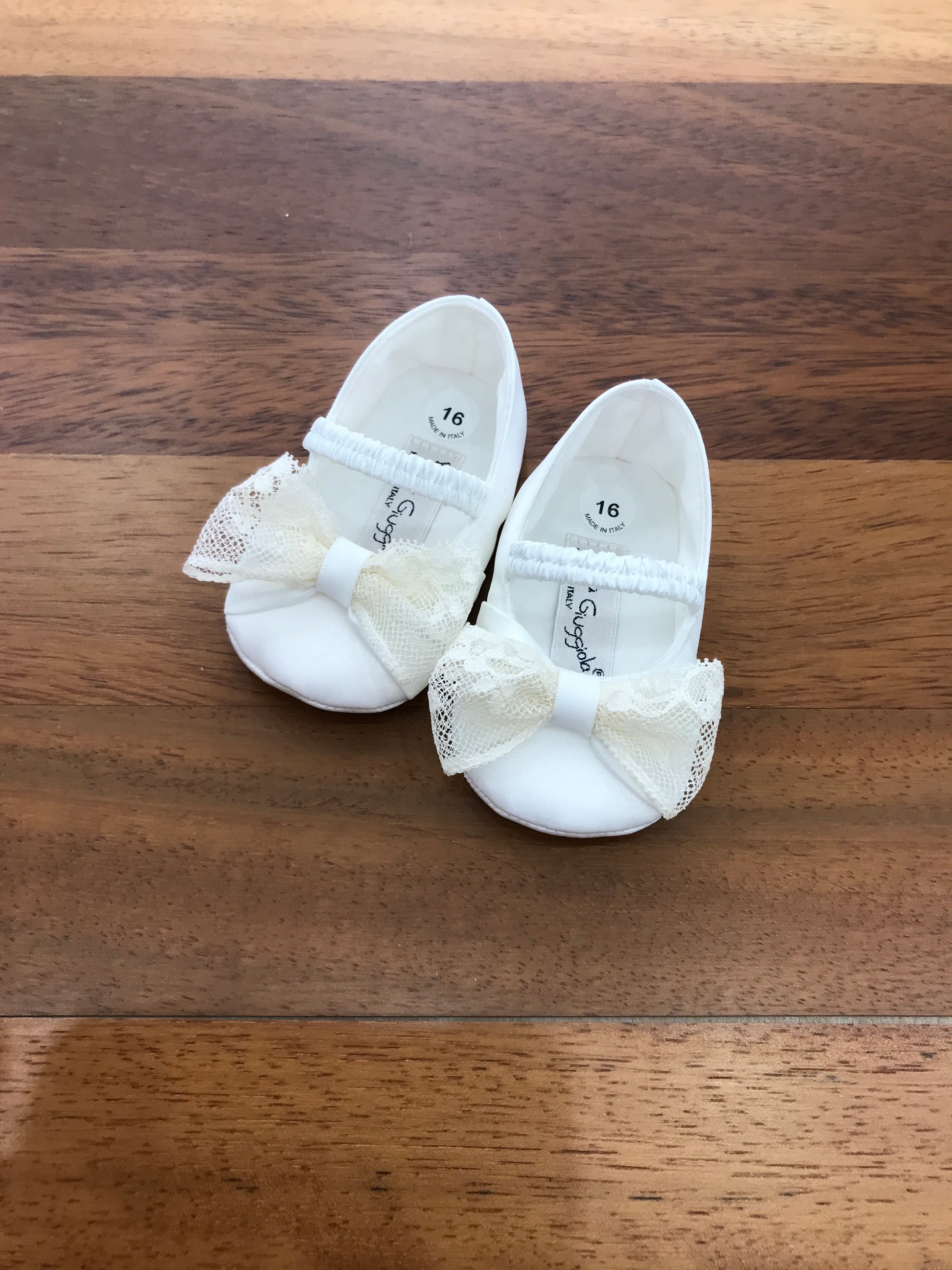 Elegante scarpina rifinita con un raffinato fiocco in pizzo sul davanti, dotata di un elastico per garantire una calzata aderente e confortevole. Questo dettaglio funzionale assicura che la scarpina rimanga ben salda al piedino, unendo stile e praticità in un unico prodotto.
