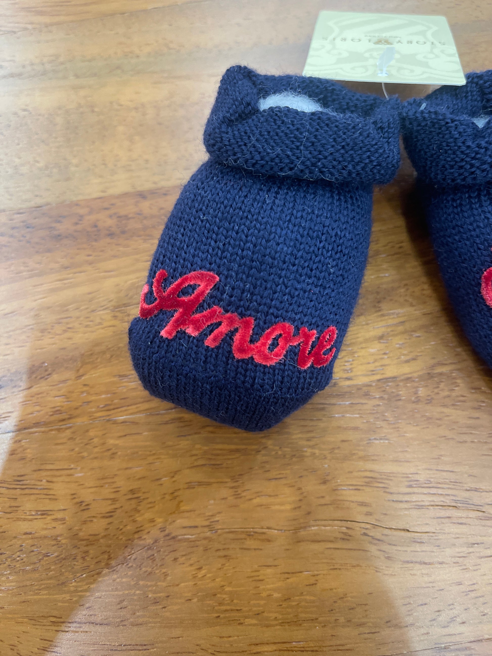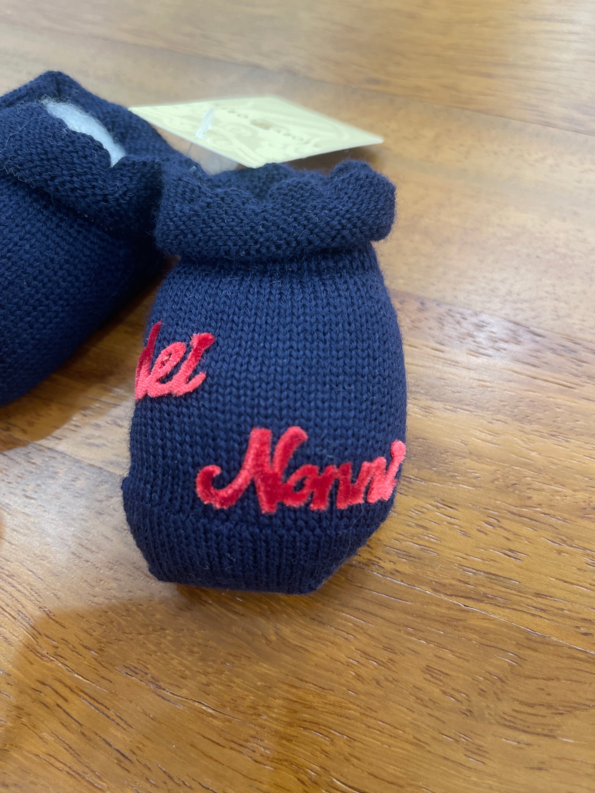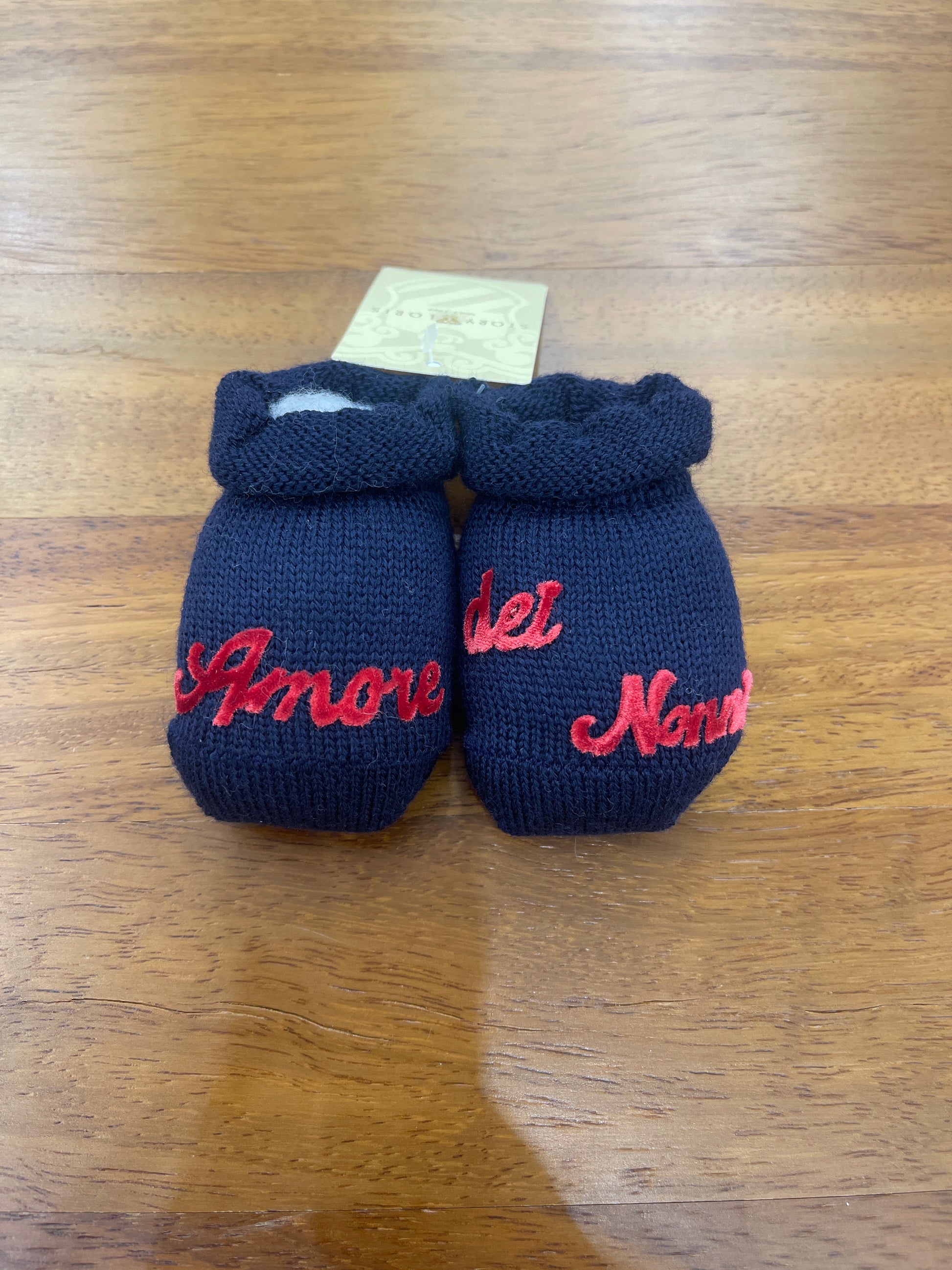 Babbuccine di lana in un delicato colore blu, impreziosite dalla scritta "Amore dei nonni" che celebra il legame speciale tra nonni e nipoti, ideali per mantenere i piedi del bambino caldi con stile e affetto.