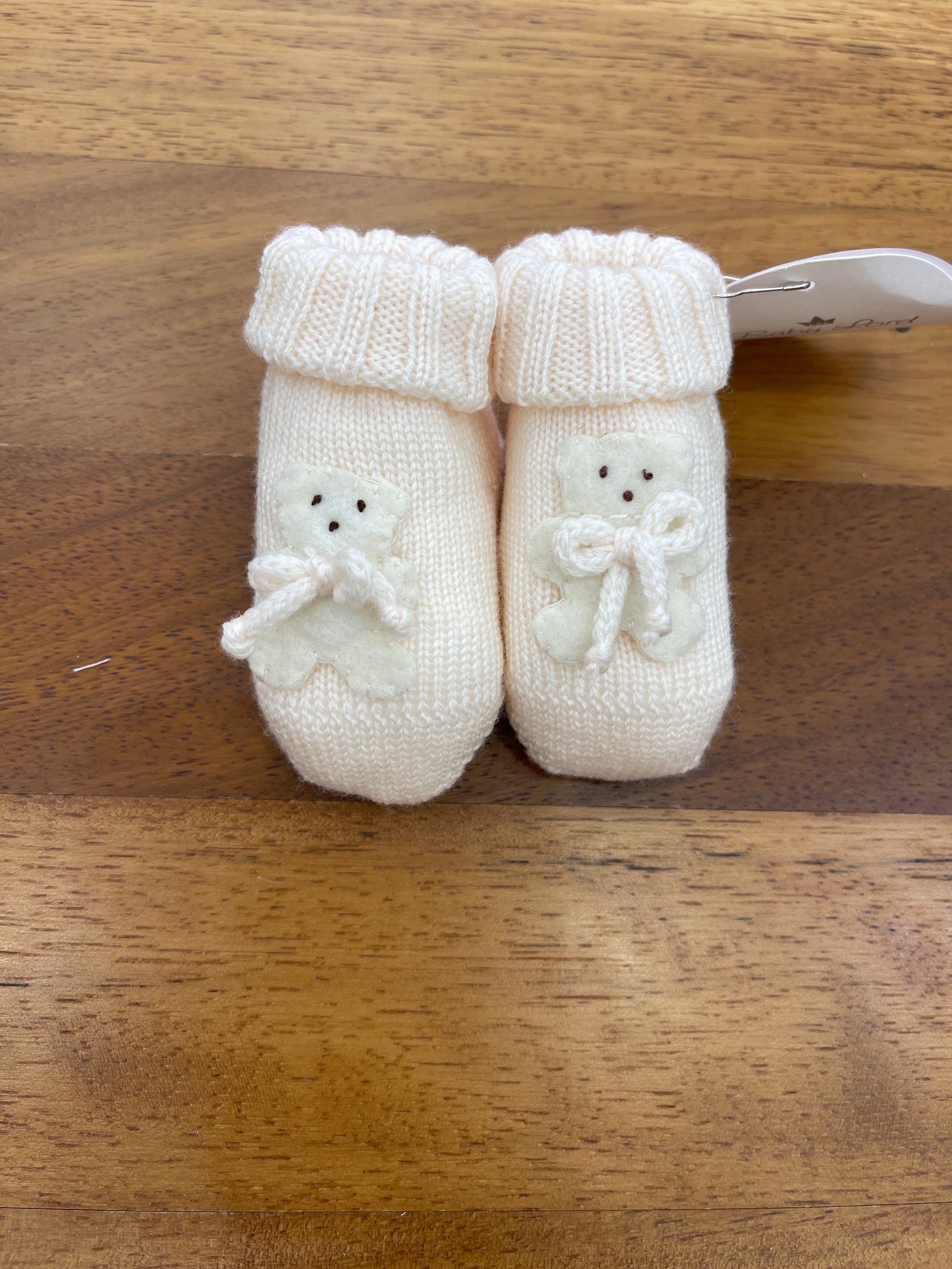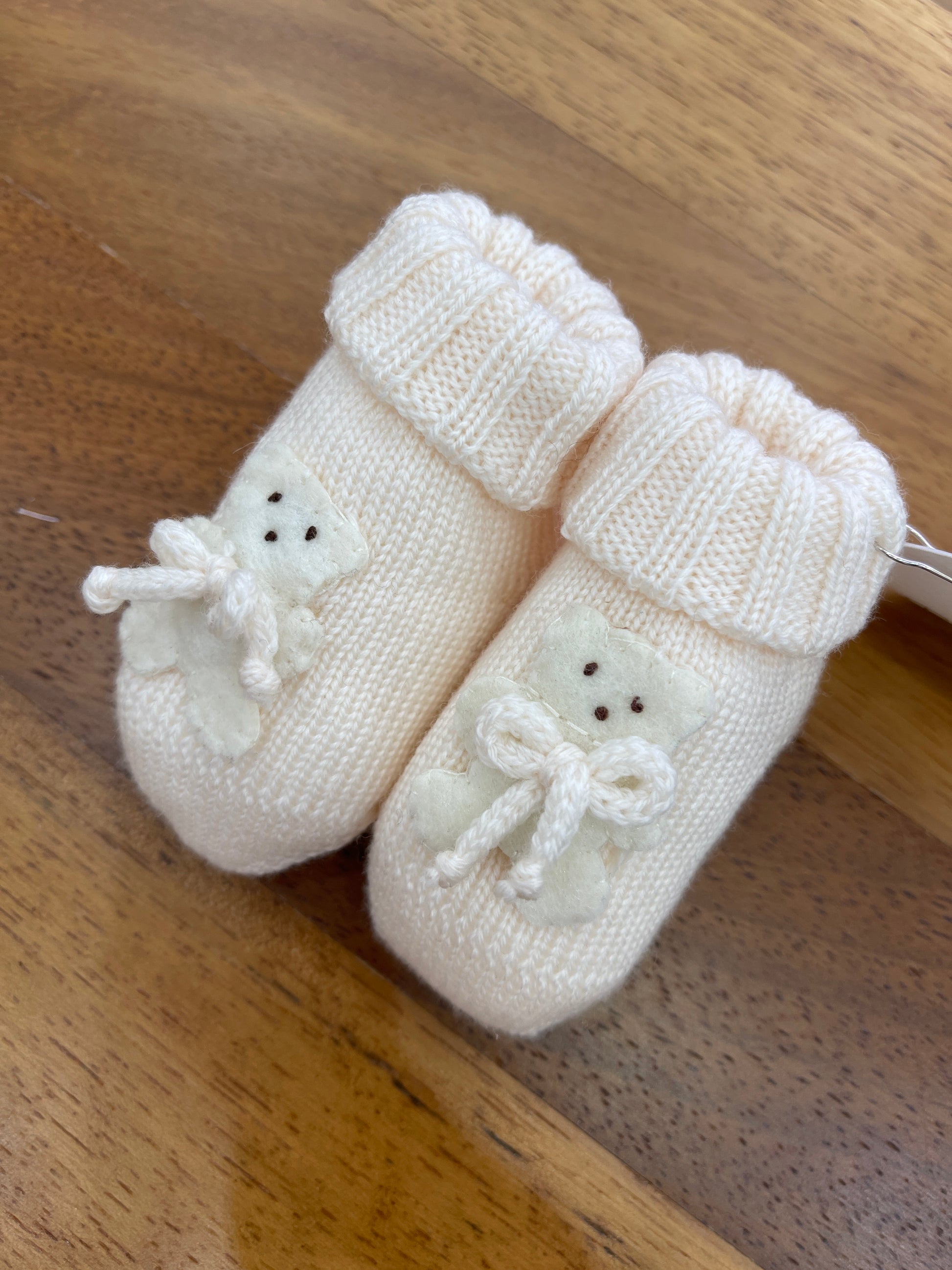 Morbide scarpine in lana dotate di risvolto e decorazione a forma di orsetto, ideali per mantenere i piedini del neonato caldi e protetti con stile.