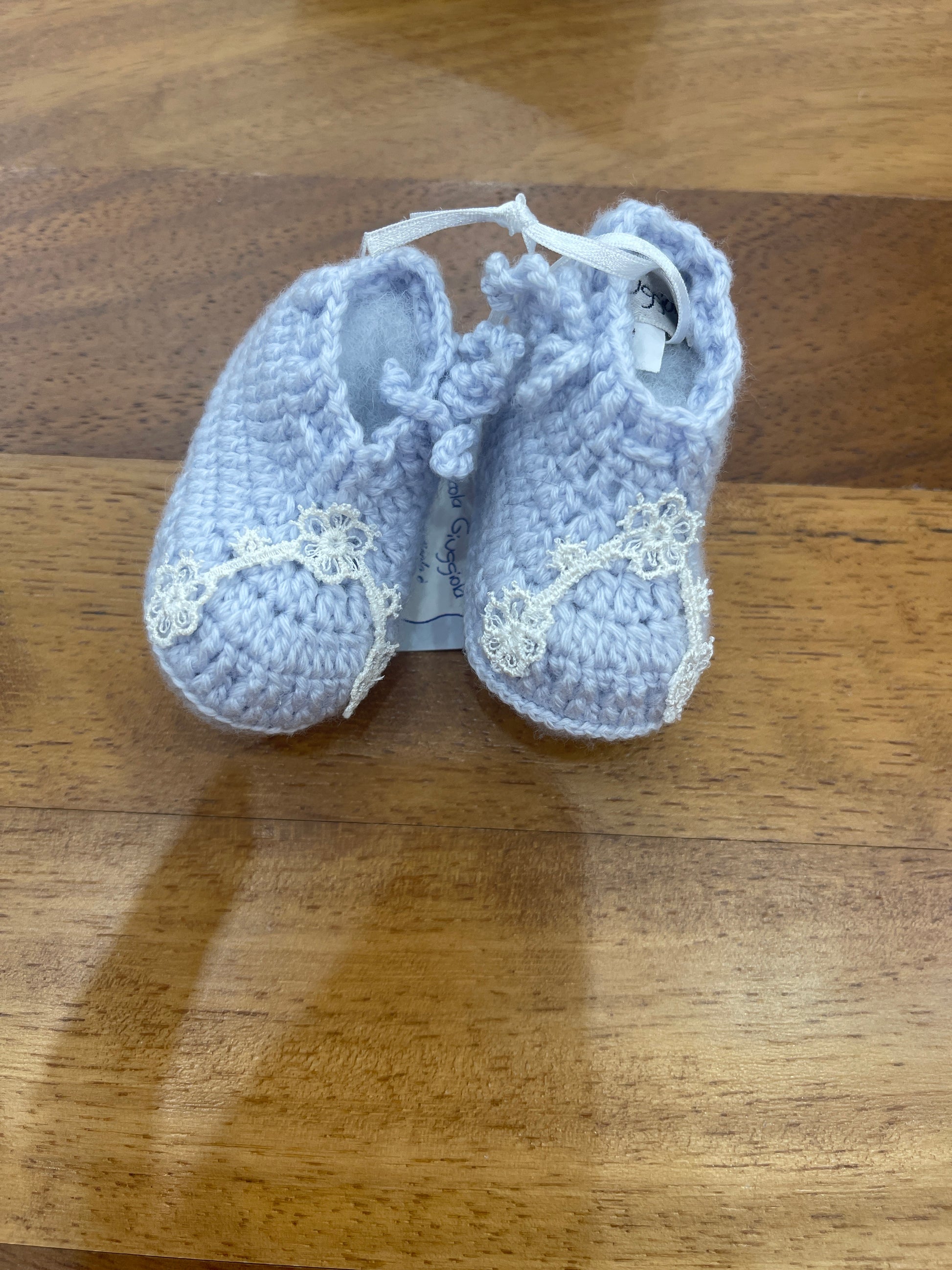 Morbide scarpine in lana color celeste, decorate con un delicato merletto.