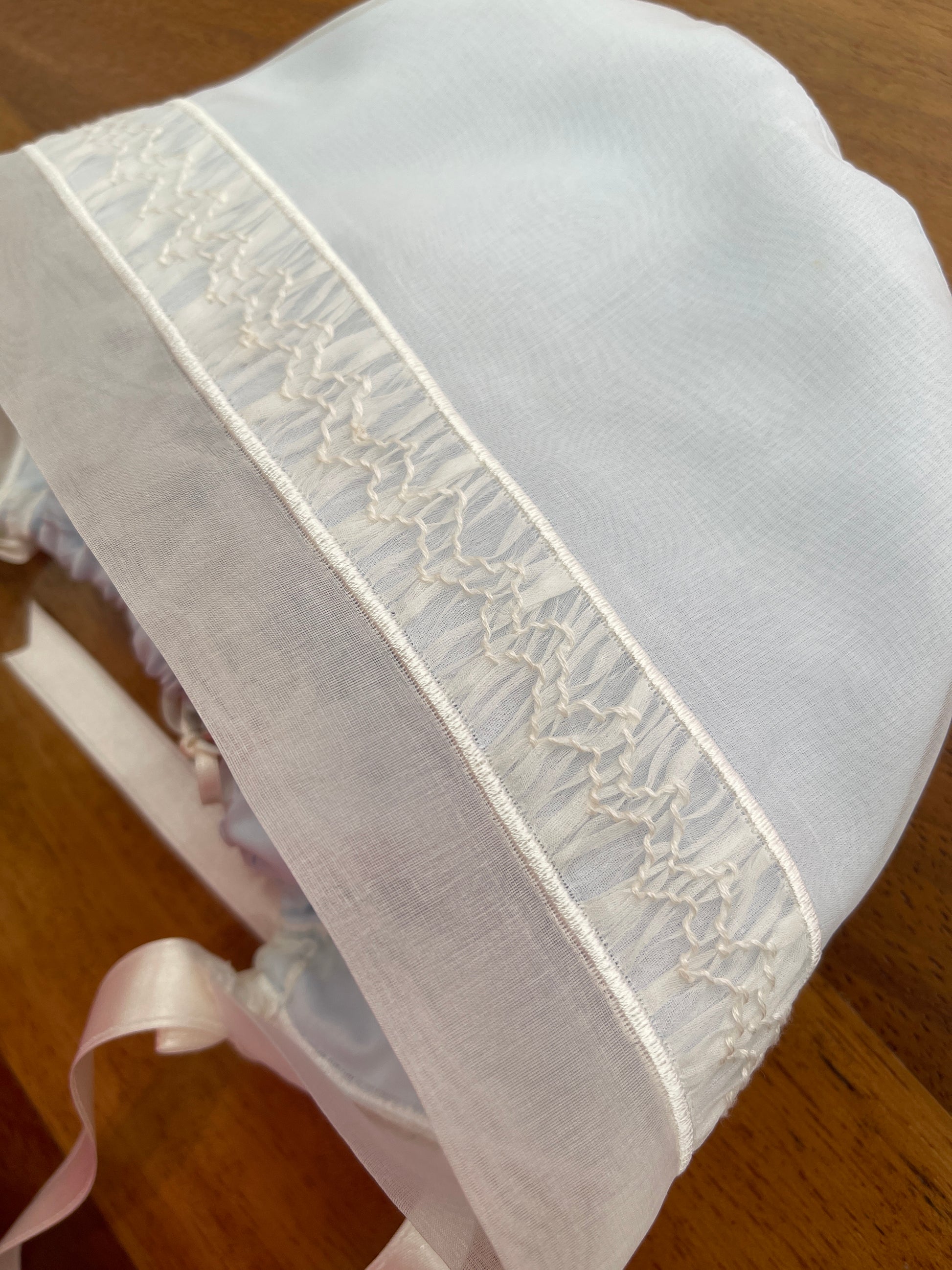 Cuffia in seta organza color cielo, arricchita da una fascia raffinata realizzata con punto smock, completata da una fascia bianca in organza di seta.