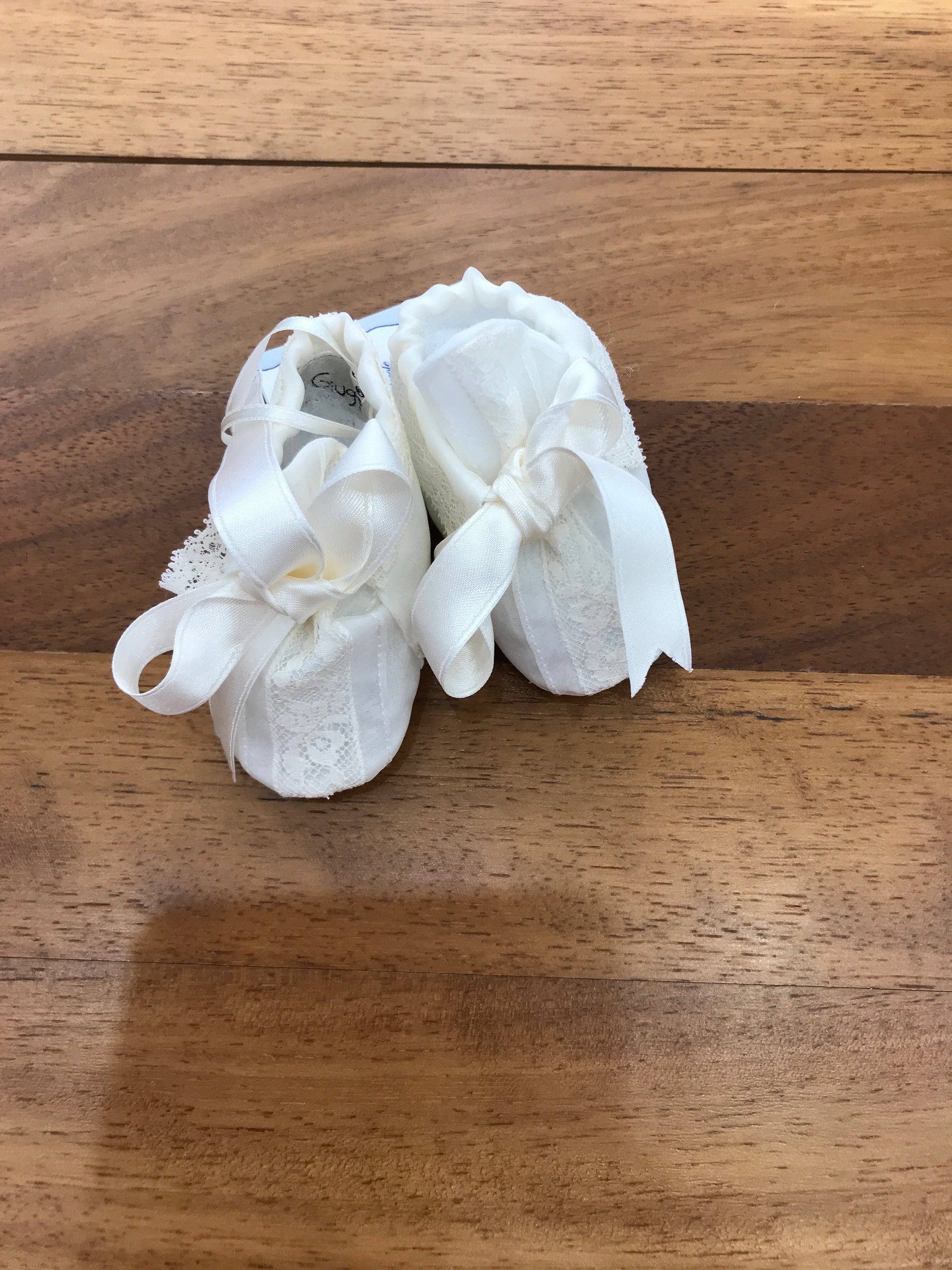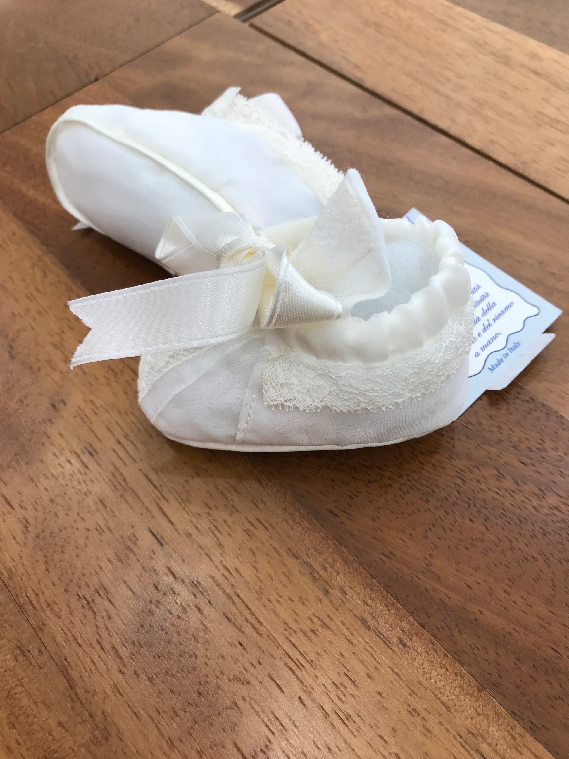 Scarpine realizzate in seta organza color avorio, arricchite da un'applicazione di Valencienne sia sulla parte frontale che sul collo del piede.
