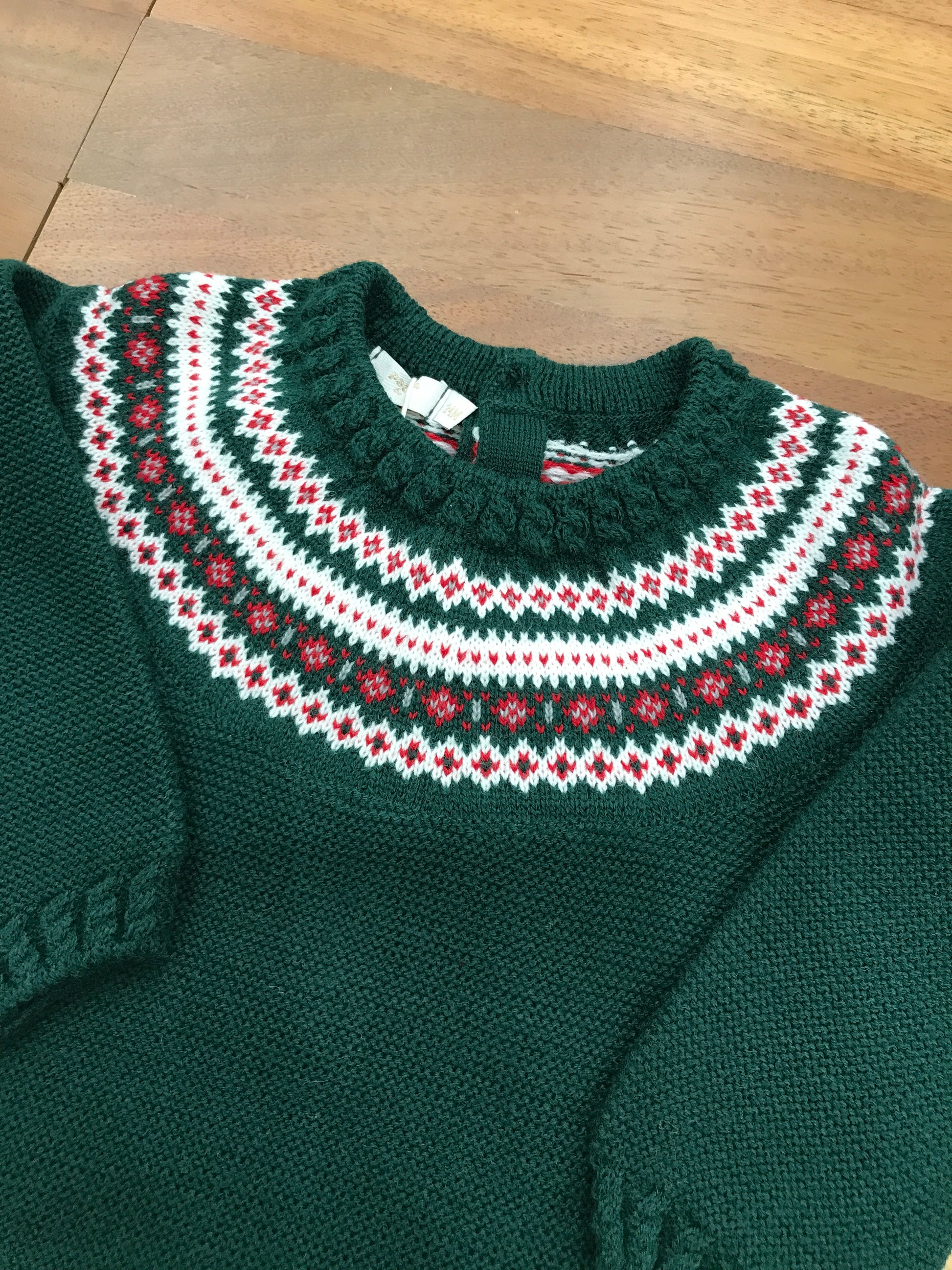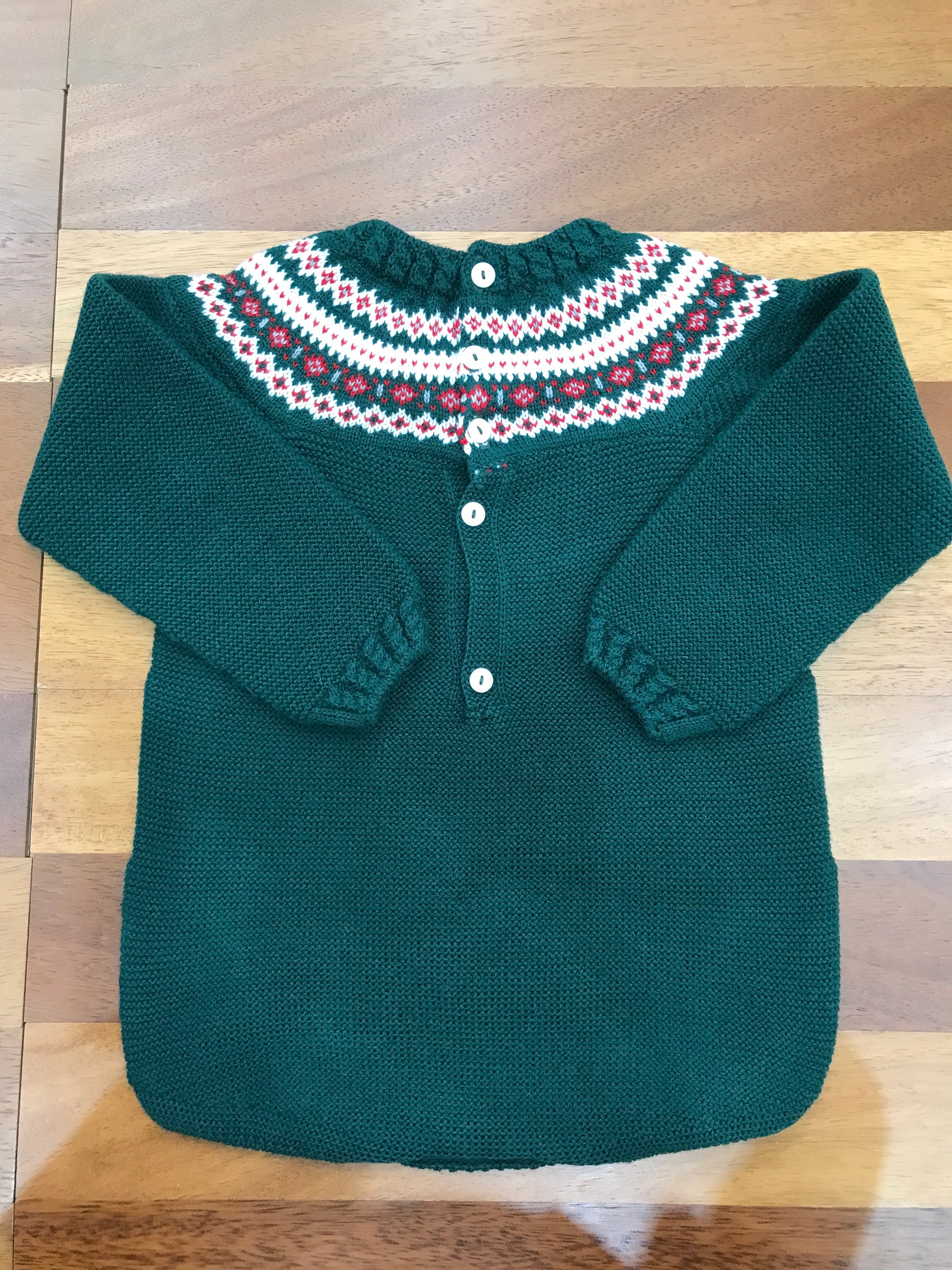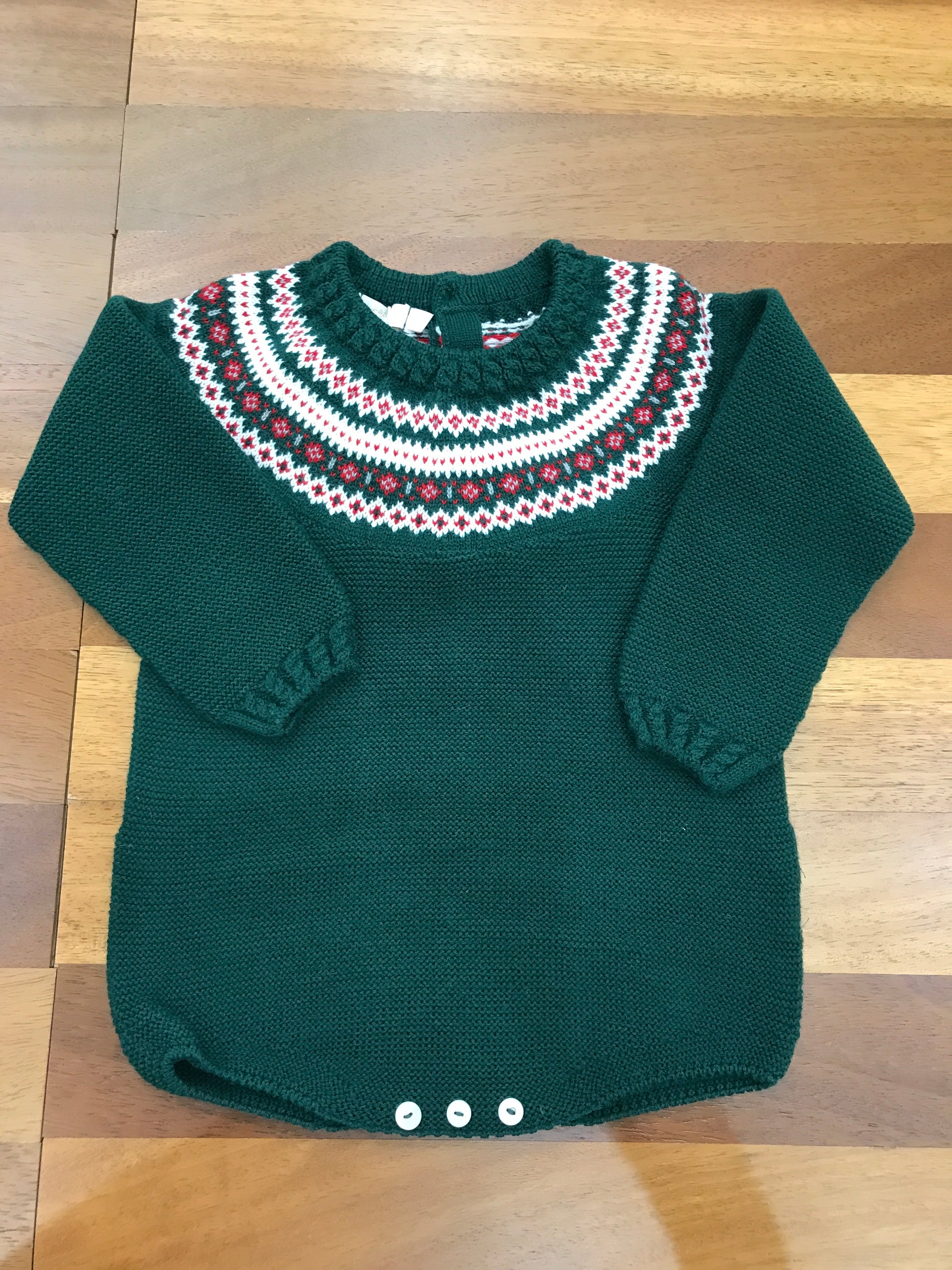 Delicato pagliaccetto in tonalità verde, arricchito da un colletto elegantemente decorato con dettagli rossi e bianchi che conferiscono carattere e raffinatezza al capo. Una scelta sofisticata per i piccoli.