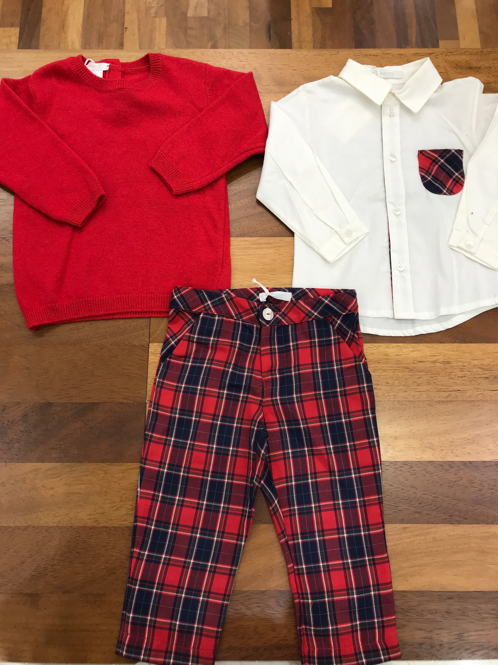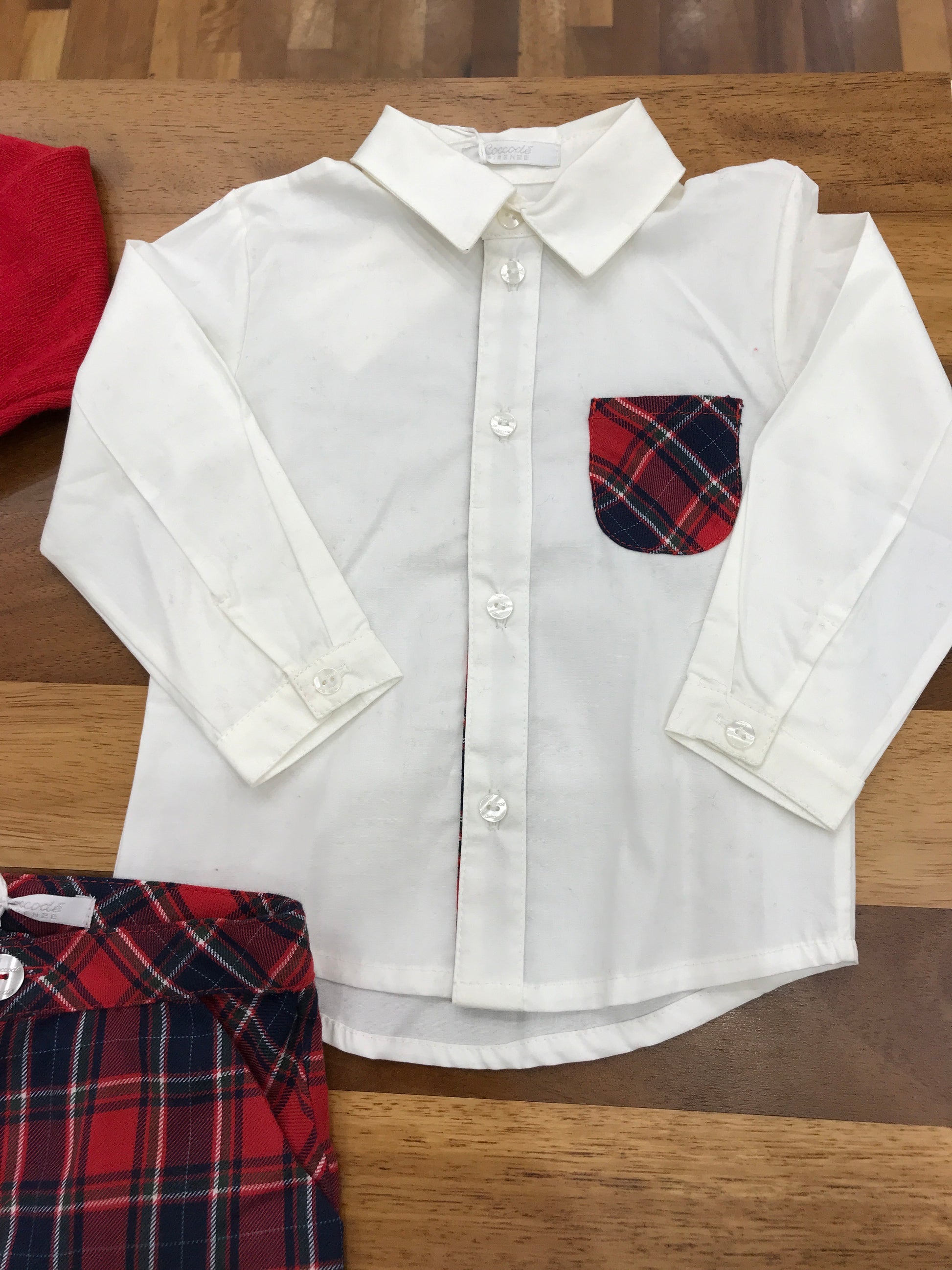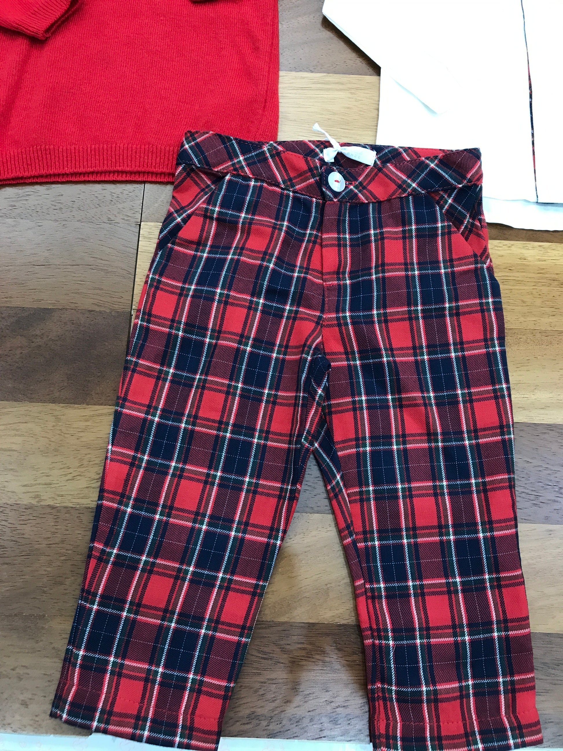 Questo elegante completo Coccodè si compone di tre elementi coordinati: un pantalone lungo con motivo scozzese, una camicetta bianca arricchita da un taschino laterale scozzese e un maglioncino rosso dalla linea essenziale. Un insieme versatile e raffinato, perfetto per creare look sofisticati con facilità.
