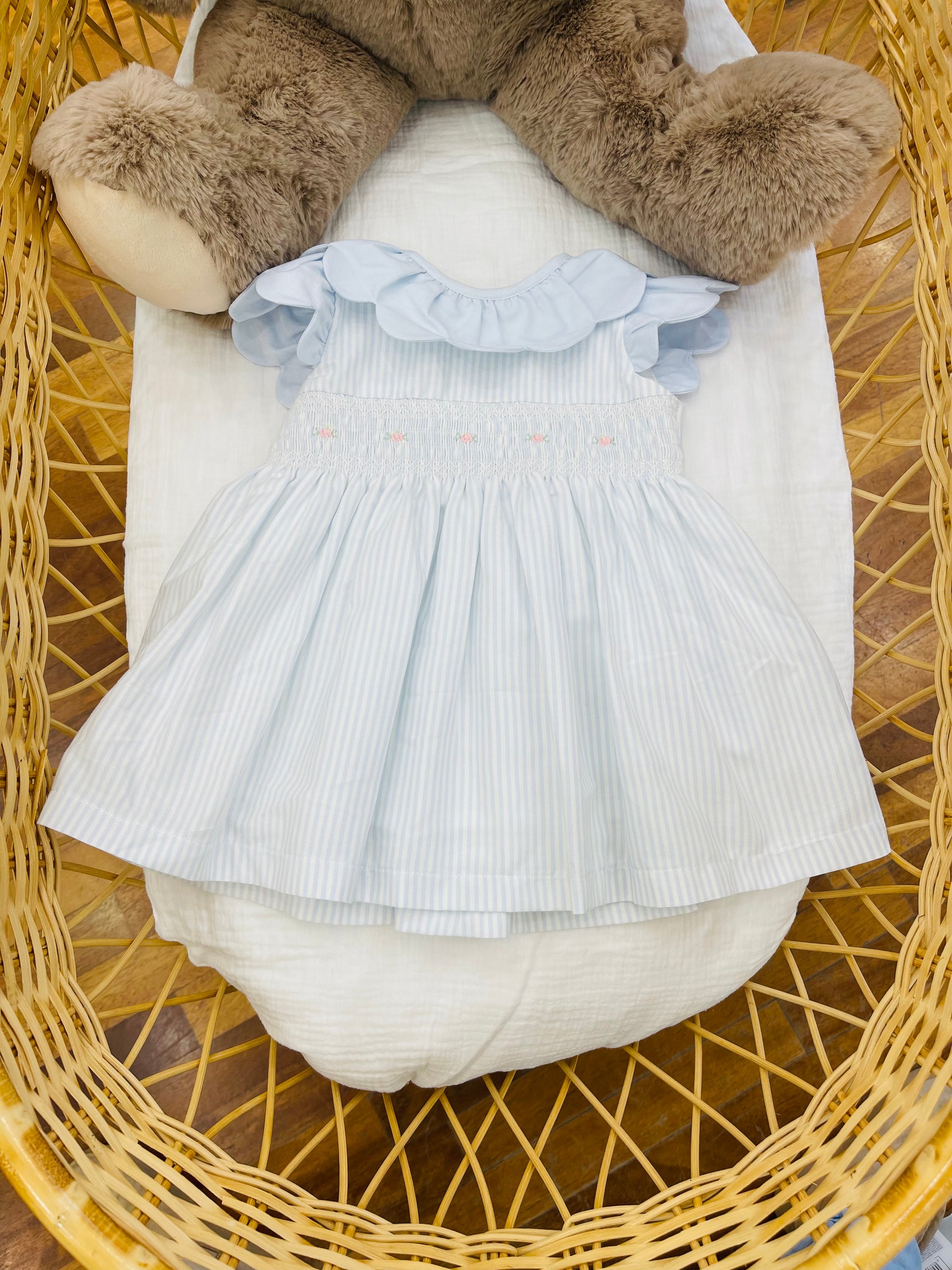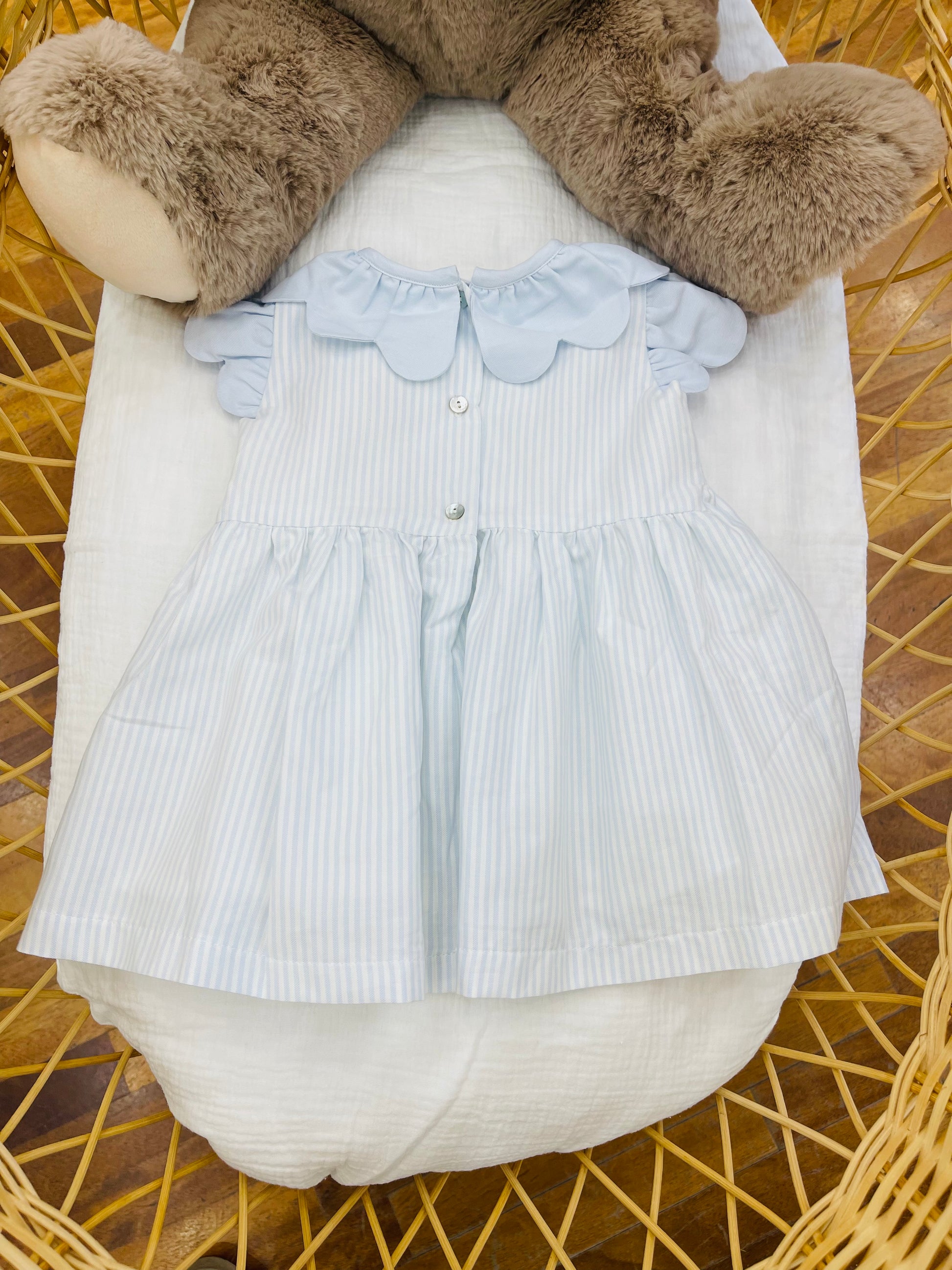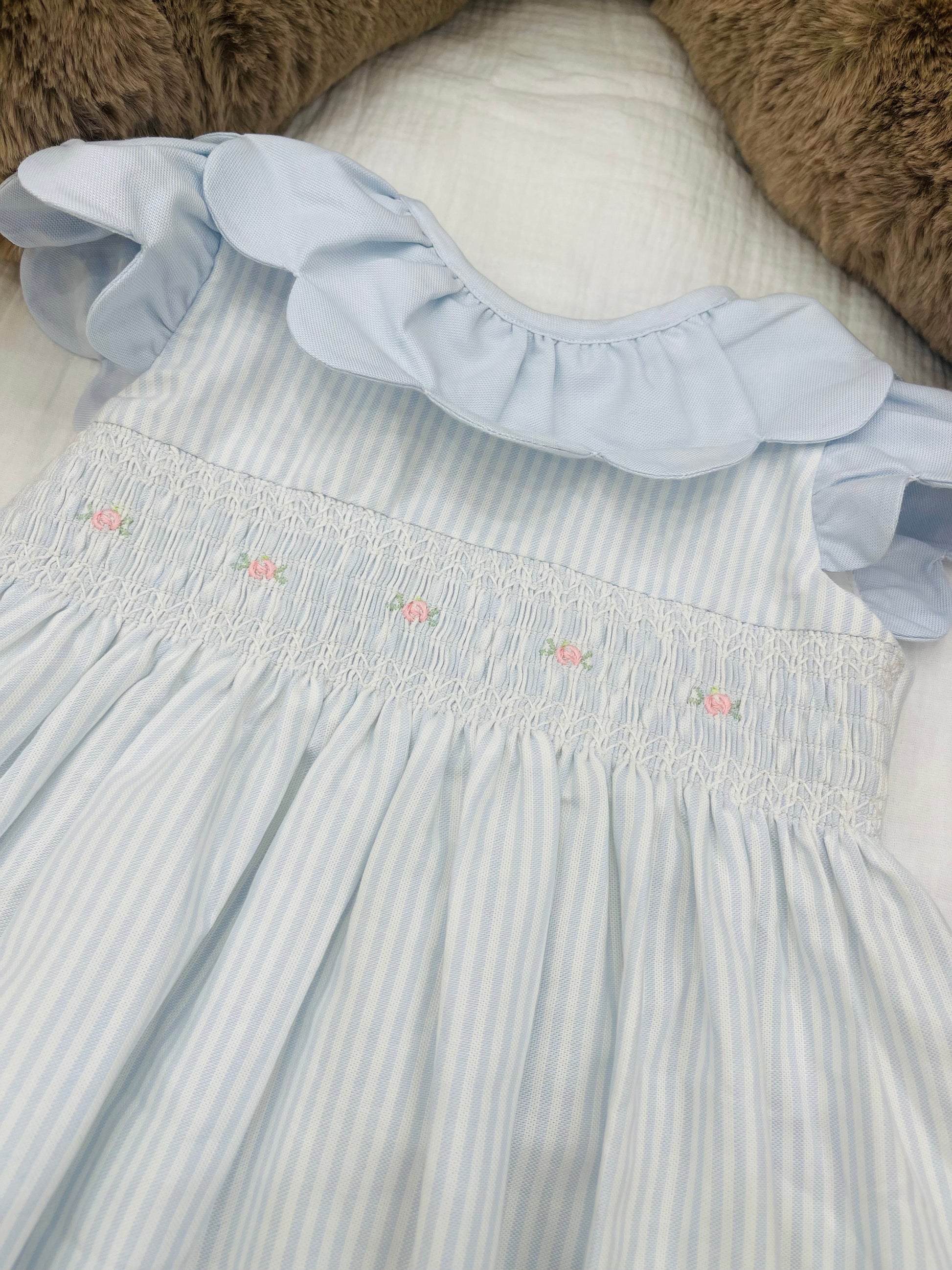 Questo abitino a righe azzurro è perfetto per l'estate! Il suo design smanicato e le eleganti rosselline ricamate con collo e spalline smerlate lo rendono ideale per le giornate calde. Grazie al suo punto smok, si adatta perfettamente alla tua silhouette, garantendo sia comfort che stile.