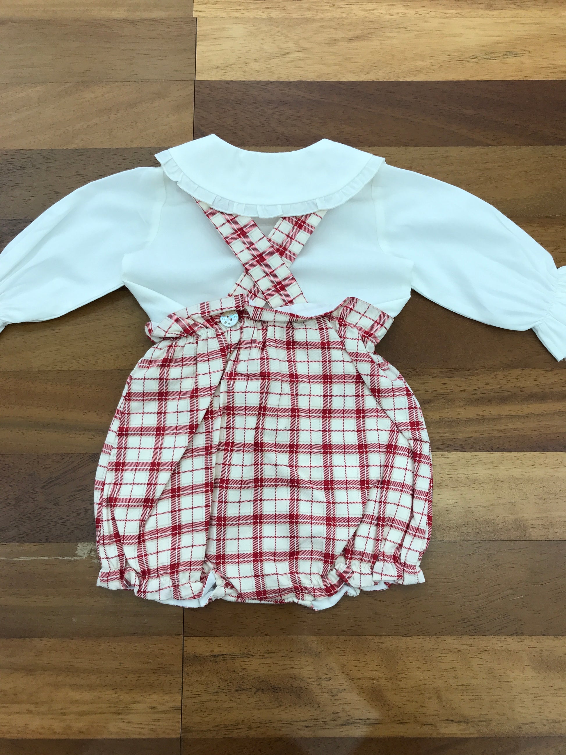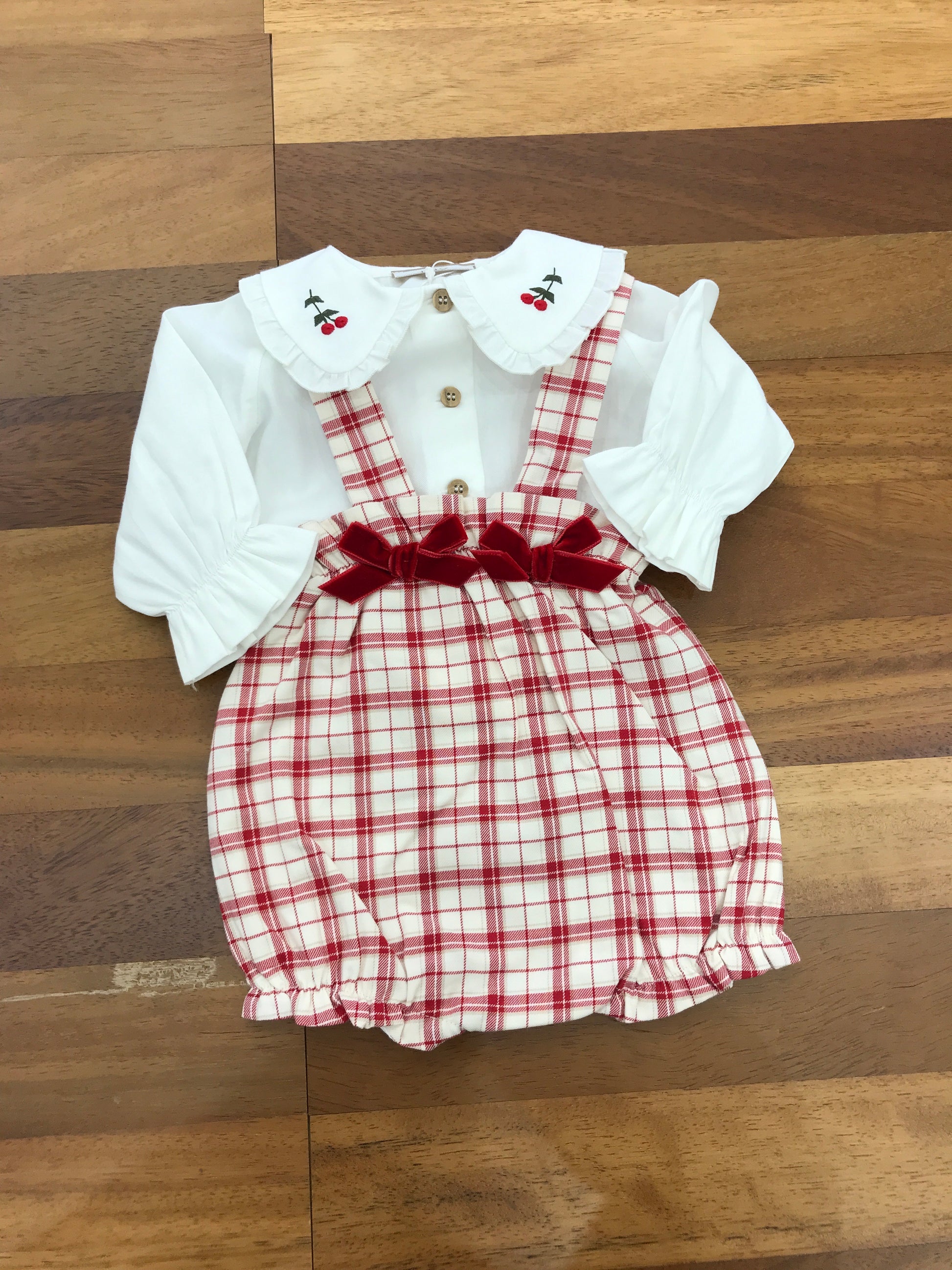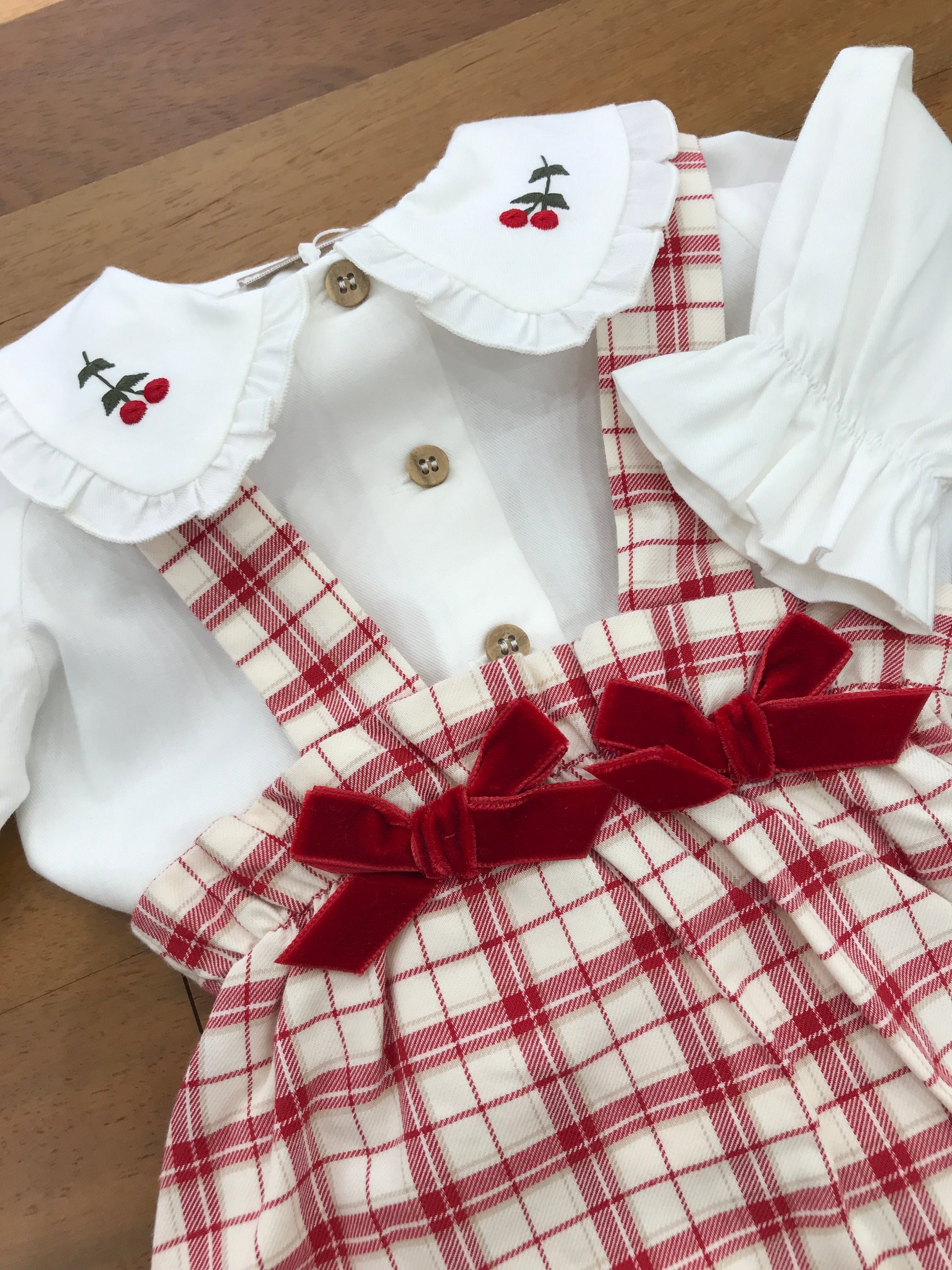 Questo pagliaccetto in lana è abbinato a una camicia con maniche corte arricciate e un colletto decorato con ricami di ciliegie rosse. La parte inferiore, a palloncino e a quadretti, è impreziosita da due fiocchetti in velluto rosso sul davanti. Sul retro presenta una chiusura incrociata, che aggiunge un tocco di eleganza e praticità.