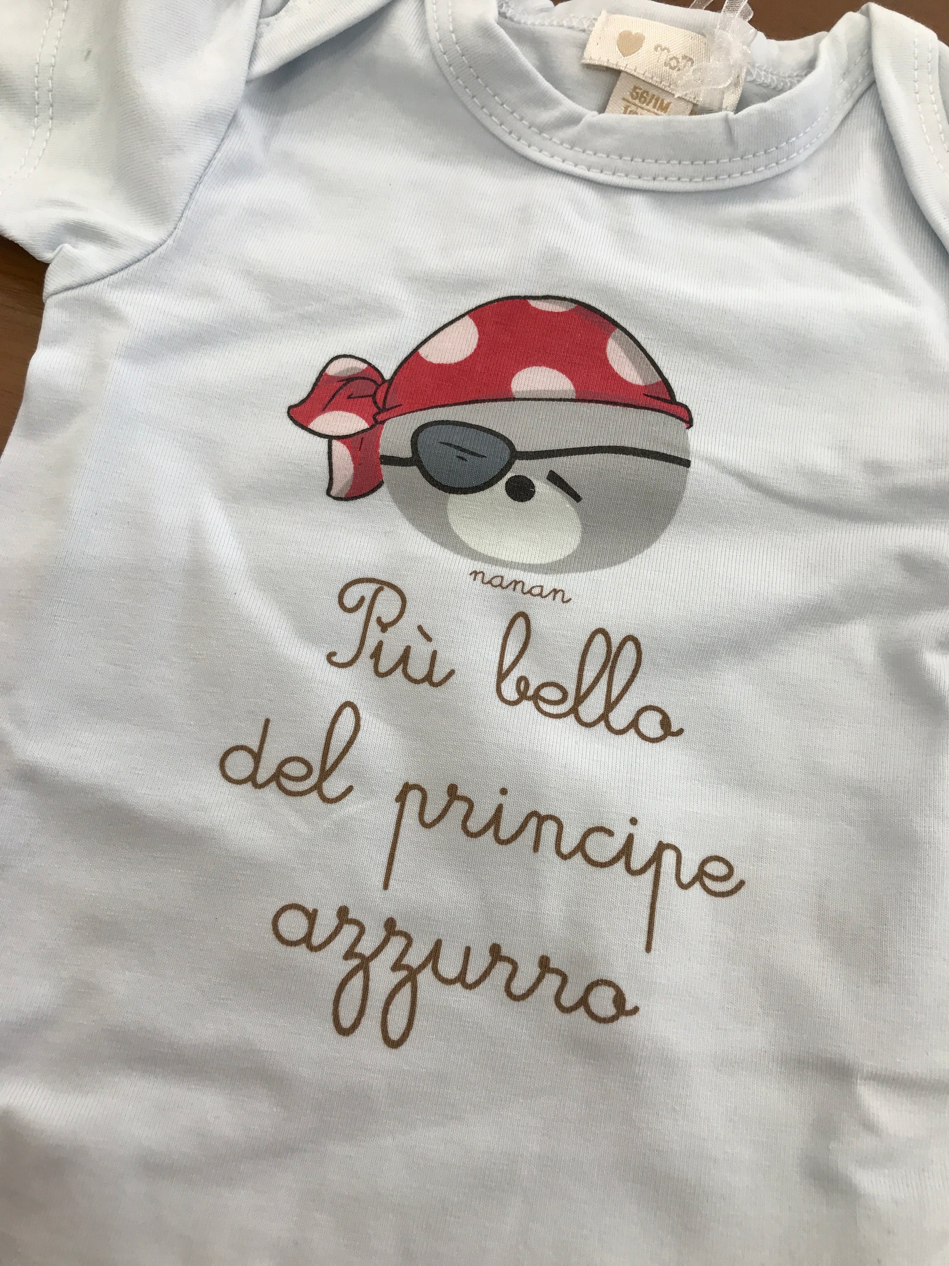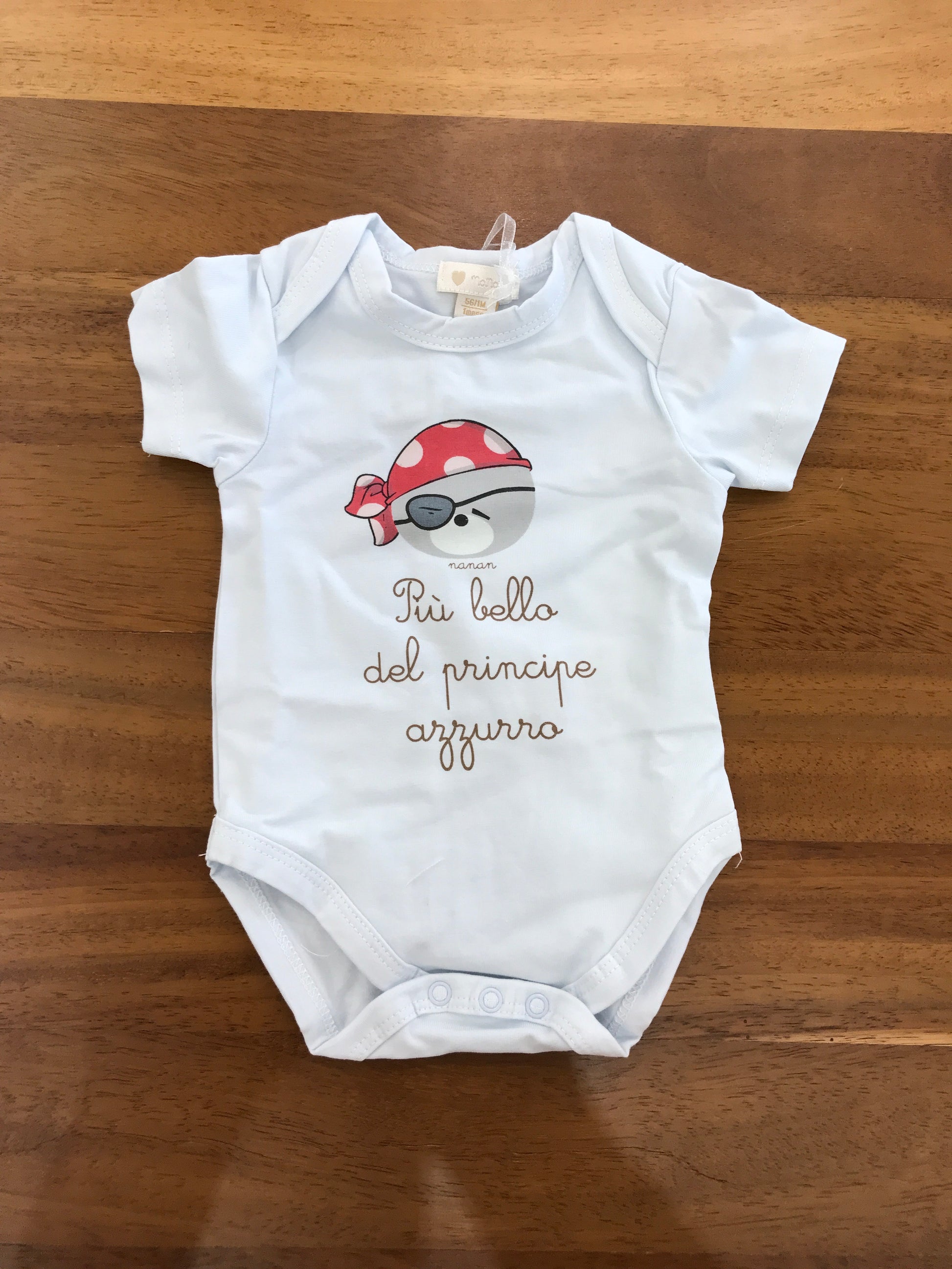 Body intimo di tonalità celeste, impreziosito dalla scritta "più bello del principe azzurro" e decorato con l'immagine di un orsetto che indossa una bandana, un dettaglio che aggiunge un tocco di dolcezza e originalità al capo.