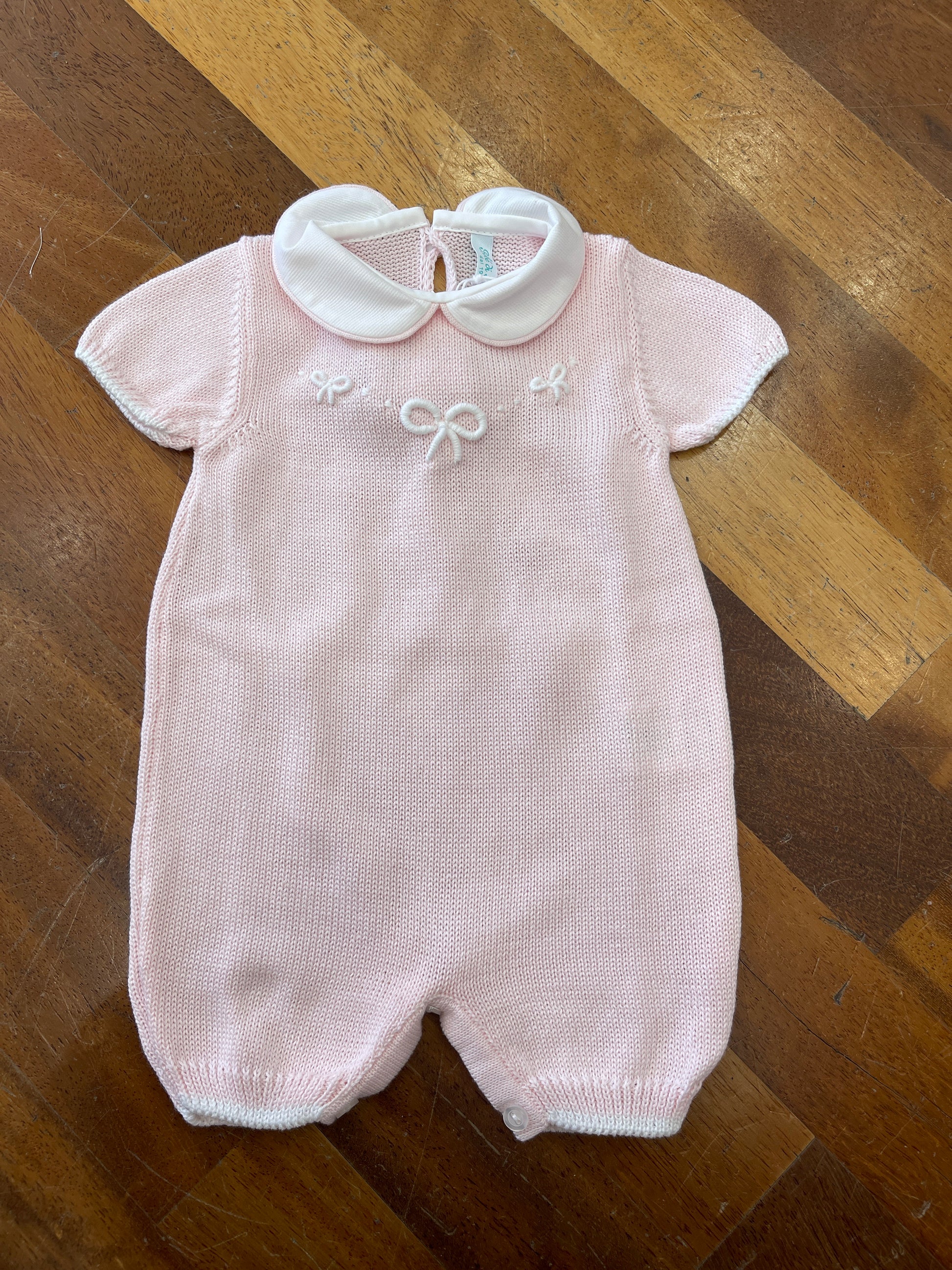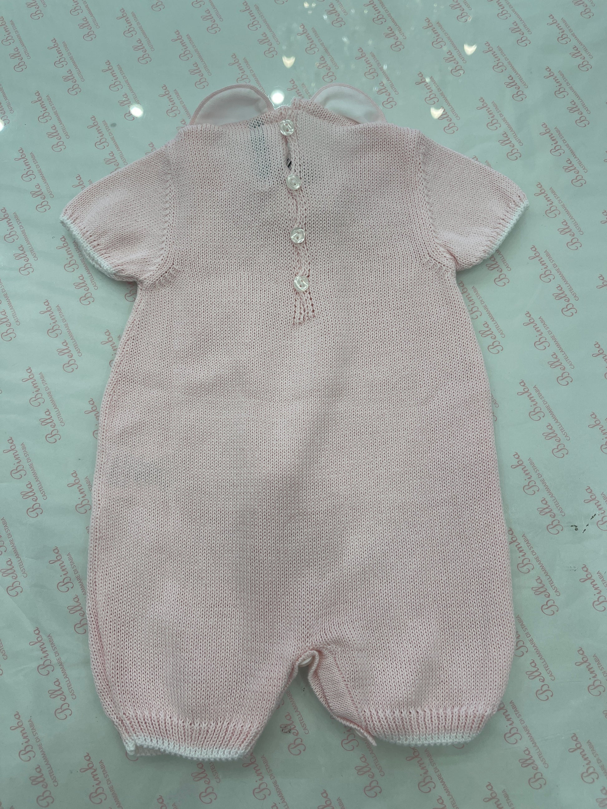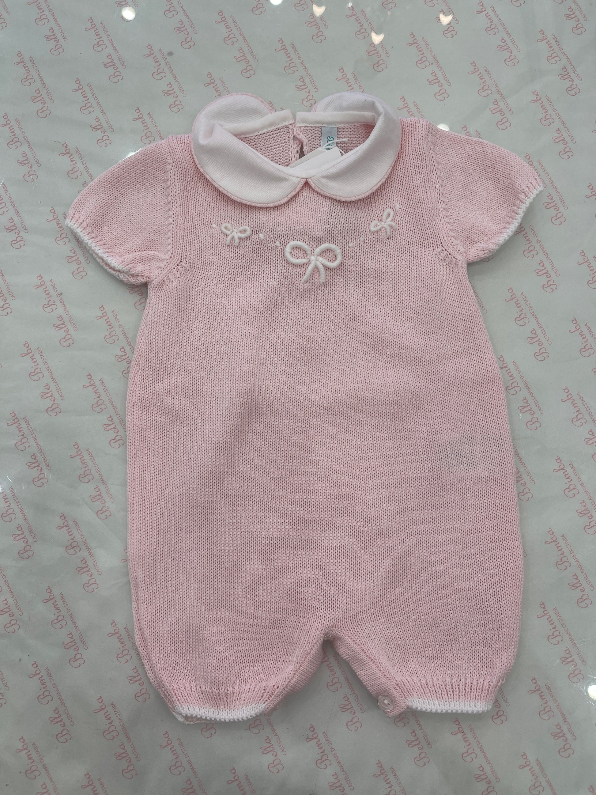 Il Pagliaccetto Bebè di Almy è realizzato in morbido filo rosa, presenta un delicato ricamo a nodo d'amore, rendendolo un capo romantico ed elegante. Aggiungi un tocco di dolcezza e stile ai suoi outfit con questo pagliaccetto.