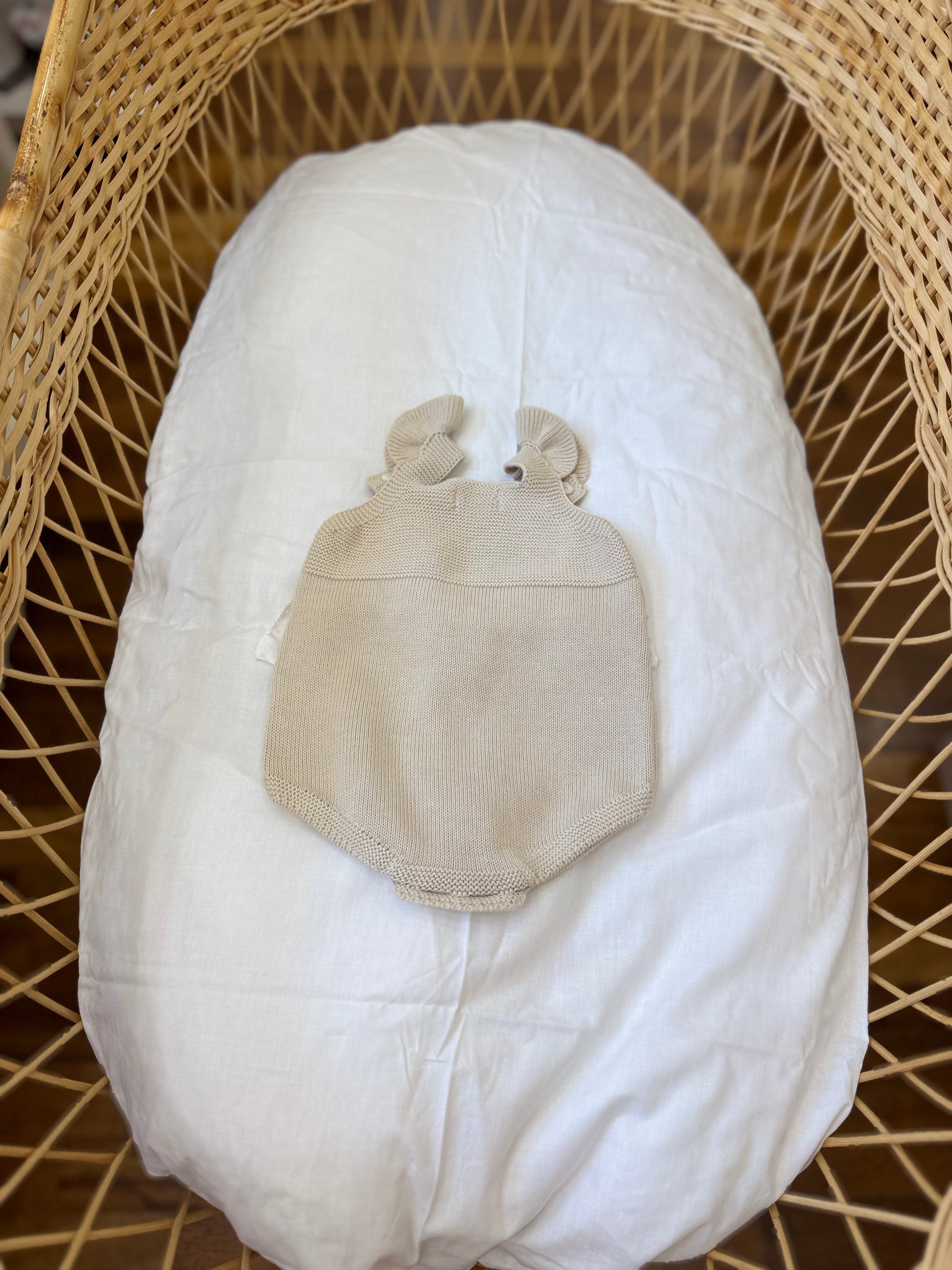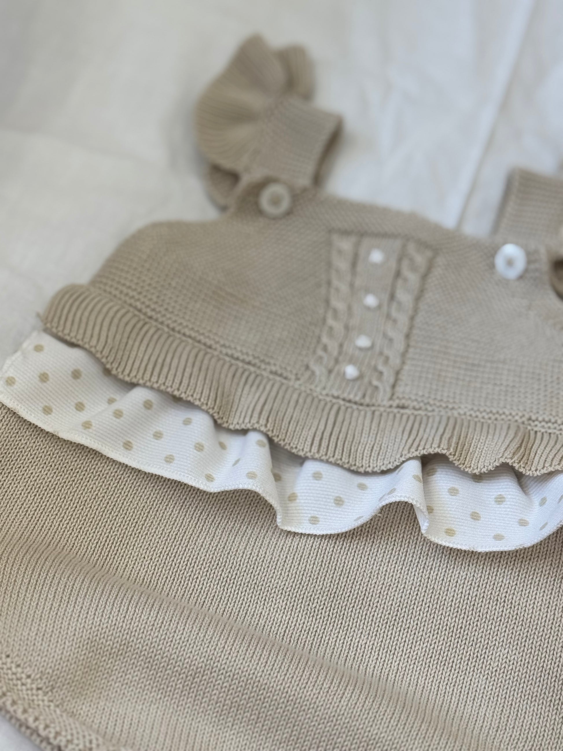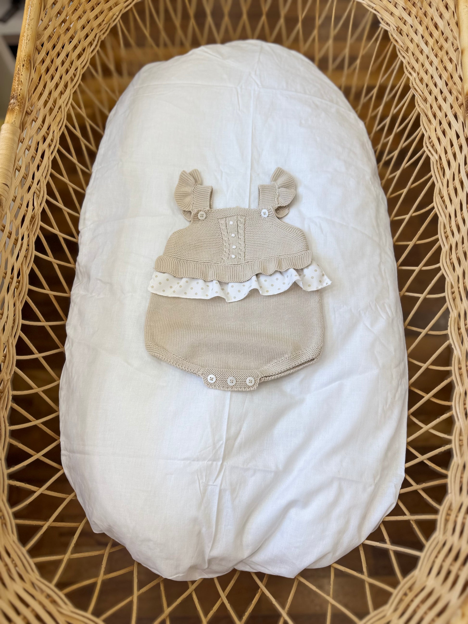 Semplice ed elegante, il pagliaccetto PCS per bambini è realizzato in morbido cotone beige e arricchito da una graziosa rouche centrale a pois. Perfetto per i più piccoli, ma adatto anche per i più grandi