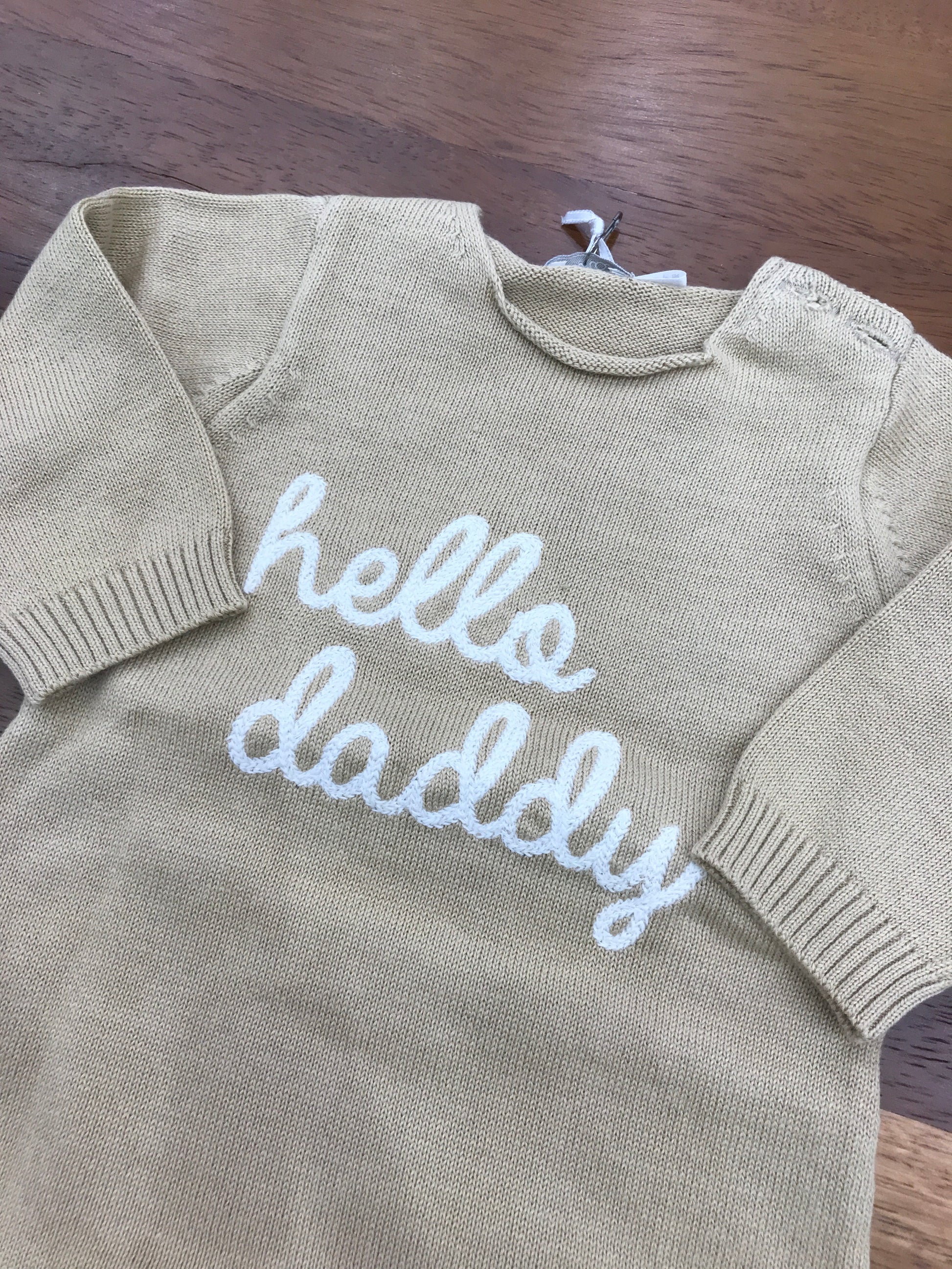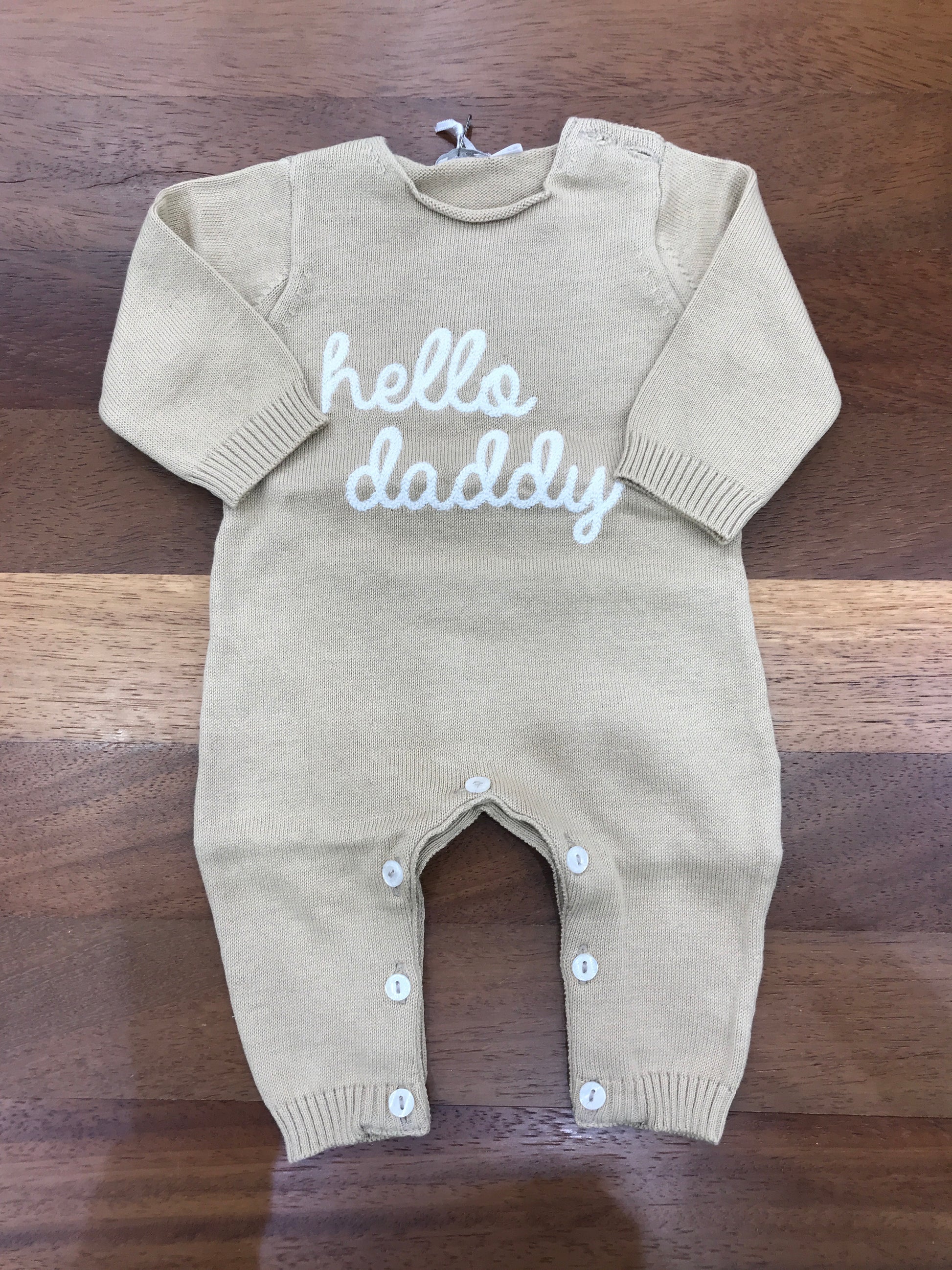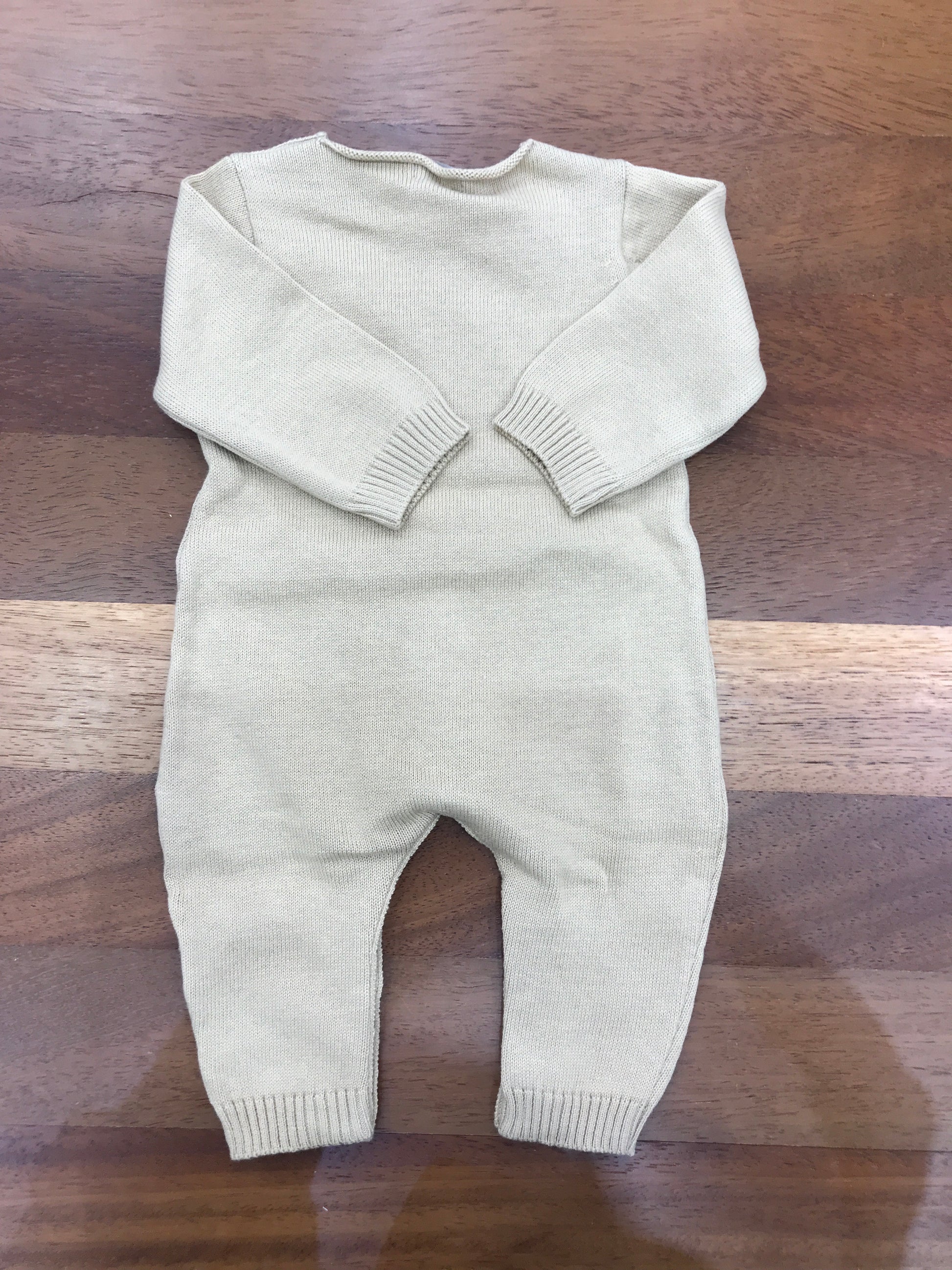 Elegante tutina intera realizzata in pregiato filo di cotone, caratterizzata da una tonalità beige naturale e impreziosita da una scritta decorativa in bianco posizionata al centro. Un capo versatile e raffinato, perfetto per le occasioni speciali dei più piccoli, che combina comfort e stile con semplicità.