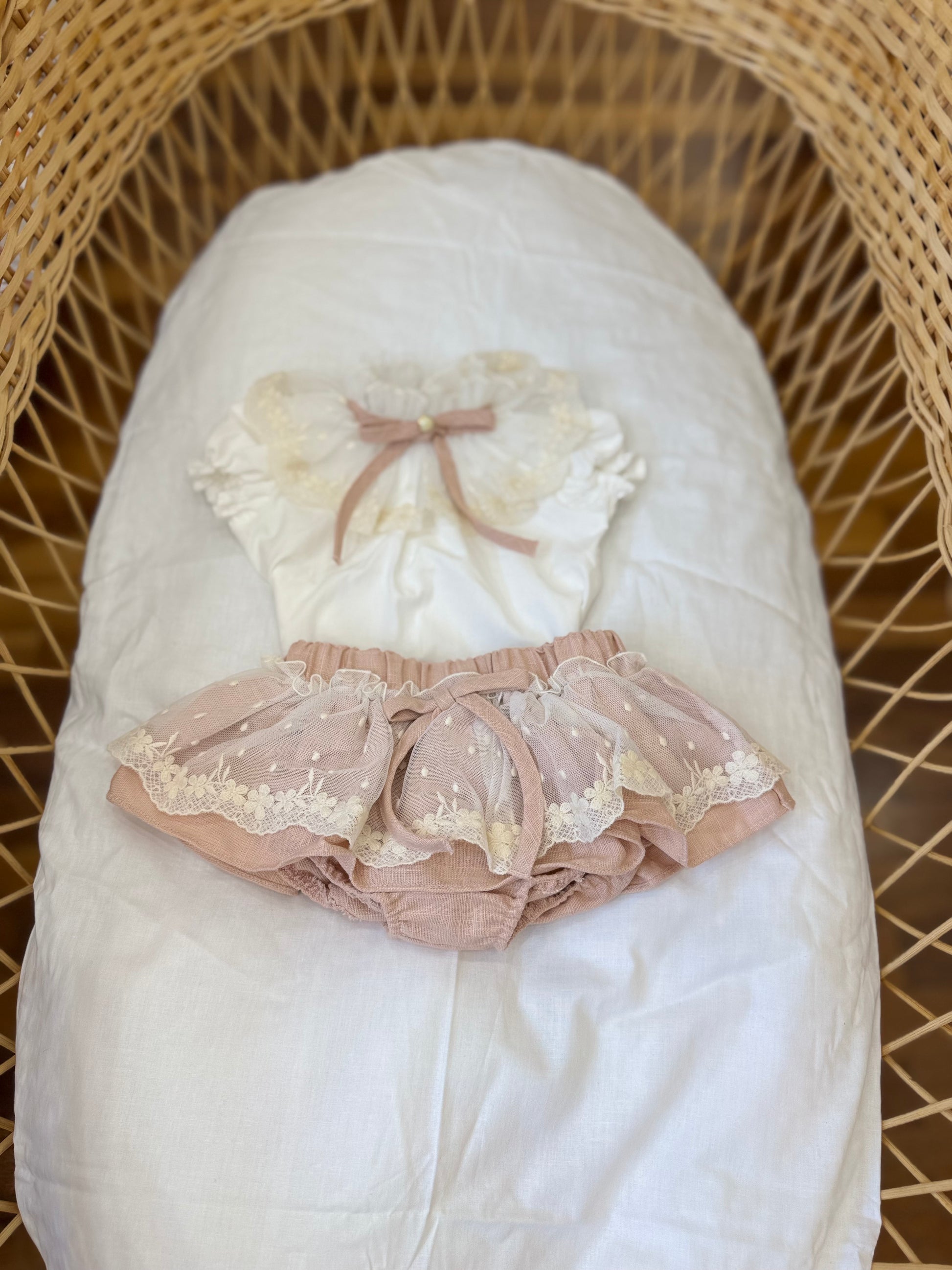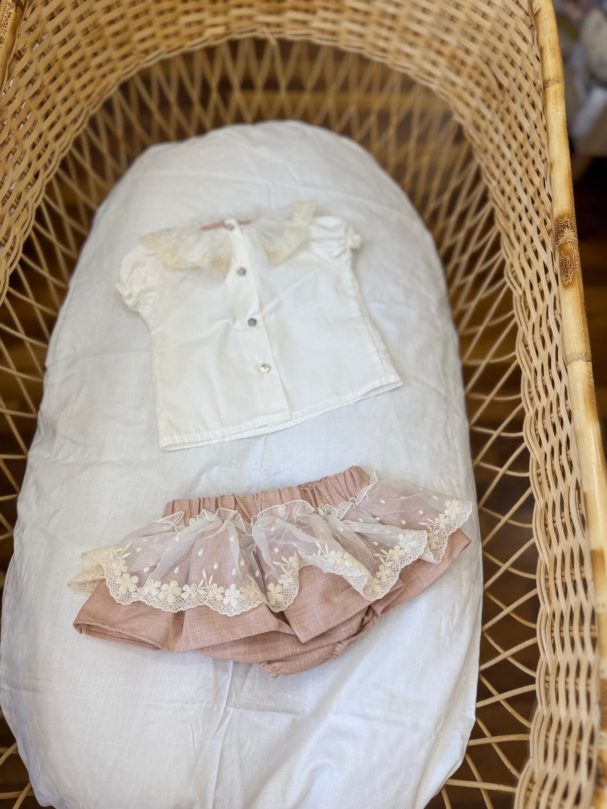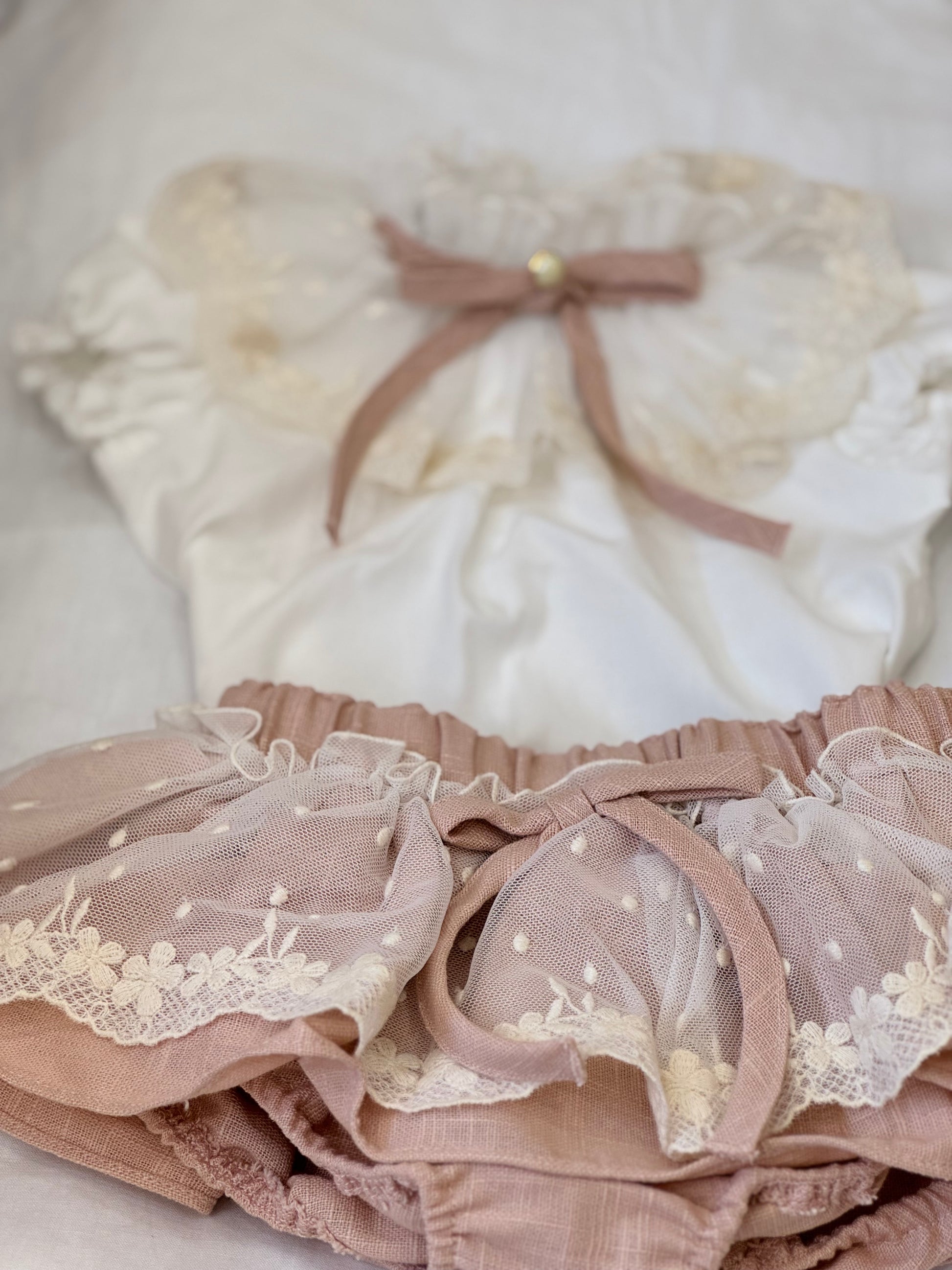 Il completino fofettes è ideale per far sentire la tua femminuccia come una principessa. Composto da un incantevole culotte in lino rosa antico con rouches di pizzo avorio, abbinato ad una camicia panna con collo e rouche in pizzo. Un delizioso set che unisce comfort e stile per la tua bambina.