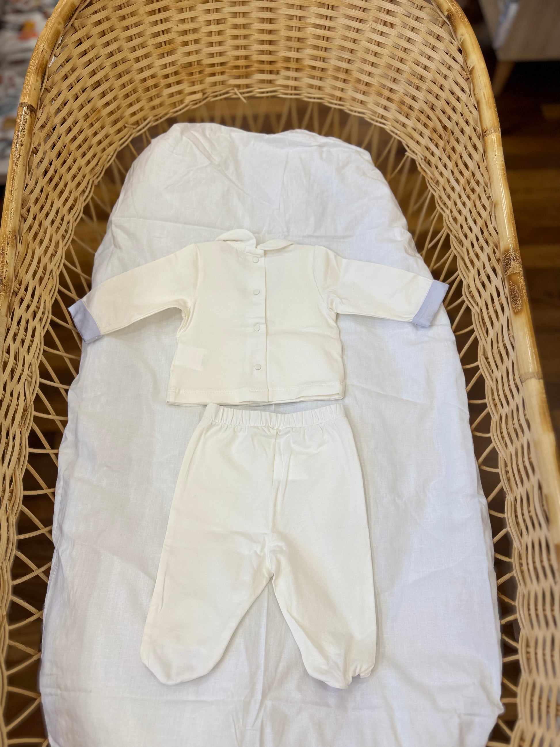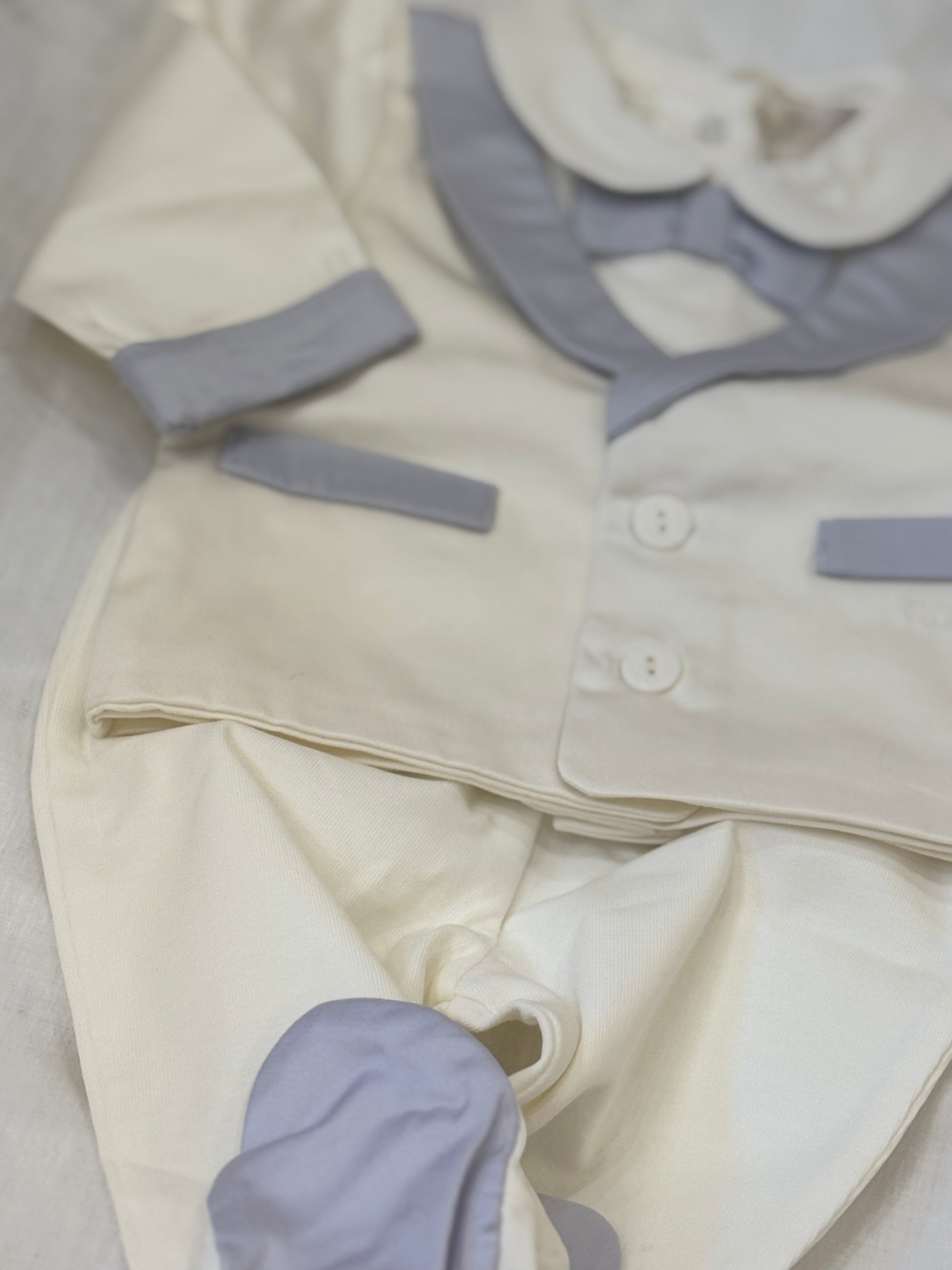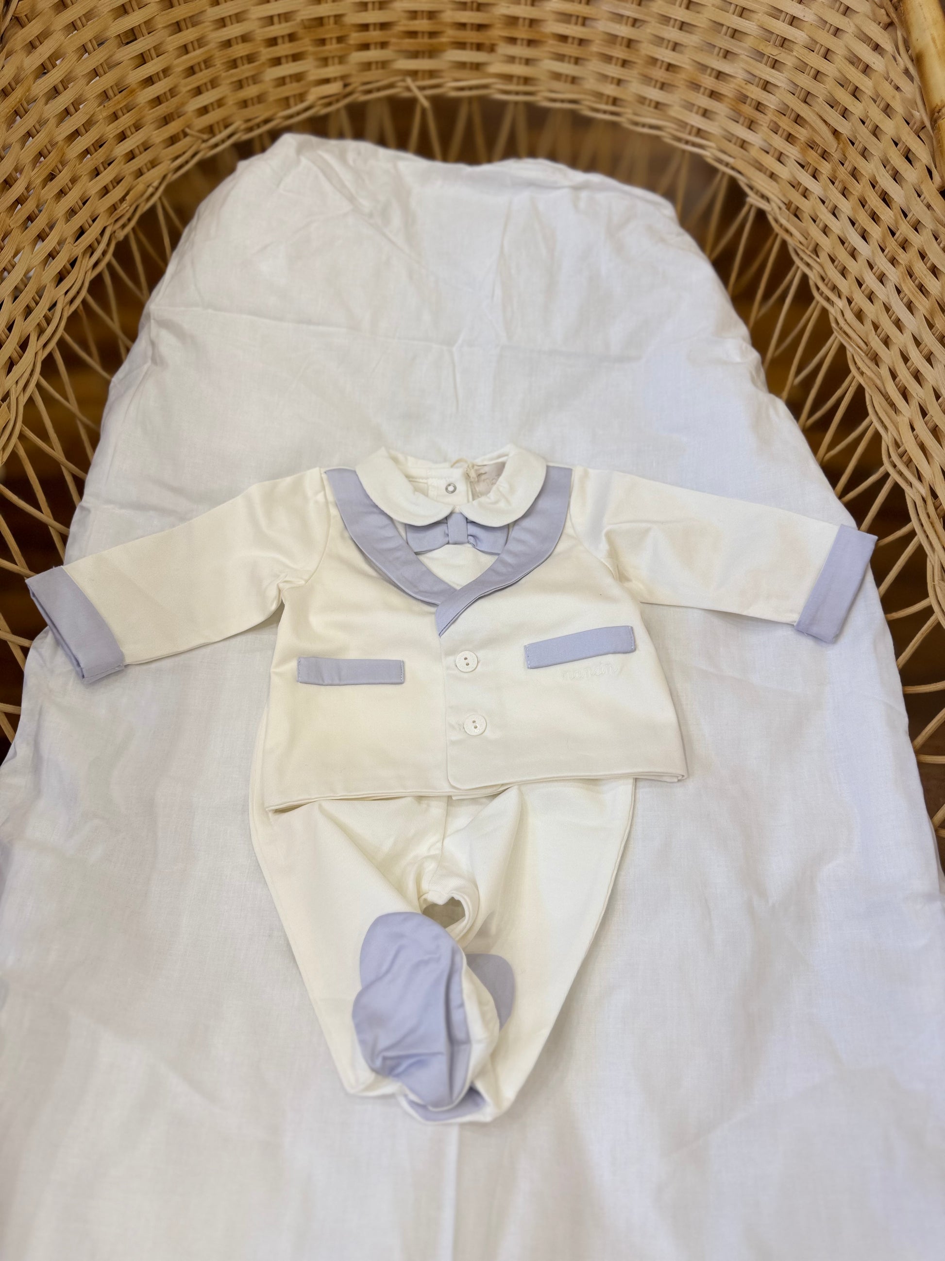 Questo completino Nanan è perfetto per le mamme che vogliono uno stile originale per i loro bambini sin dai primi giorni. Il pantalone con piedini e la maglia seguono lo stile di uno smoking,con dettagli color cielo rendendo il vostro bambino elegante e confortevole.