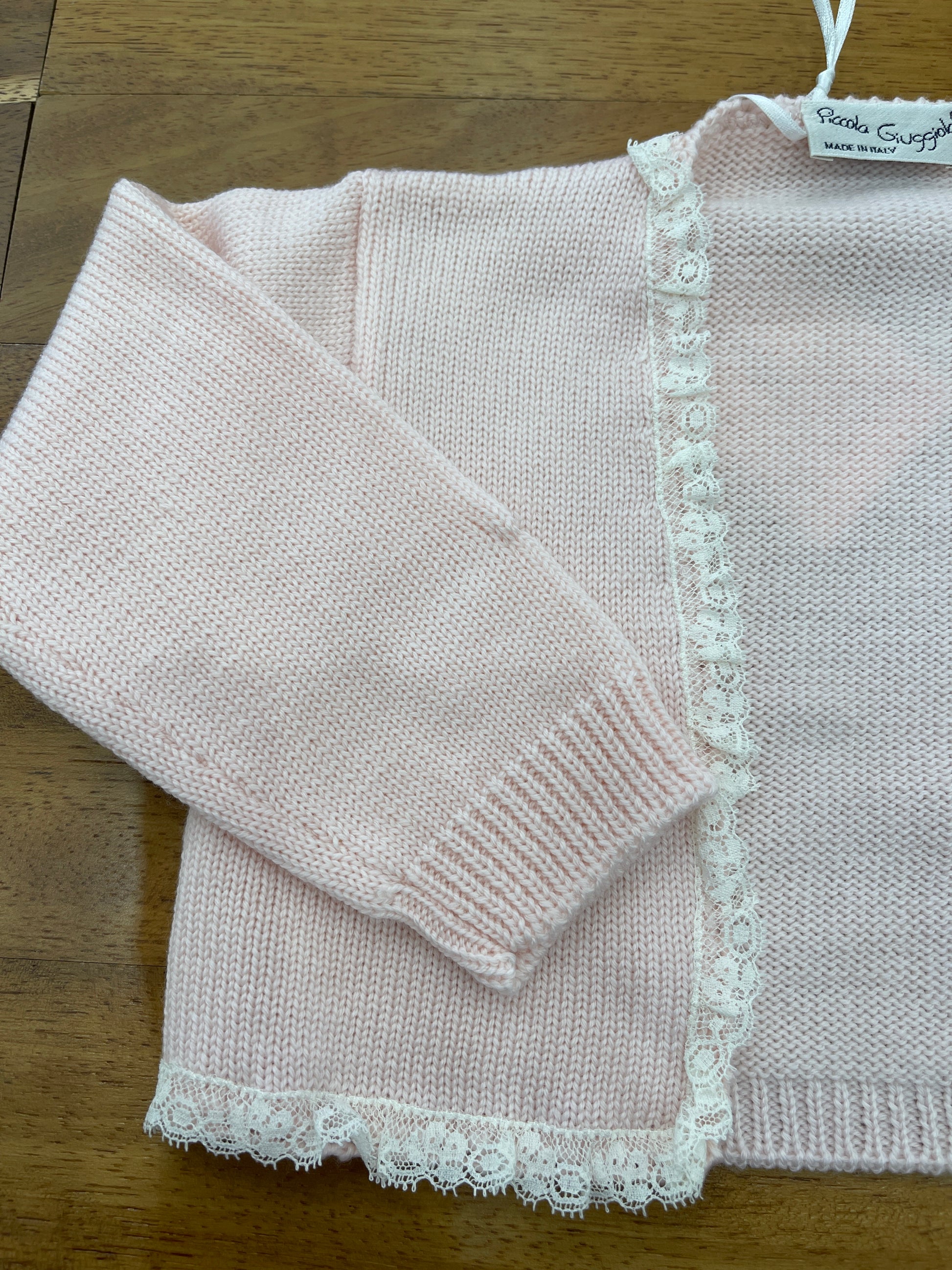 Cardigan rosa realizzato in lana, arricchito da dettagli in Valencienne.