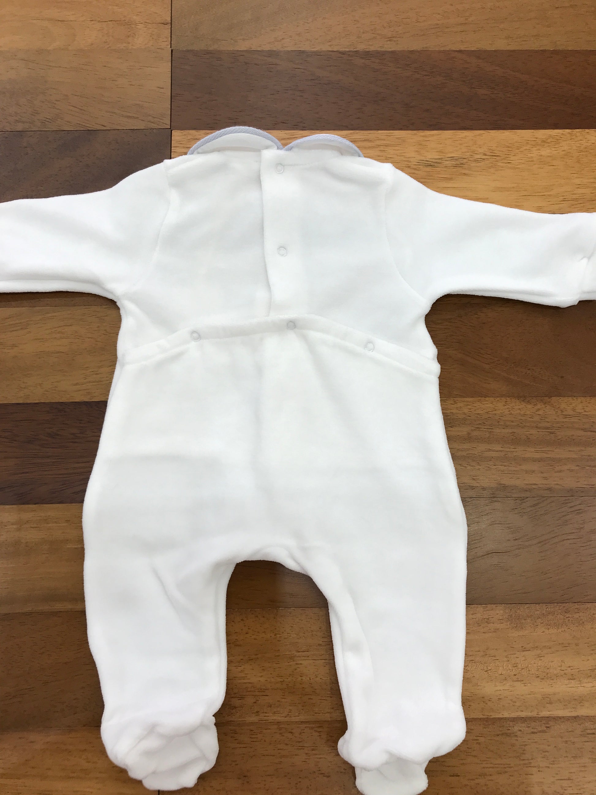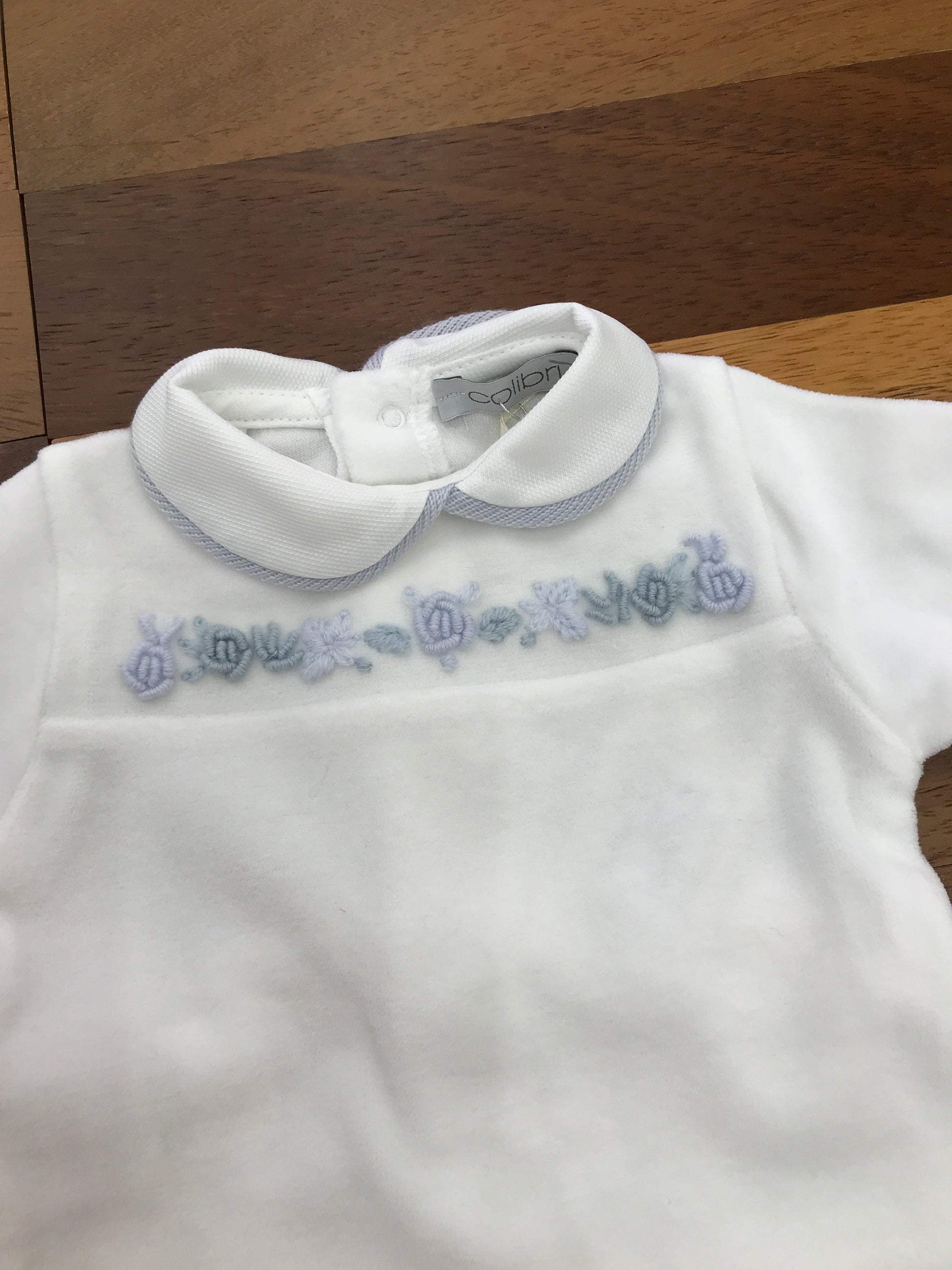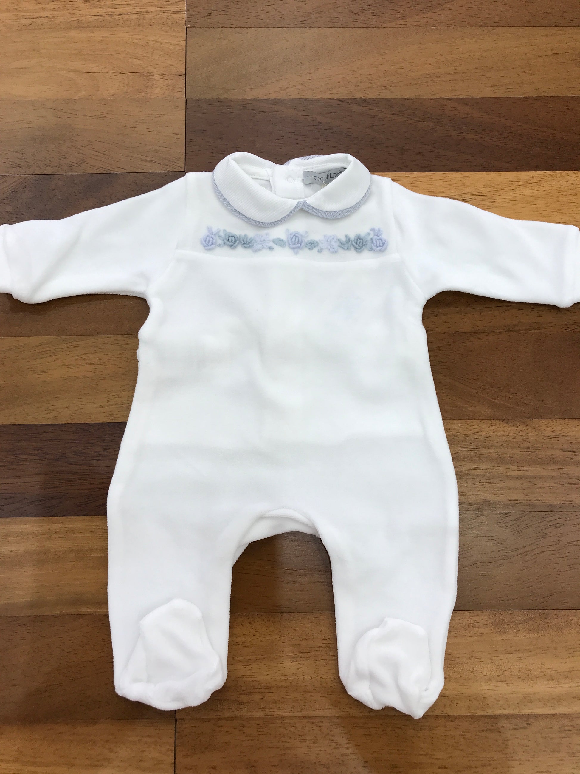 Intera tutina in ciniglia con piedini integrati e colletto rifinito in celeste. Al centro del colletto sono ricamati delicati fiorellini in due tonalità di celeste, una più chiara e una più scura, per un dettaglio elegante e raffinato.