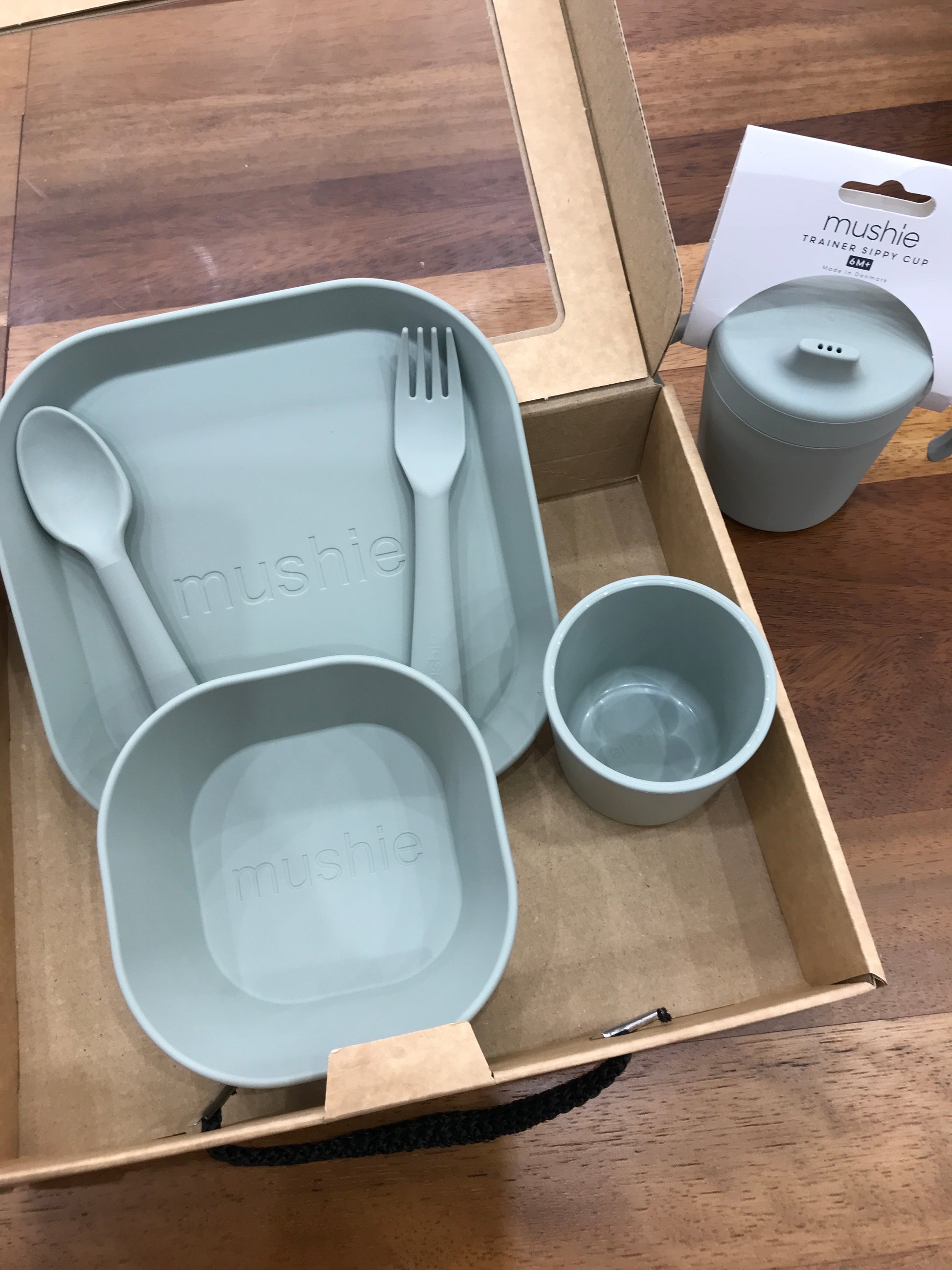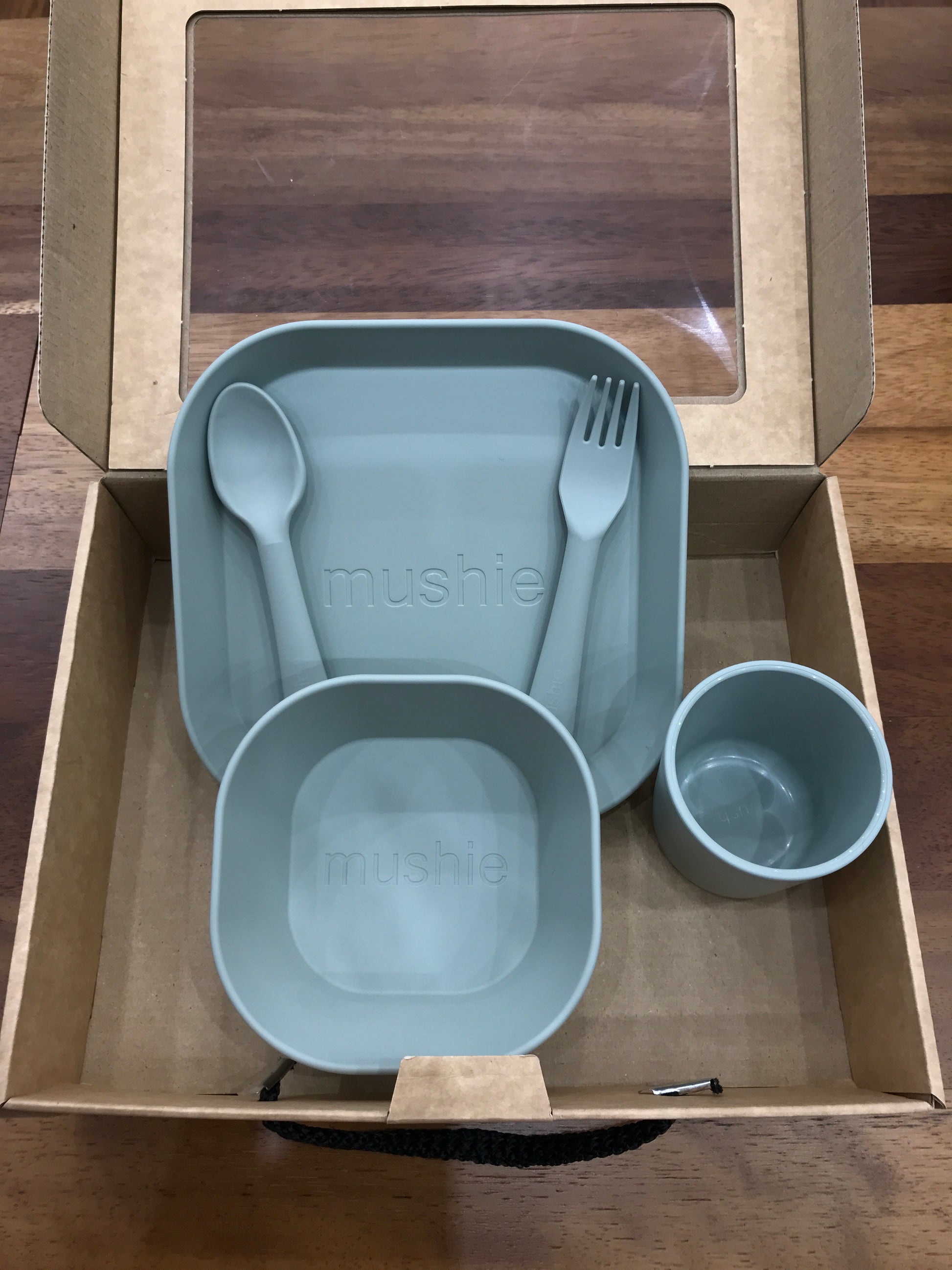 Il set pappa Mushie comprende un cucchiaio, una forchetta, piattini e un bicchiere, progettati per garantire praticità e funzionalità durante i pasti dei più piccoli, offrendo un servizio completo e coordinato per ogni occasione.