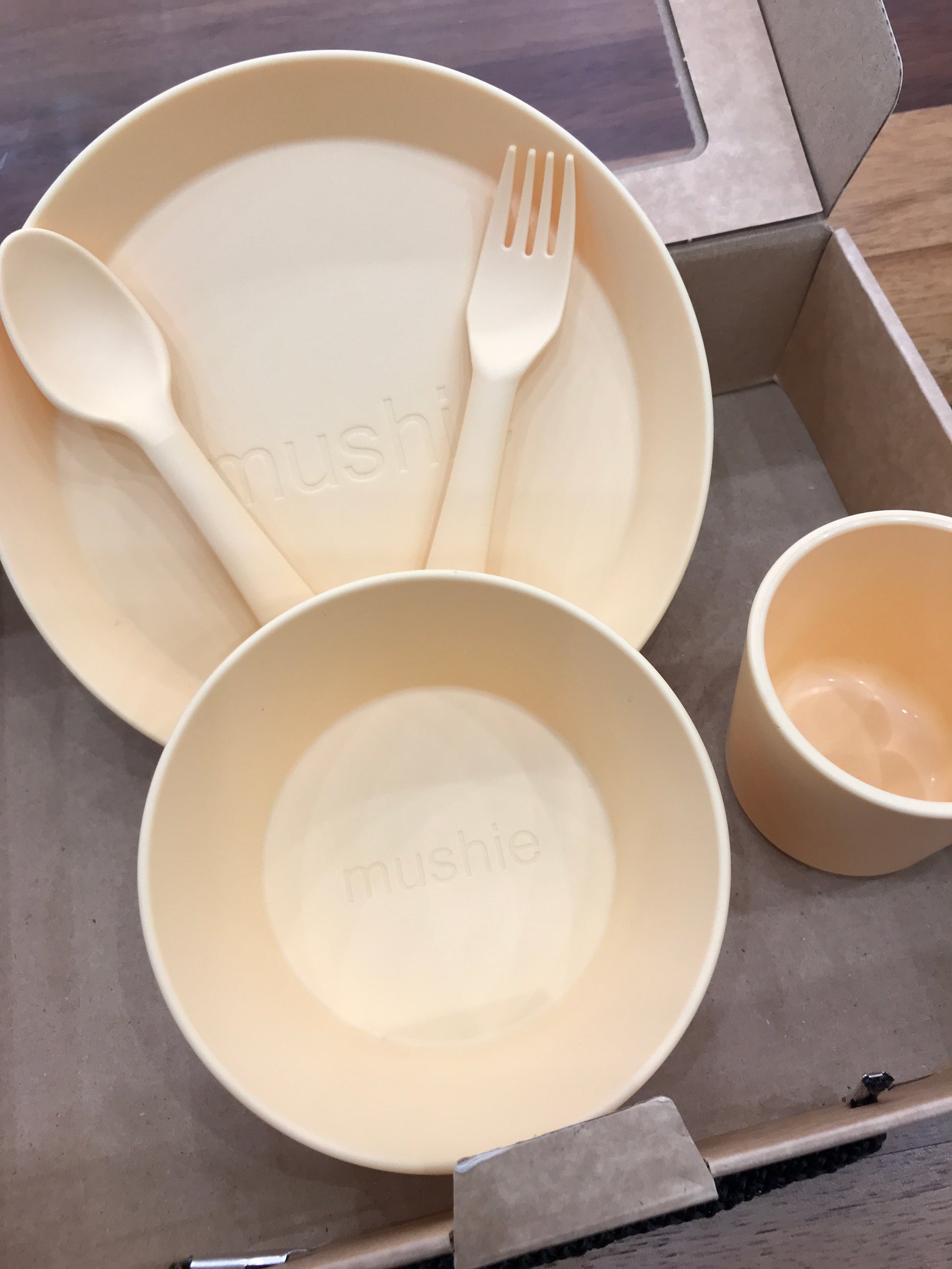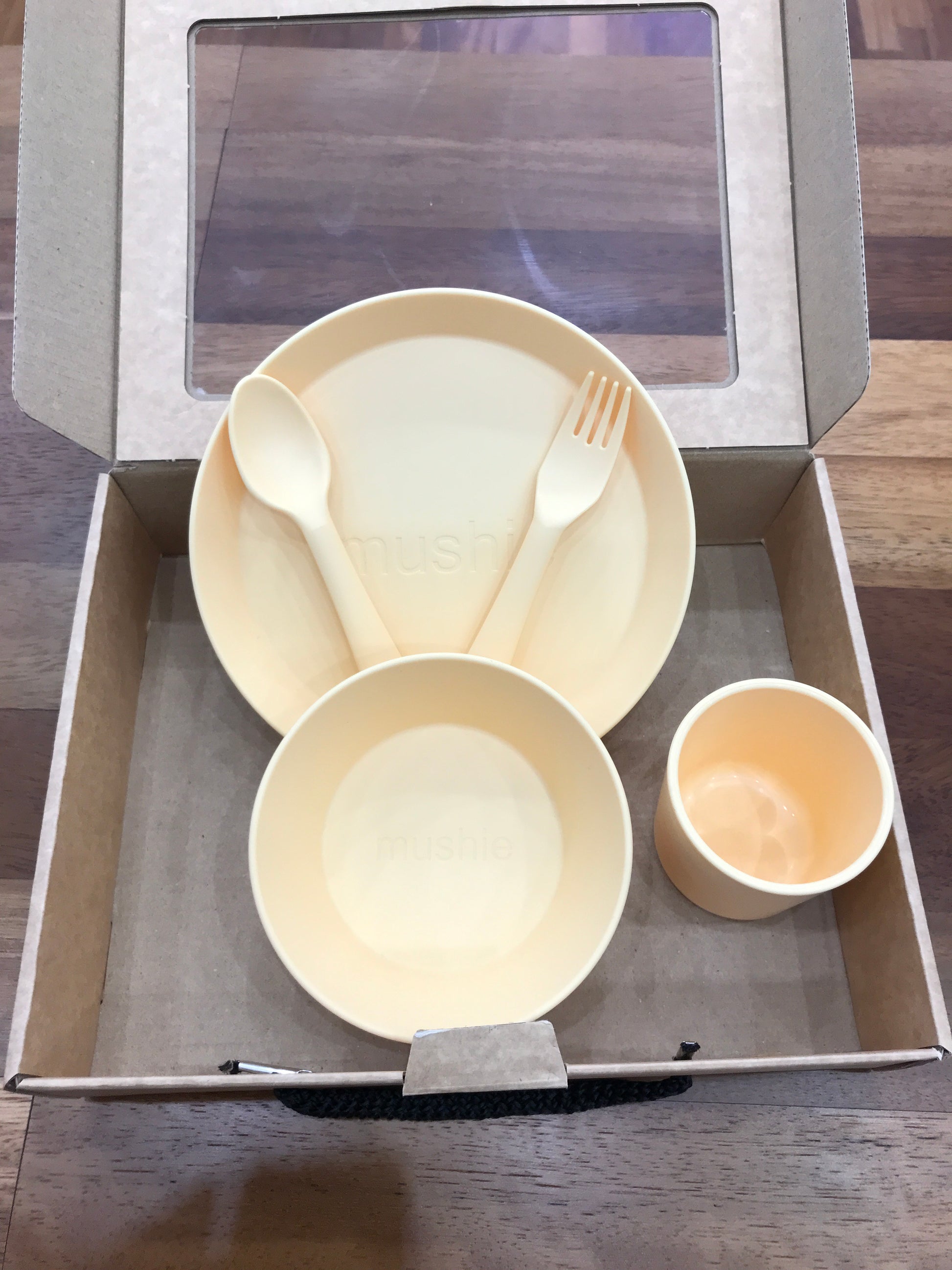 Il set pappa Mushie comprende un cucchiaio, una forchetta, piattini e un bicchiere, progettati per garantire praticità e funzionalità durante i pasti dei più piccoli, offrendo un servizio completo e coordinato per ogni occasione.