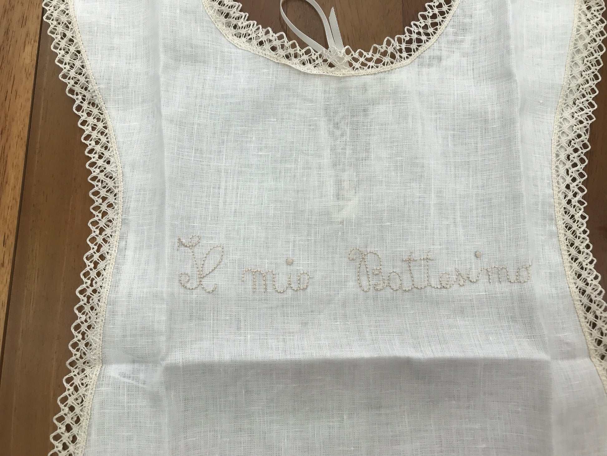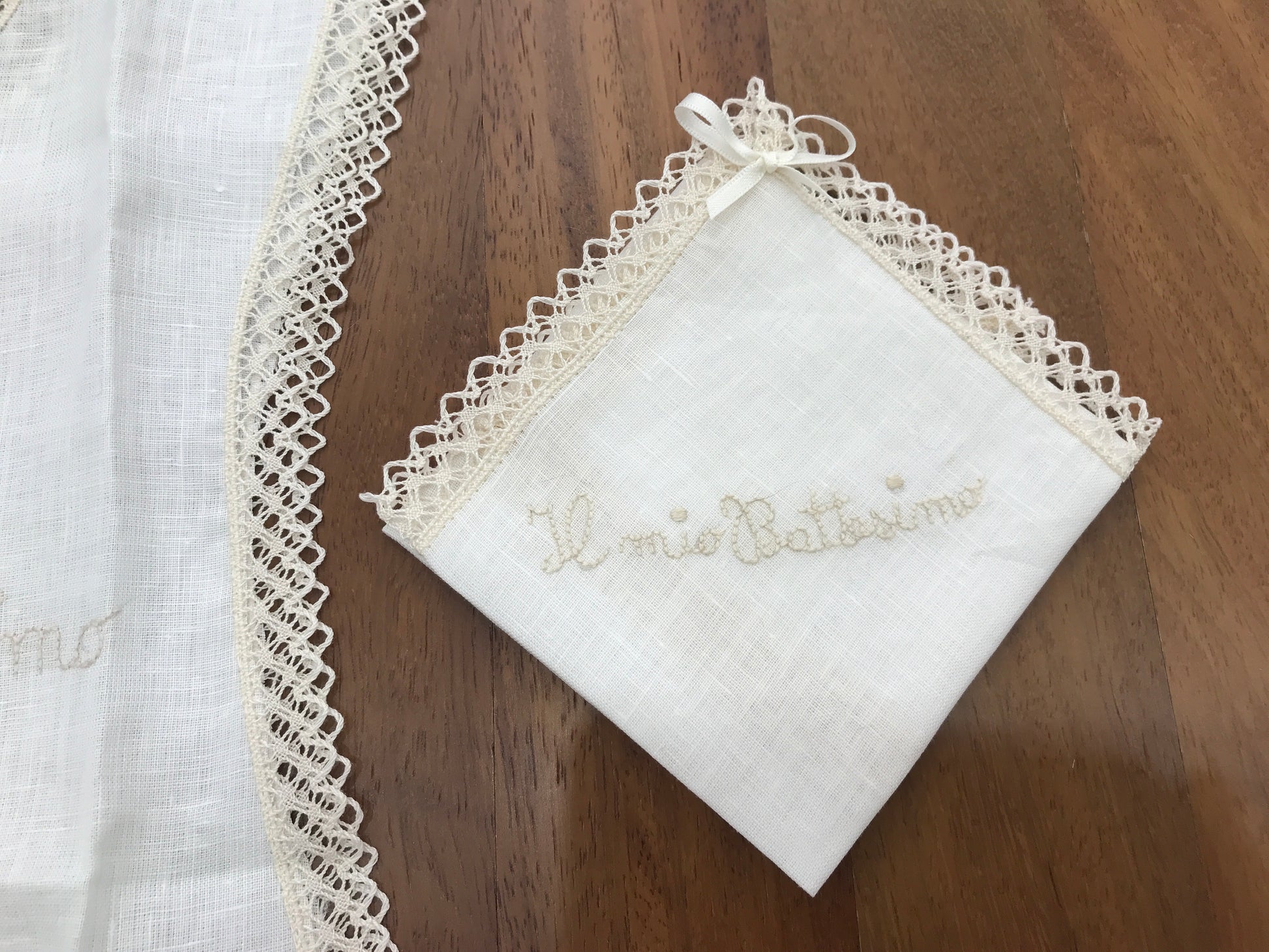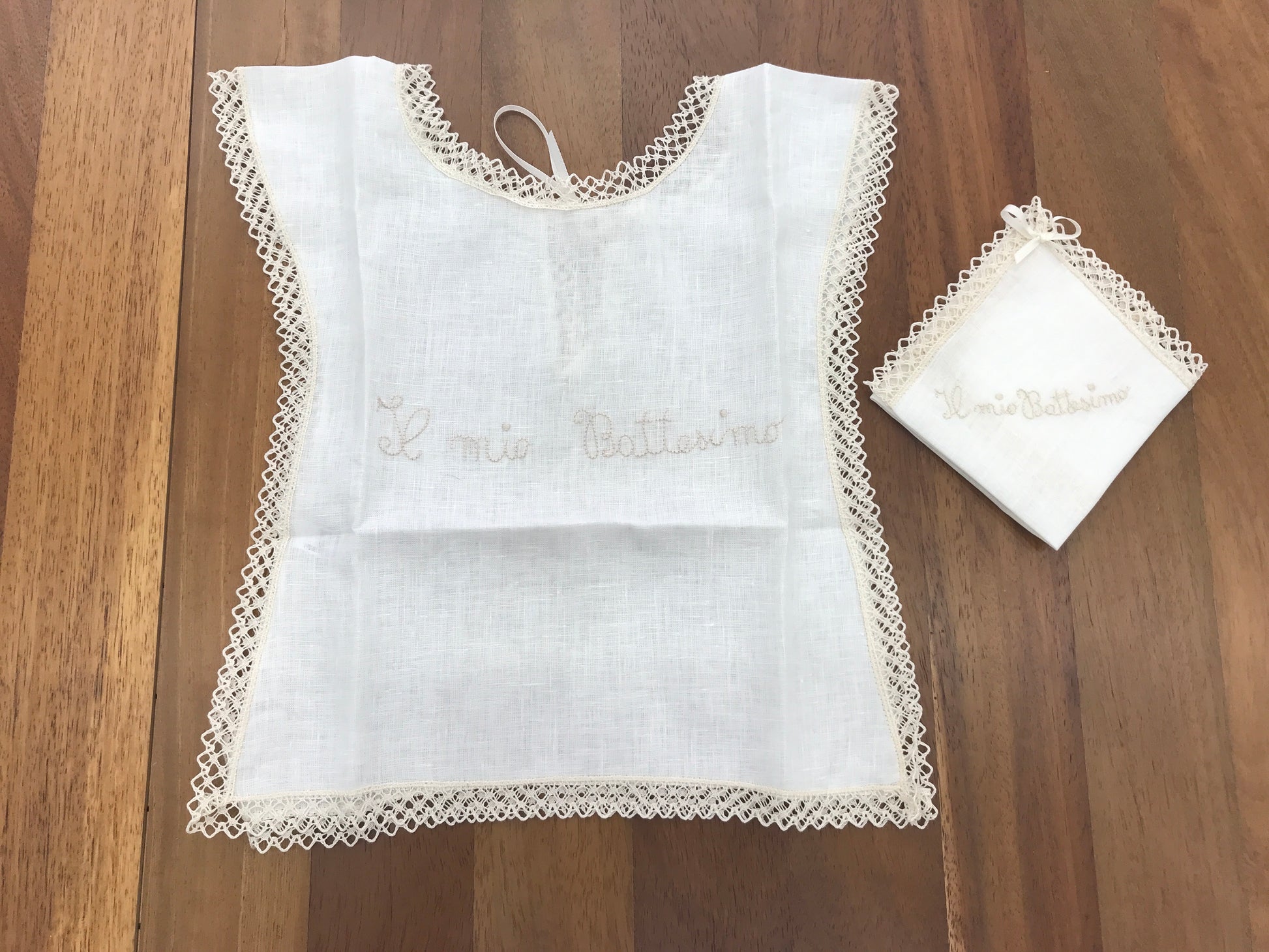 Questa stola battesimale è arricchita da raffinati ricami che decorano con cura i bordi, conferendo un tocco di eleganza senza tempo. Sul davanti è impreziosita dalla scritta “il mio battesimo” finemente ricamata, simbolo di un momento speciale. Include inoltre un fazzoletto abbinato, ideato per asciugare delicatamente la testa del bambino o della bambina durante la cerimonia, anch’esso ornato da dettagli ricamati e dalla dicitura “il mio battesimo”. Un accessorio pensato per accompagnare con stile e significato questo evento importante.