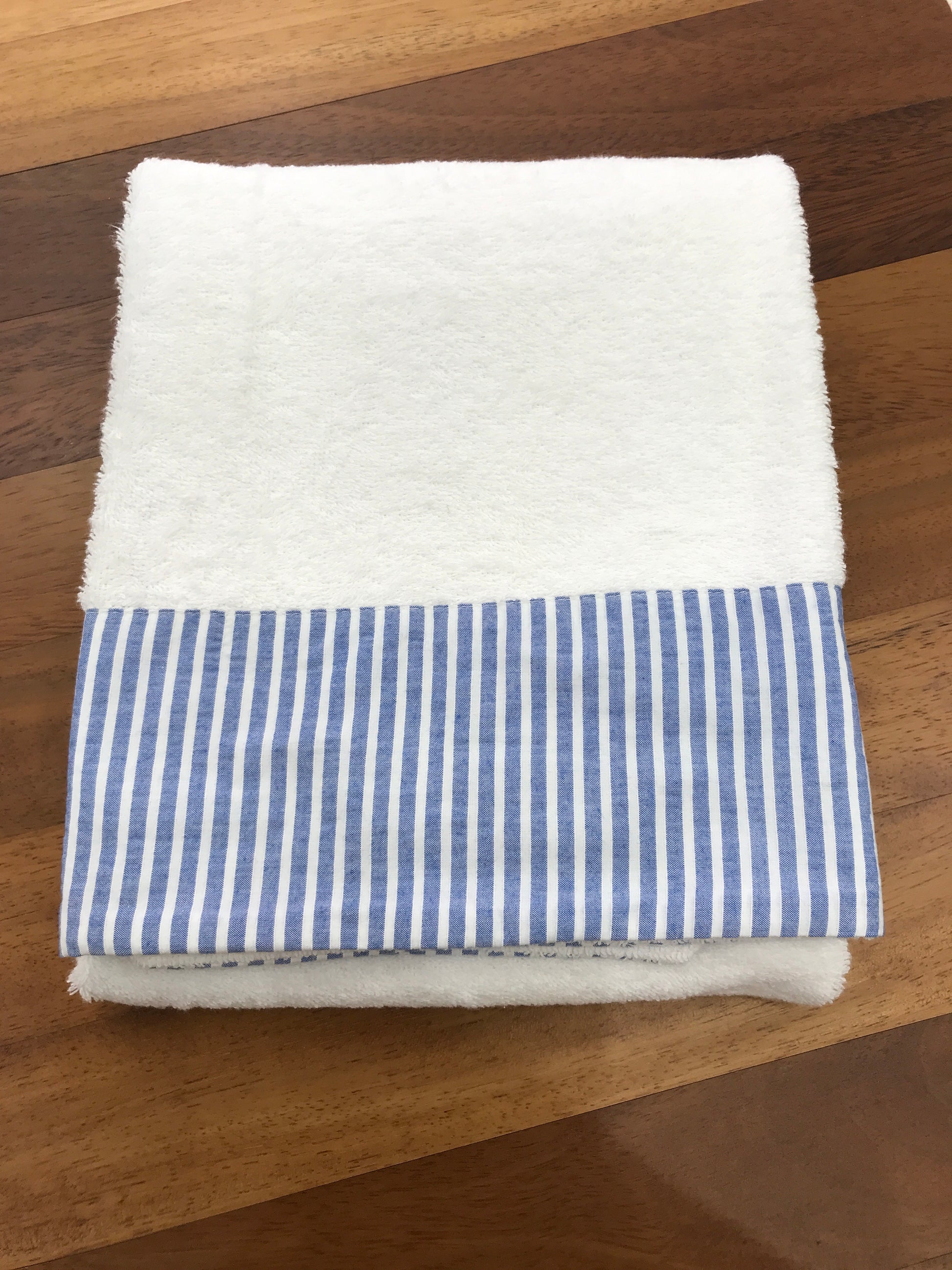 Telo mare in soffice spugna arricchito da un bordo azzurro decorato con sottili righe bianche, che unisce funzionalità e stile per un comfort ottimale durante le giornate in spiaggia.
