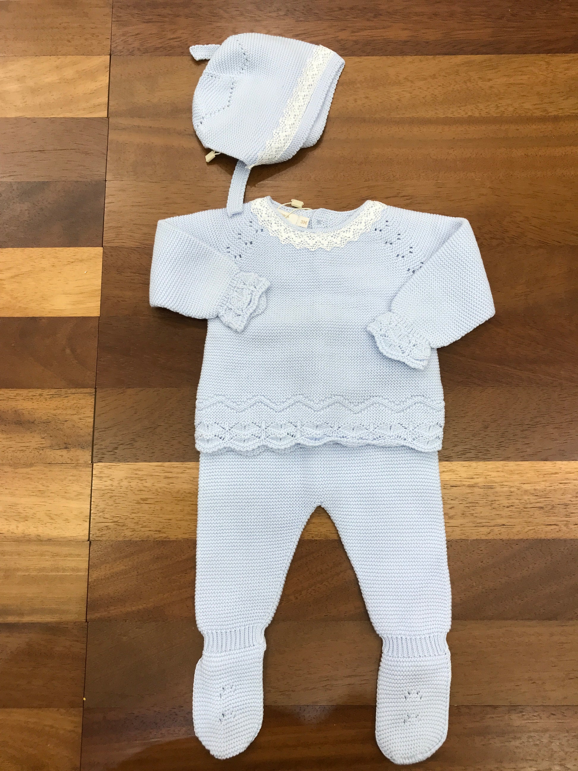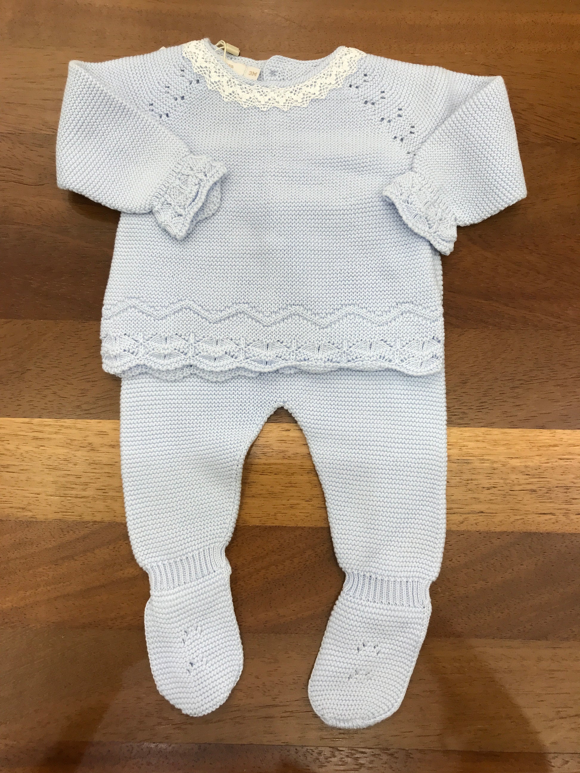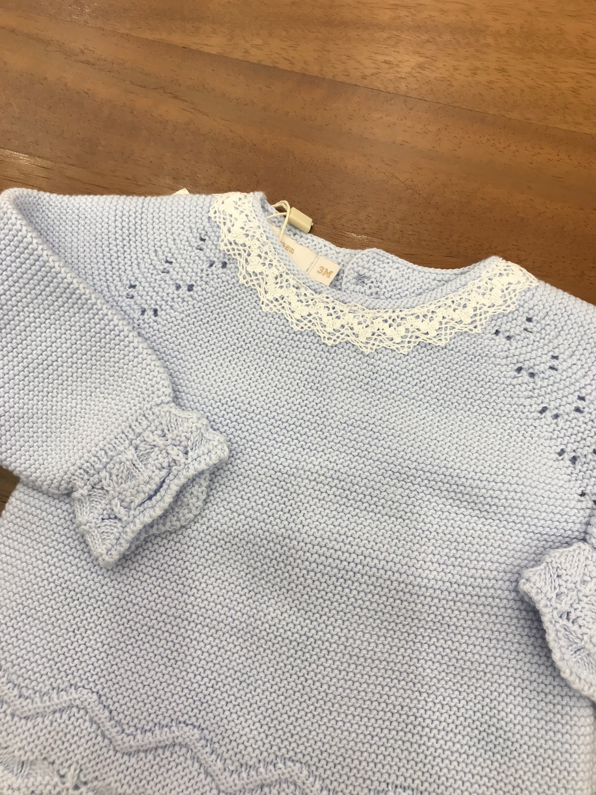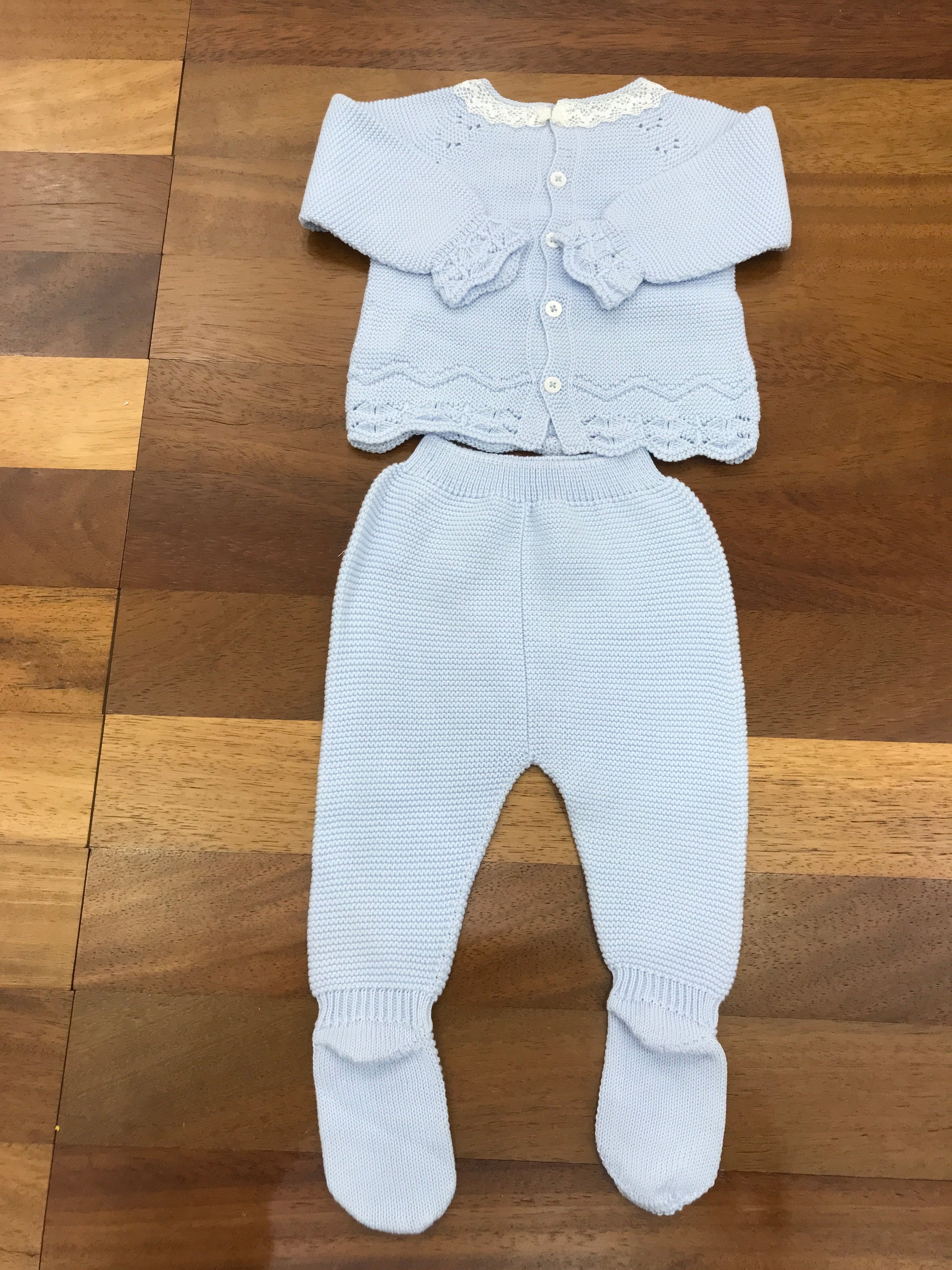 Completo in due pezzi realizzato in celeste, caratterizzato da una salopette con piedini integrati e una maglietta coordinata che presenta delicate rusche bianche sul colletto, per un look raffinato e pratico.