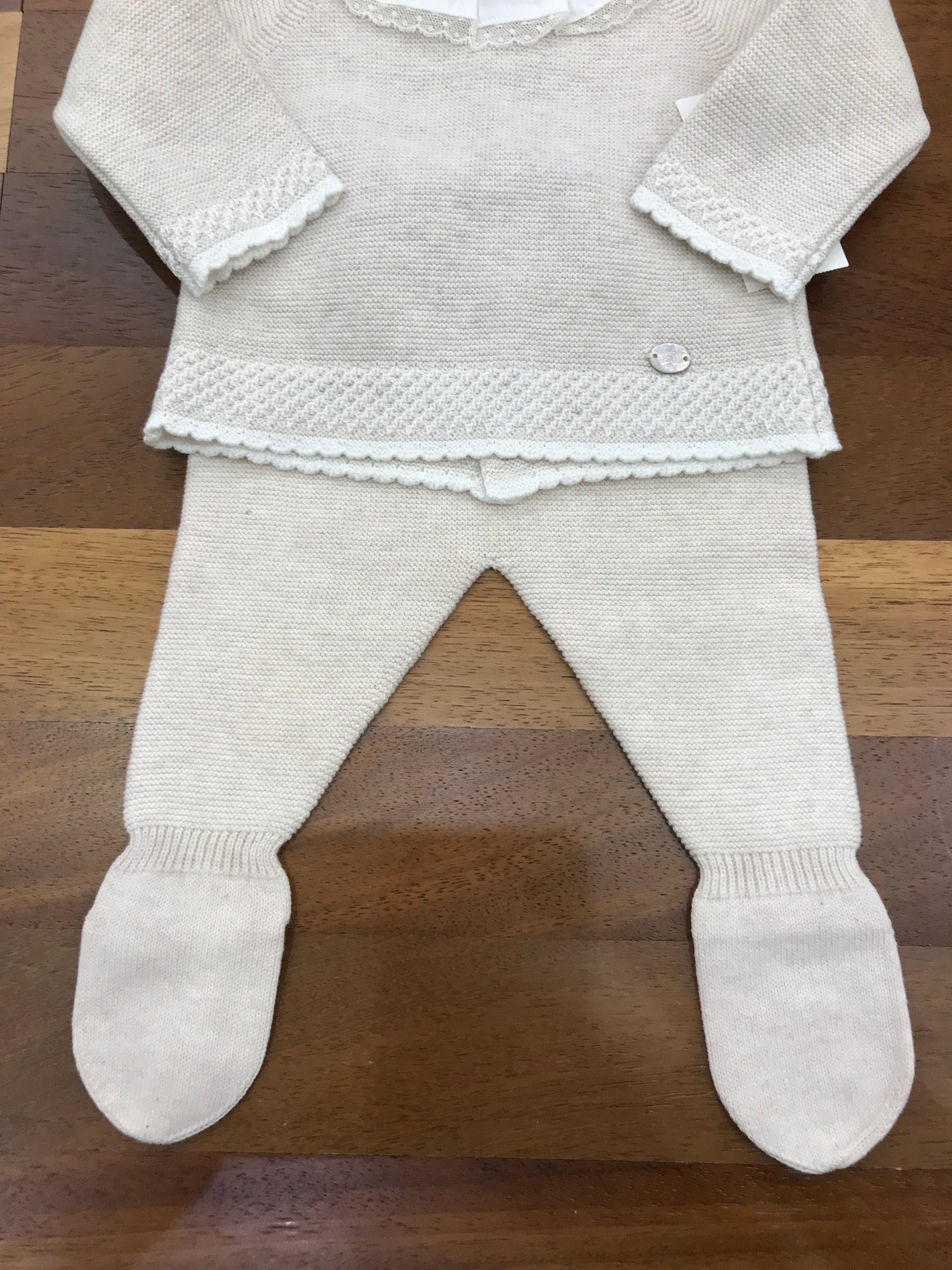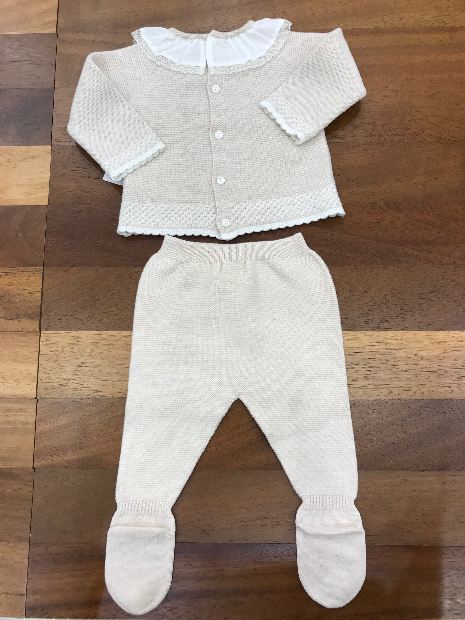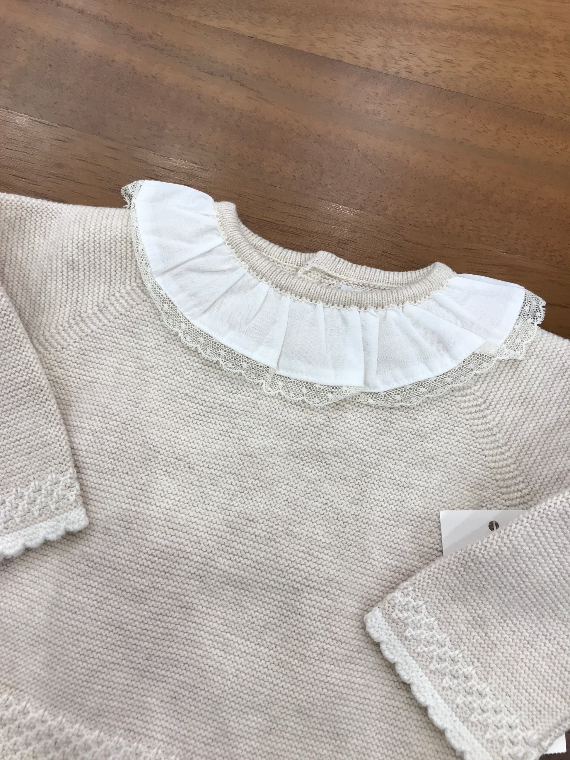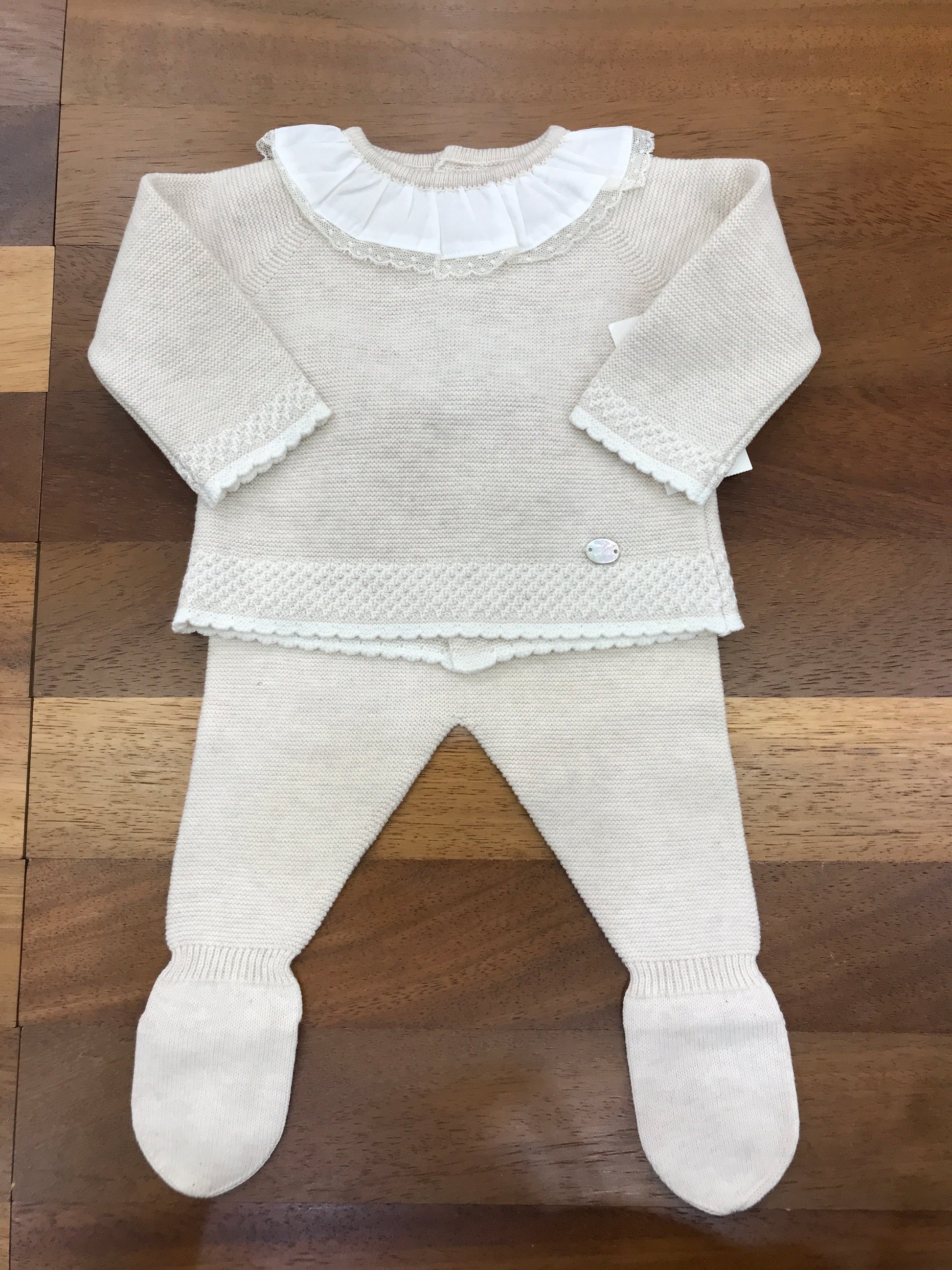 Elegante tutina in cotone tonalità beige, caratterizzata da un raffinato colletto arricchito da volant. I polsini delle maniche presentano dettagli decorativi ricercati, mentre il pantalone è completato da pratici piedini integrati. Un capo versatile e sofisticato, ideale per occasioni speciali e momenti di comfort.