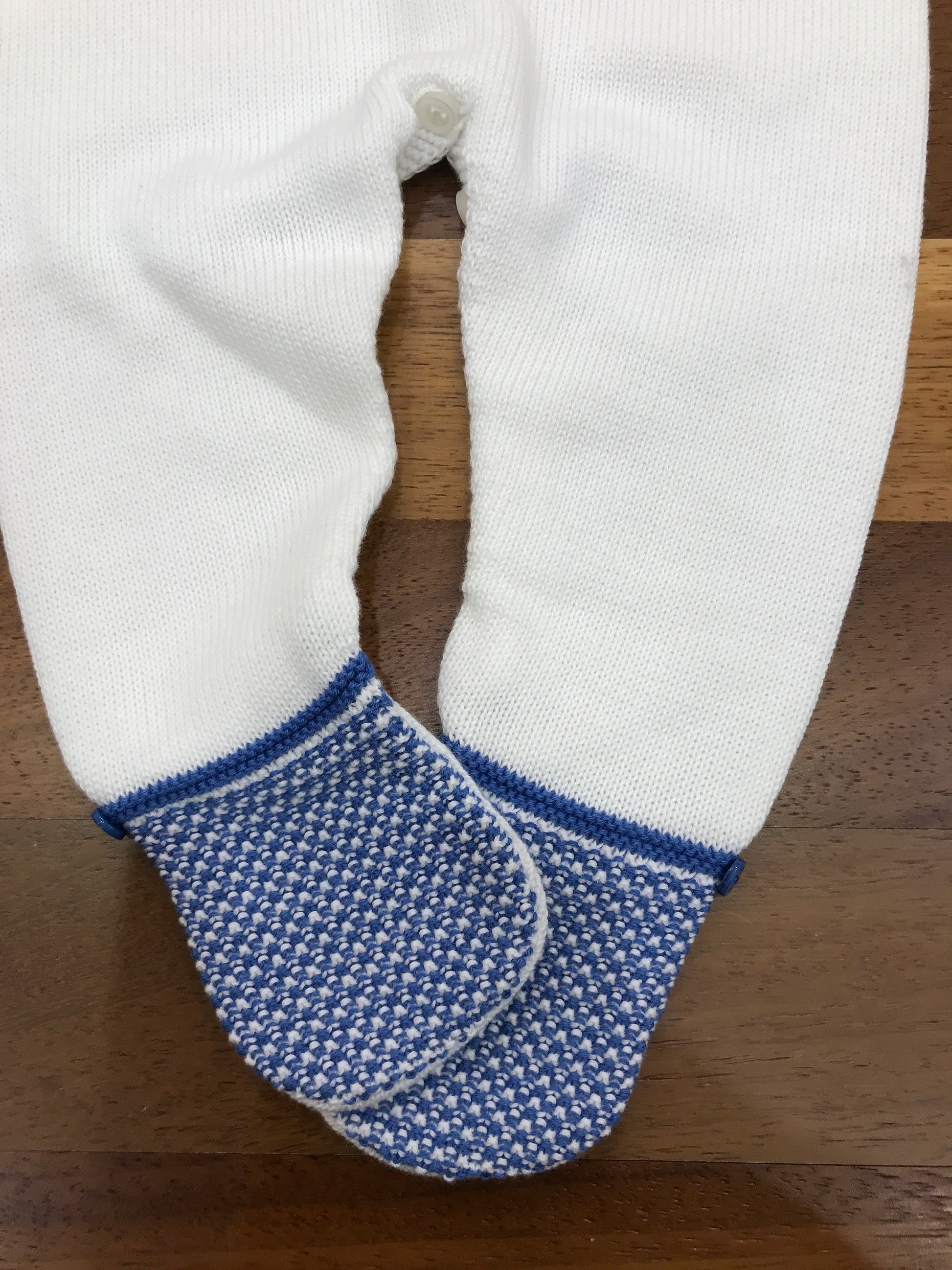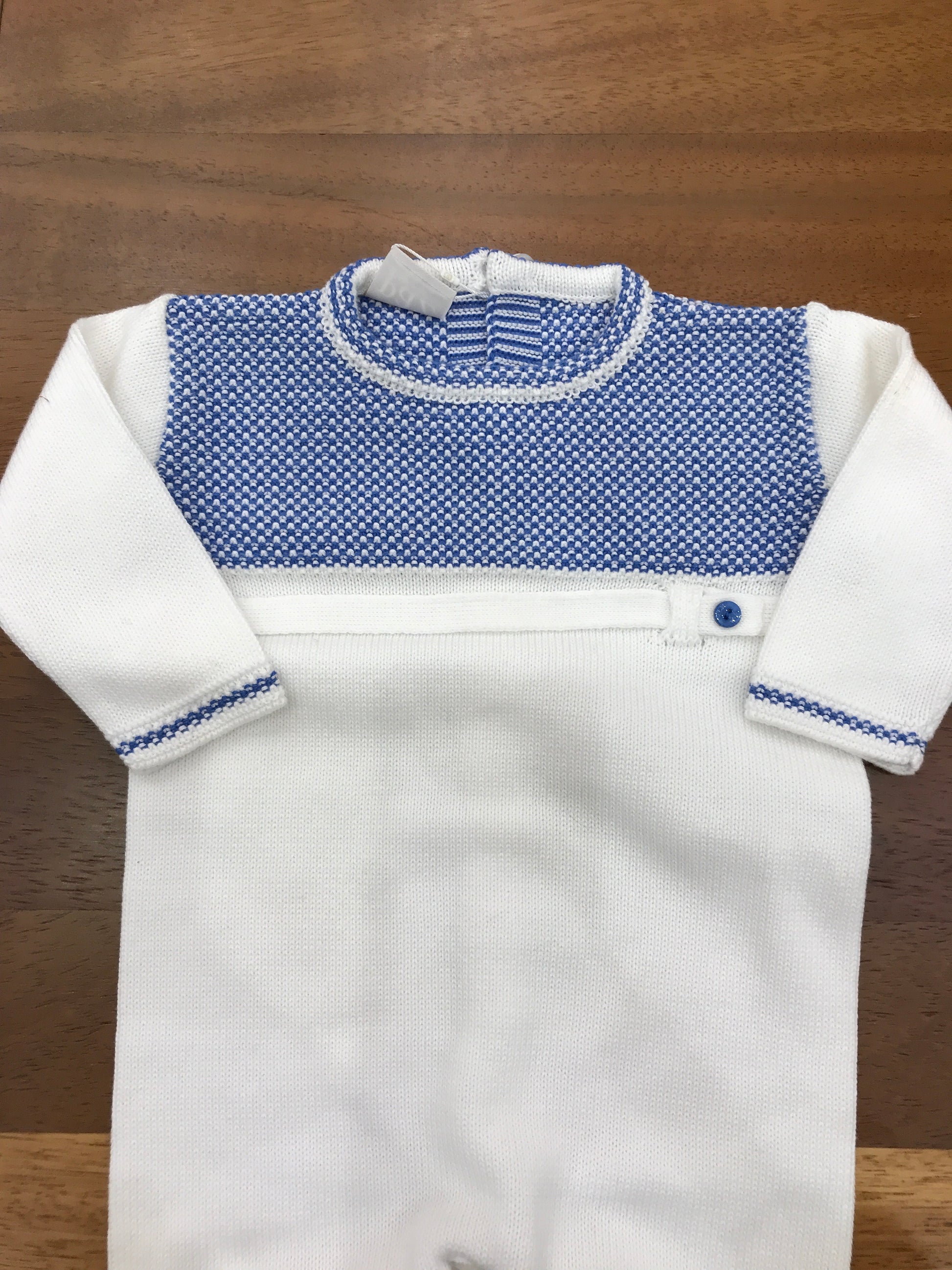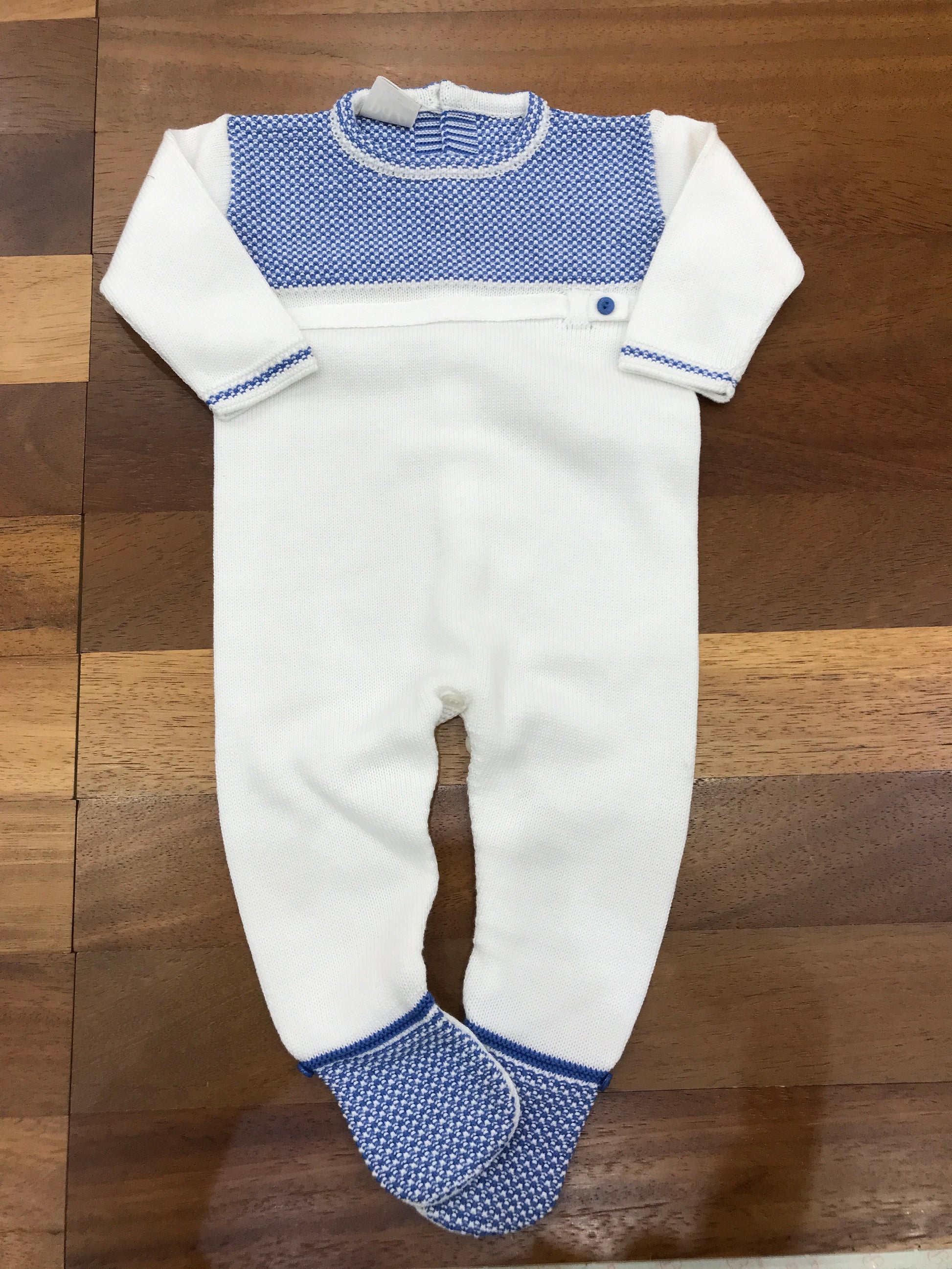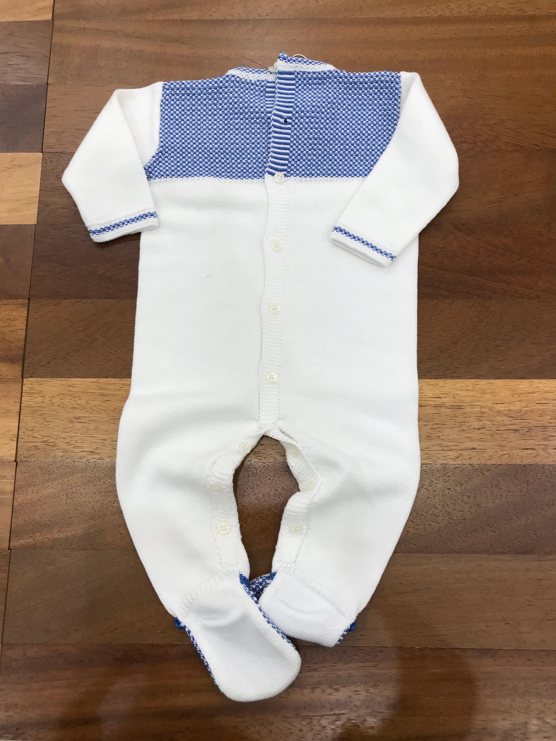 Tutina intera realizzata in pregiato filato di cotone, caratterizzata da piedini integrati e dettagli lavorati in blu che impreziosiscono il petto e la zona dei piedi. Un capo pensato per garantire comfort e praticità nei primi mesi di vita del bambino, unendo funzionalità e stile con eleganti finiture artigianali.