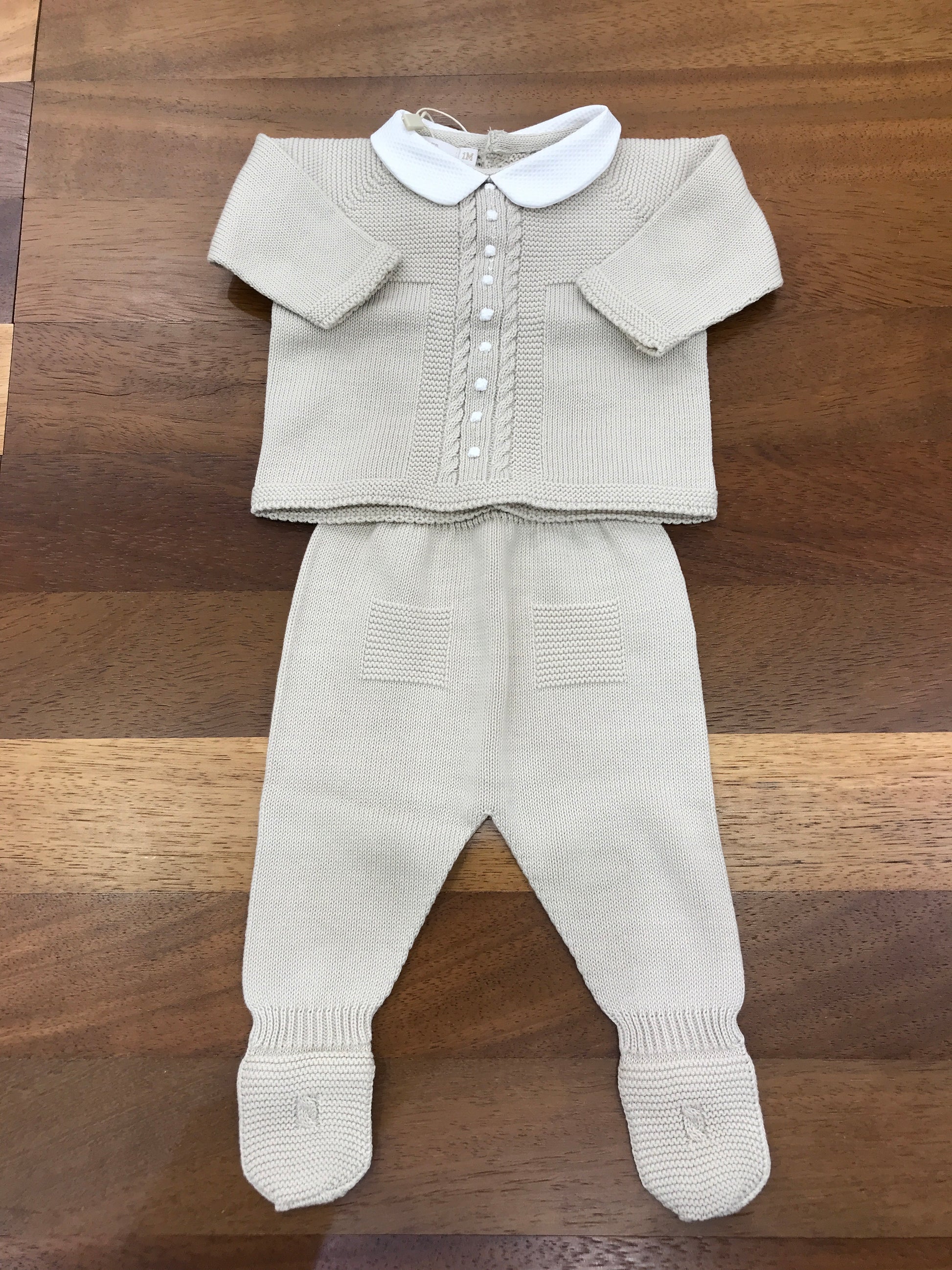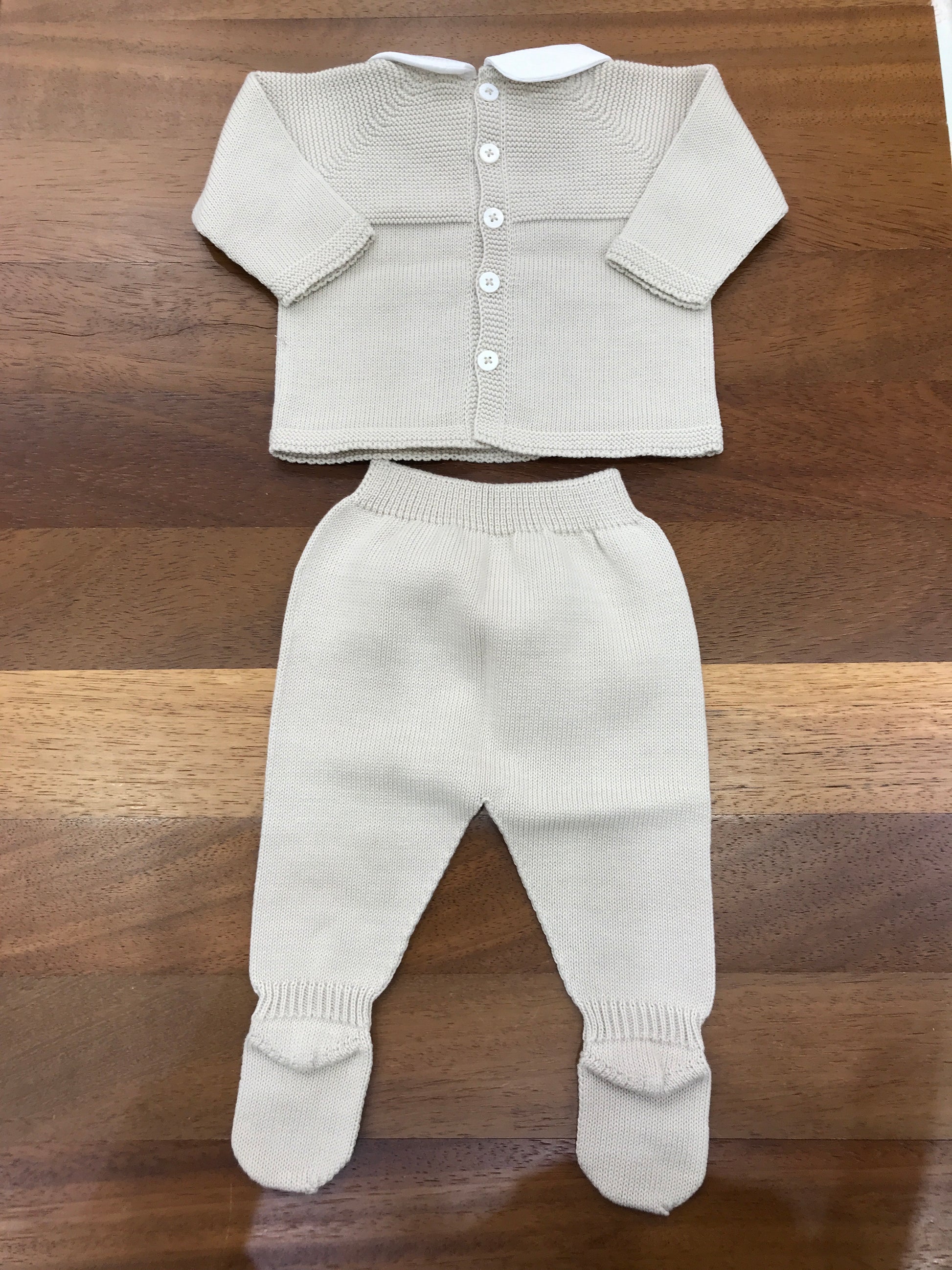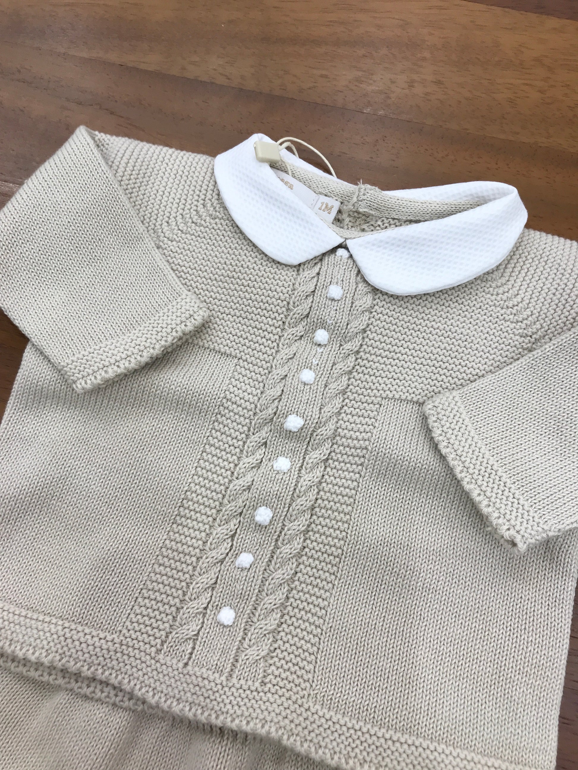 Elegante completo in due pezzi realizzato in beige puro. La parte inferiore presenta pratici piedini, mentre la parte superiore sfoggia un raffinato colletto in piquet e una lavorazione centrale decorativa sul davanti che ne esalta la qualità artigianale e il design sofisticato.