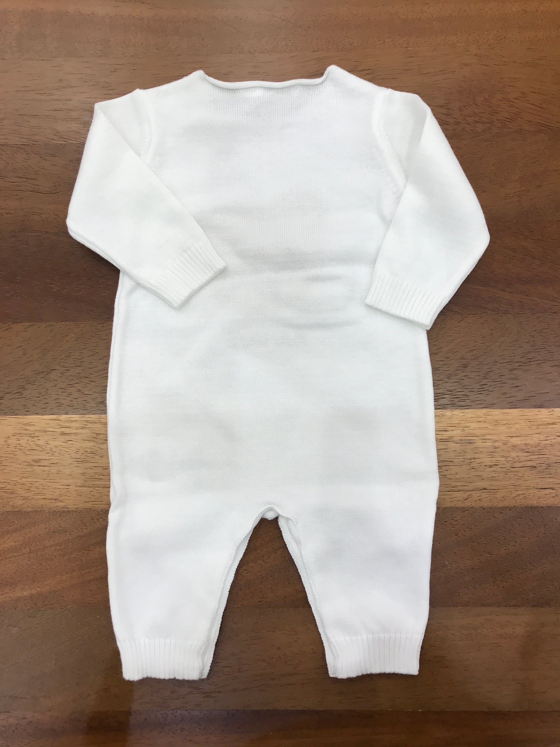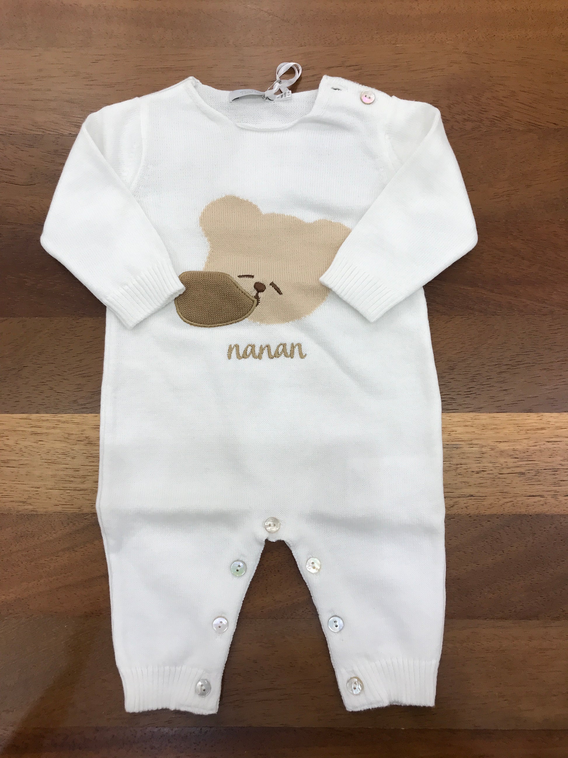 Elegante tutina realizzata in puro cotone, caratterizzata da una tonalità bianca luminosa e impreziosita da un delicato orsetto ricamato al centro. Perfetta per i piccoli, combina comfort naturale con un design raffinato e senza tempo.