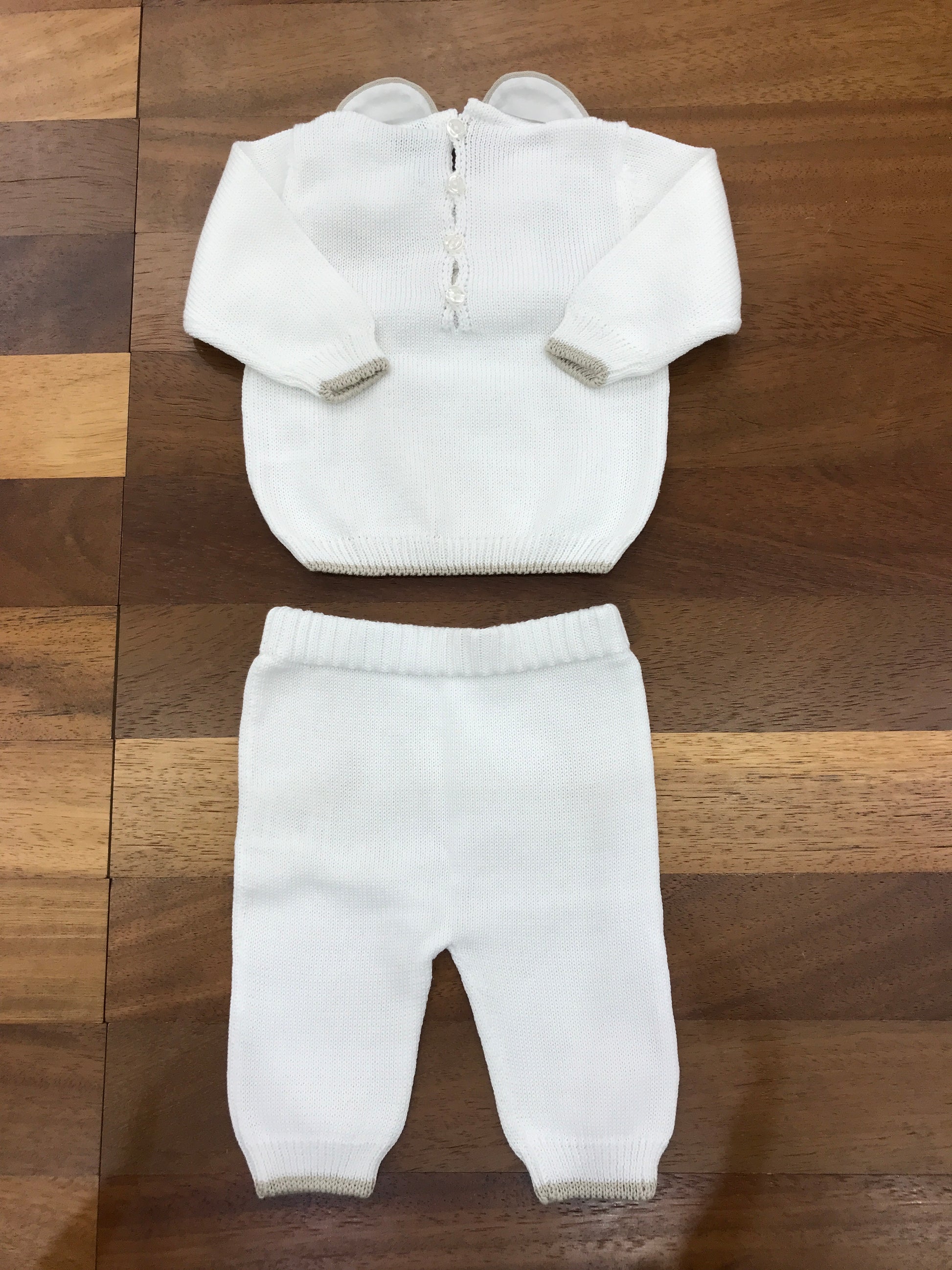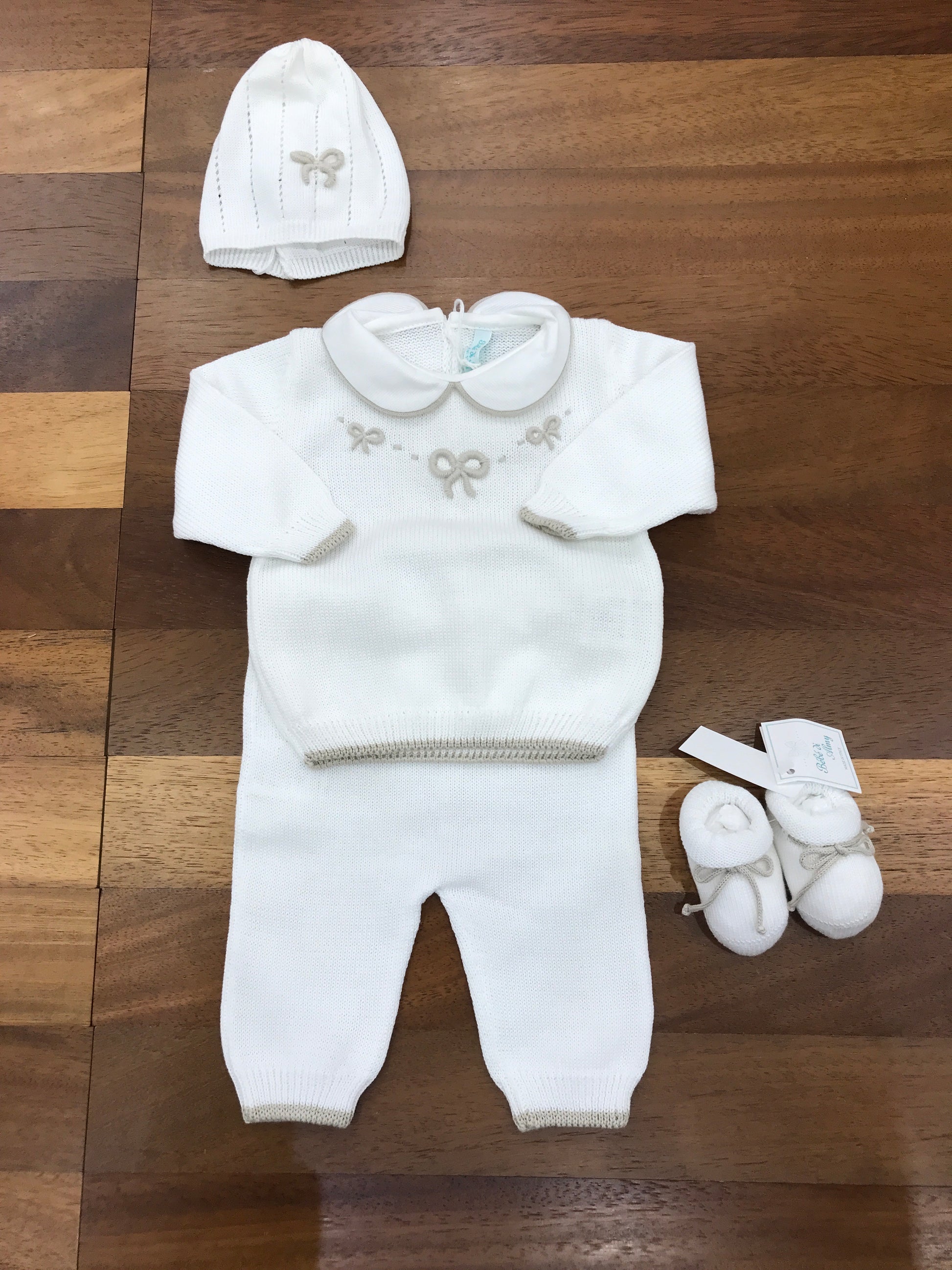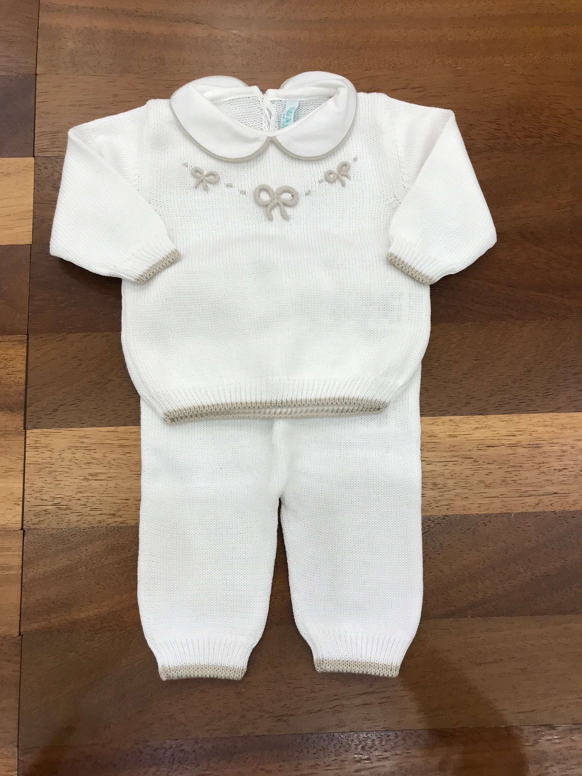Elegante tutina in filo per neonato, composta da due pezzi coordinati. Il capo inferiore presenta elastico in vita per una vestibilità confortevole e sicura, mentre la parte superiore è impreziosita da delicati fiocchetti ricamati a mano in tortora. Dettagli ricamati in tortora completano il design, conferendo al completo un'eleganza sofisticata e raffinata, perfetto per occasioni speciali o per il guardaroba quotidiano del vostro bambino.