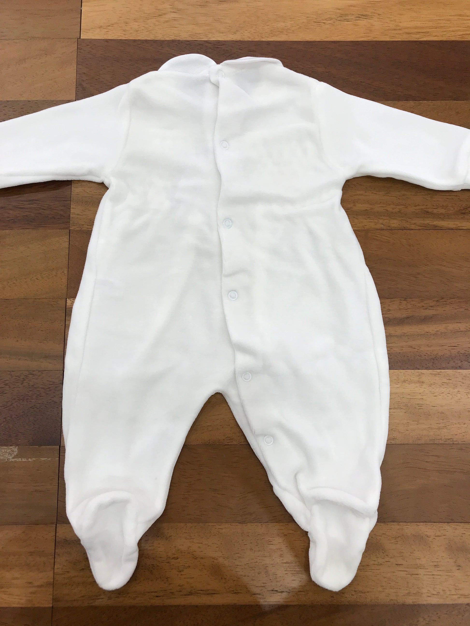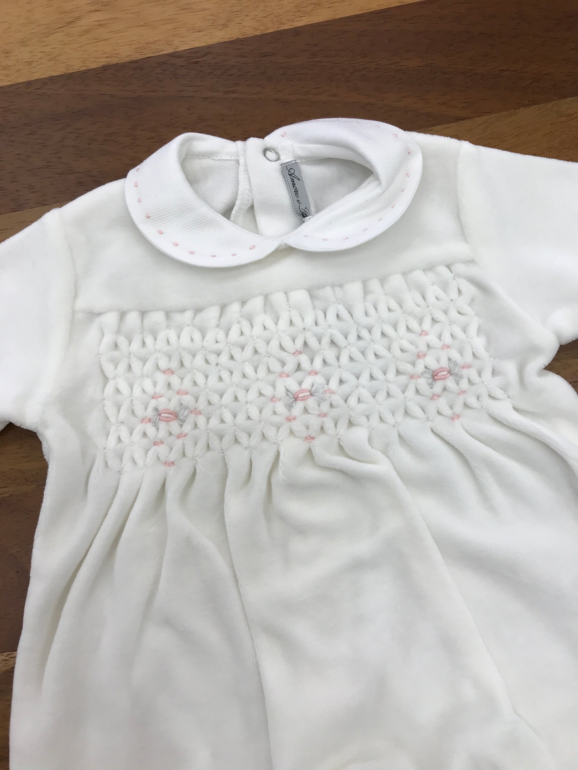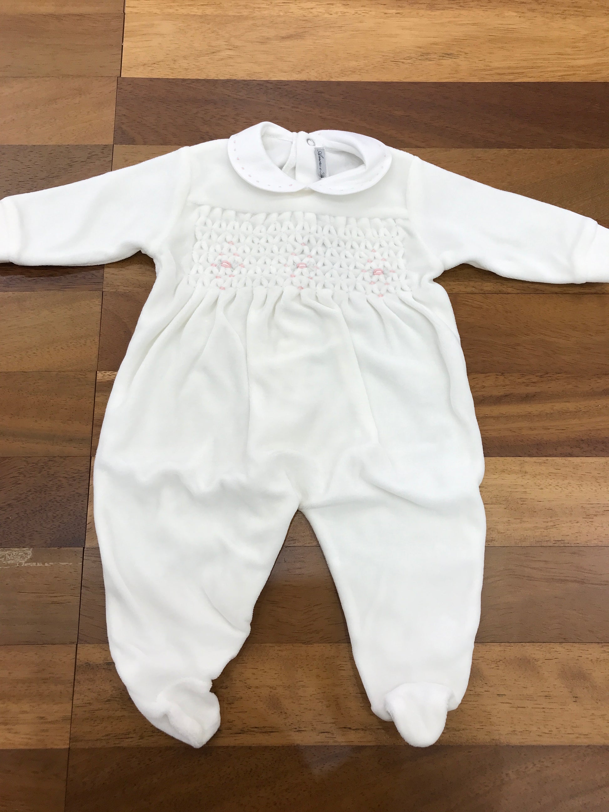 Questa tutina intera in ciniglia, completa di piedini integrati, offre comfort e calore ideali per i più piccoli. Il colletto è impreziosito da una delicata lavorazione rosa che aggiunge un tocco di dolcezza al capo. Sul retro, la chiusura con bottoncini a pressione facilita la vestizione e garantisce una perfetta aderenza. La parte frontale si distingue per una raffinata decorazione a maglia, che unisce estetica e morbidezza, rendendo questa tutina un capo funzionale e allo stesso tempo elegante per ogni occasione.