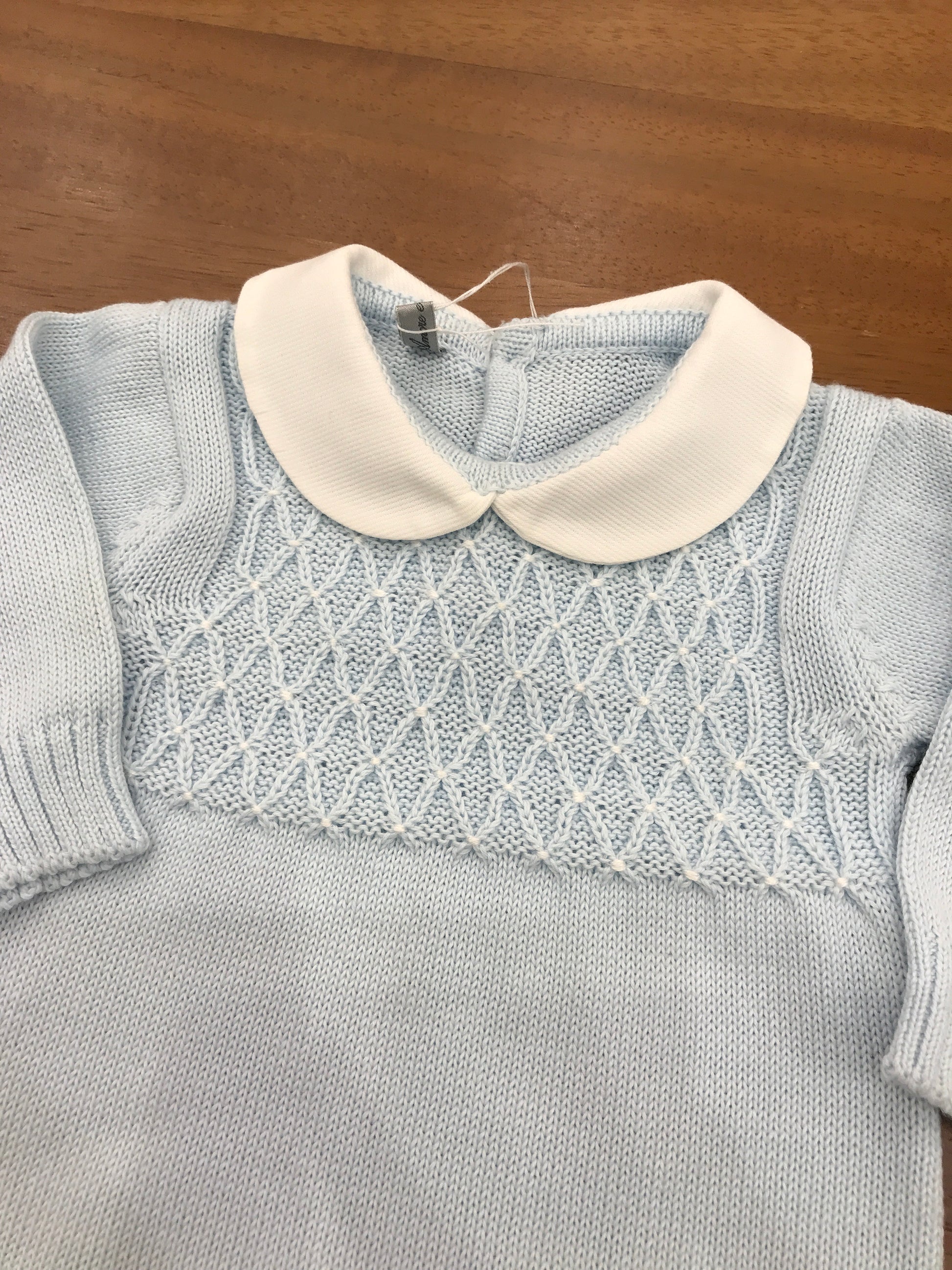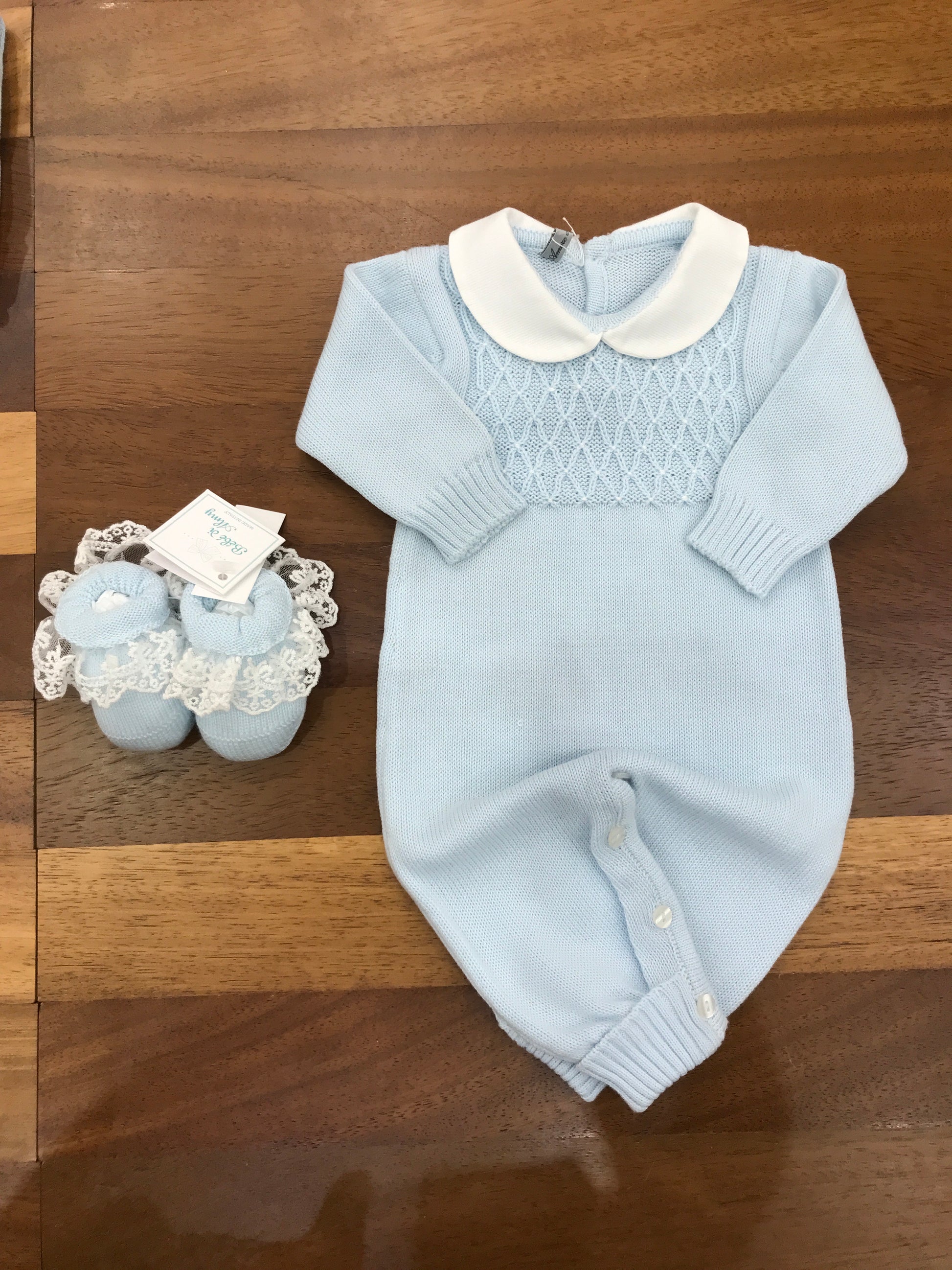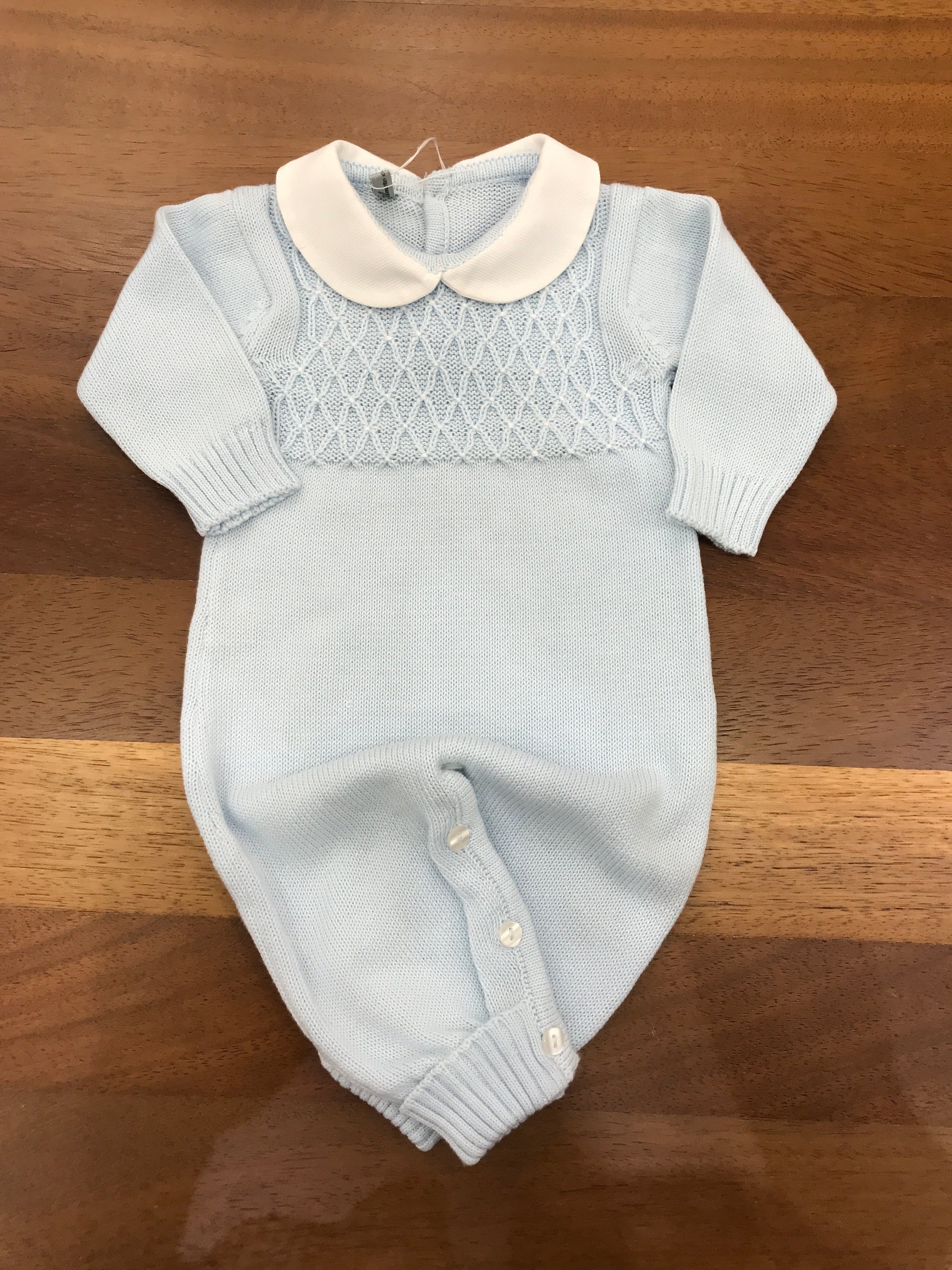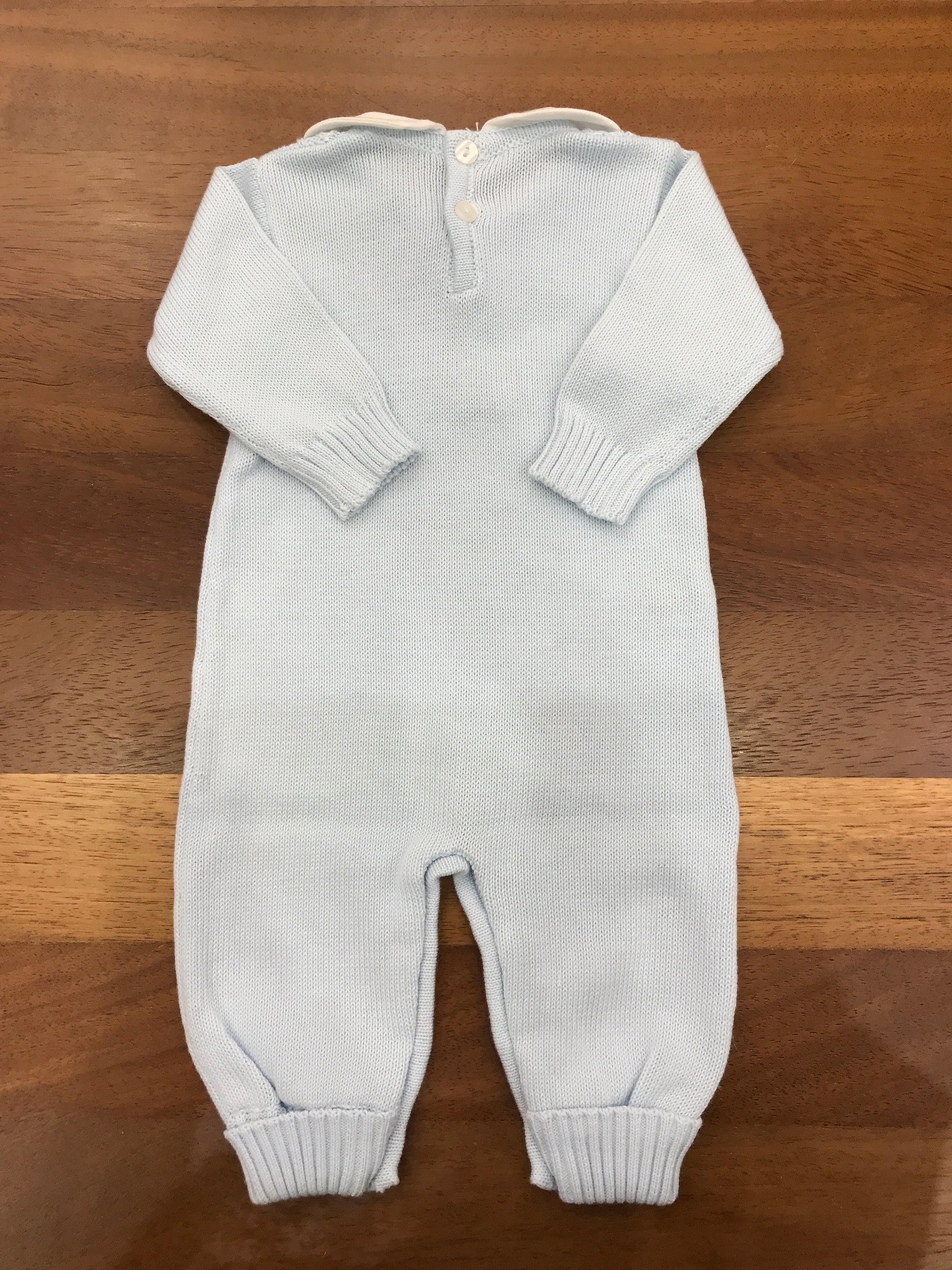 Delicata tutina in filo di cotone nelle tonalità del celeste, caratterizzata da un raffinato punto smock ricamato sul petto che conferisce eleganza e movimento. Il colletto bianco crea un contrasto sobrio e sofisticato, mentre la silhouette senza piedini garantisce praticità e versatilità nel cambio. Un capo essenziale per il guardaroba della piccola, perfetto per occasioni speciali e uso quotidiano.