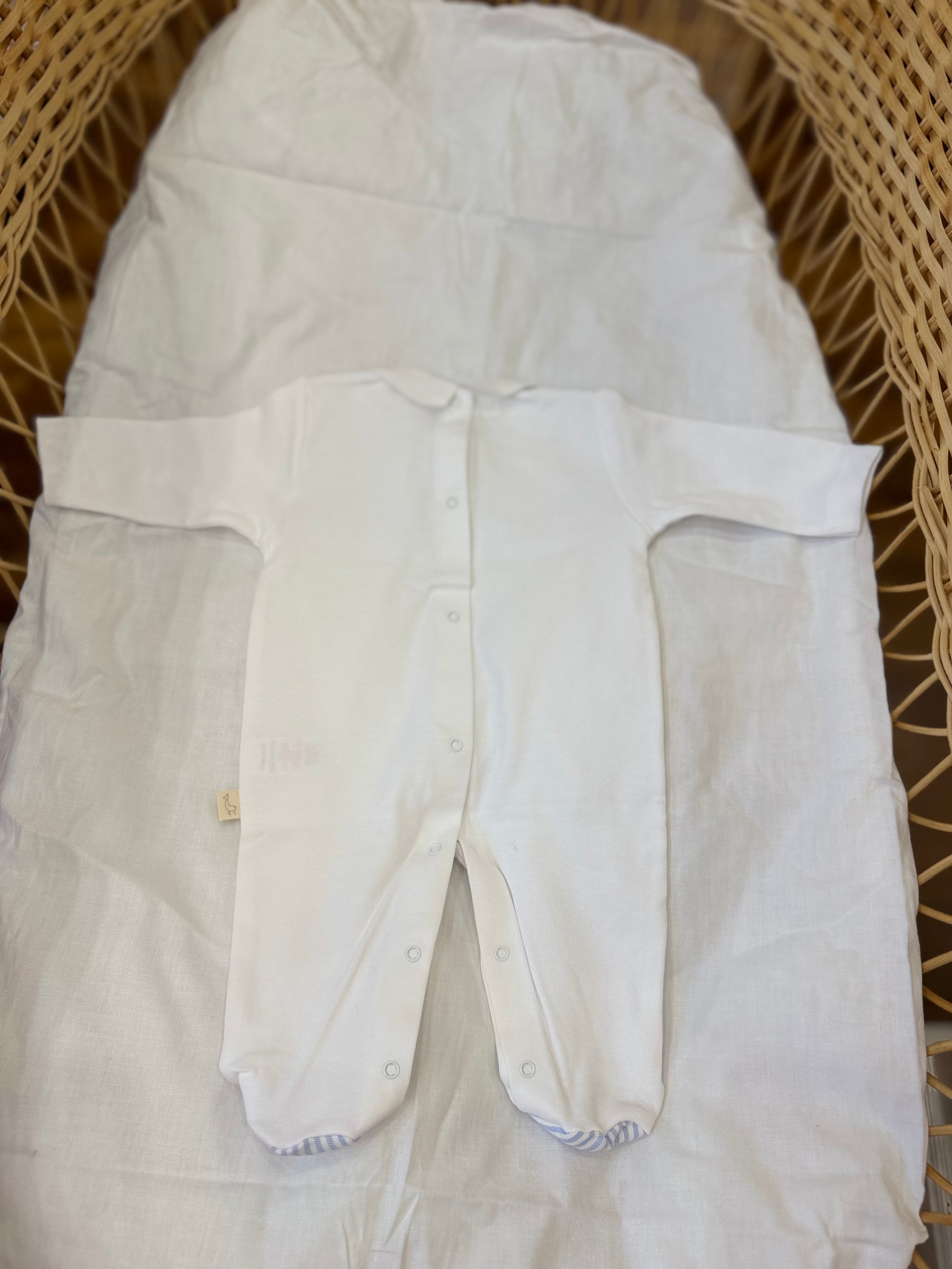 Questa deliziosa tutina in cotone bianco con piedini è ideale sin dai primi giorni. Il corpetto a righe cielo aggiunge un tocco di stile, mentre i piedini mantengono il tuo bambino comodo e al caldo. Perfetta per ogni occasione, per far apparire il tuo piccolo in ogni momento adorabile e alla moda.