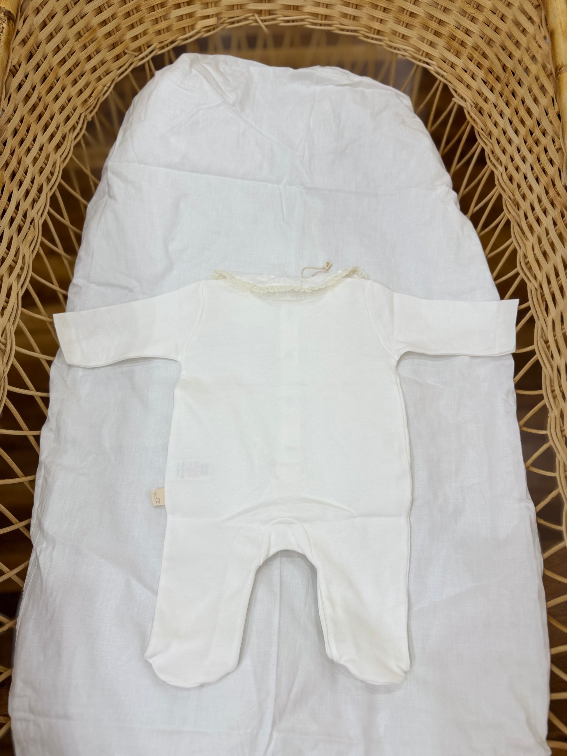 "La Tutina Baby gì è un must-have per il tuo neonato. Realizzata in morbido cotone beige, con piedini e un elegante collo tondo con rouches in pizzo panna, è perfetta come sua prima tutina da portare in clinica , sia che sia maschietto o femminuccia .Regala al tuo bambino comodità e stile sin dai primi giorni."